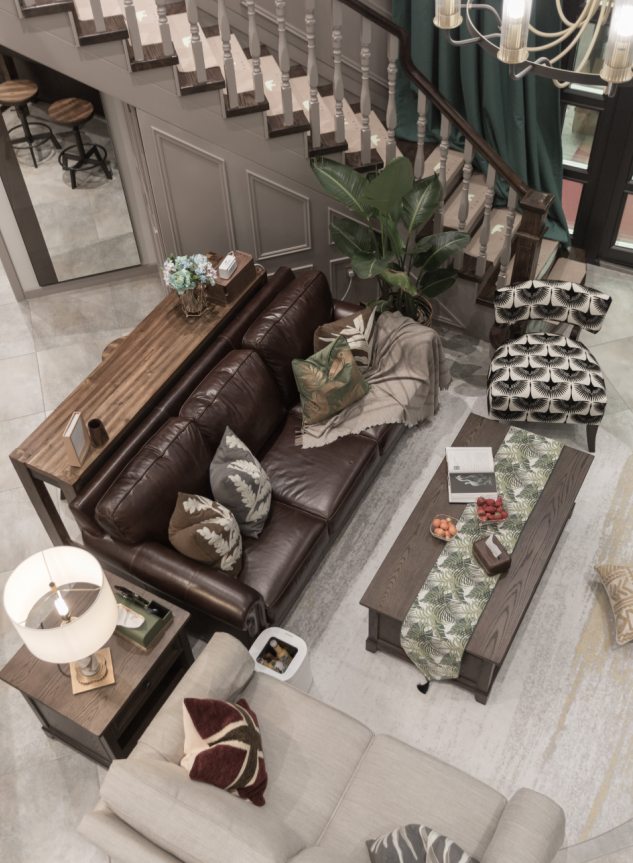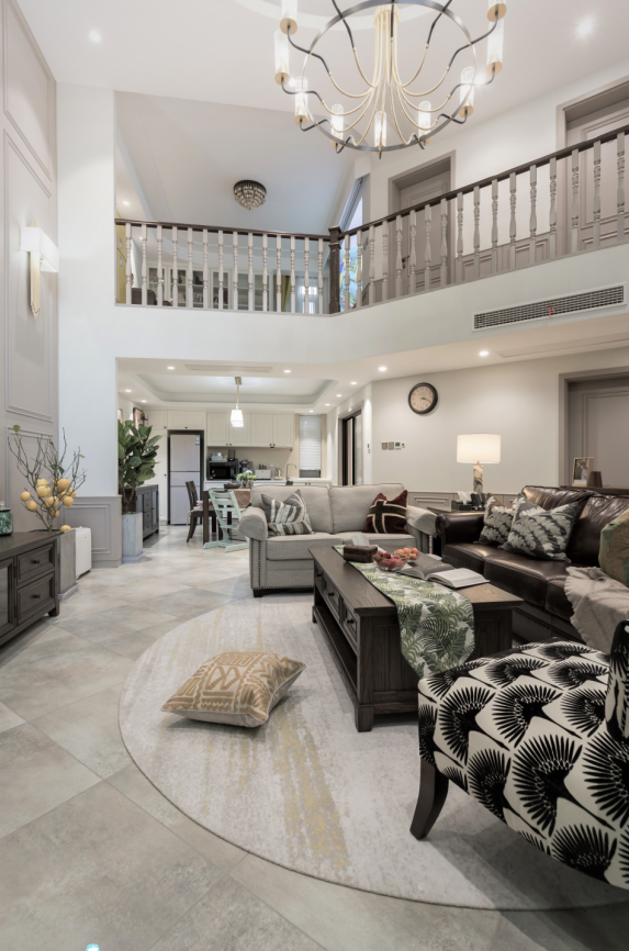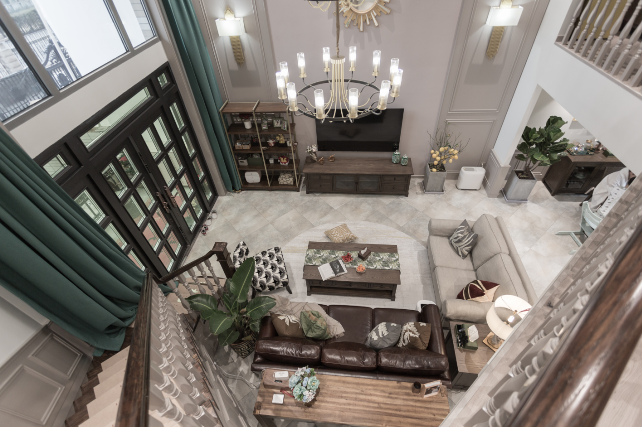 【实景拍摄】俯视客厅的实景照片。整个空间围和感很强。主体家具的重色点缀让空间更沉稳。三层大吊灯,自身有黑色金色的搭配,让时尚感与华贵感并存。