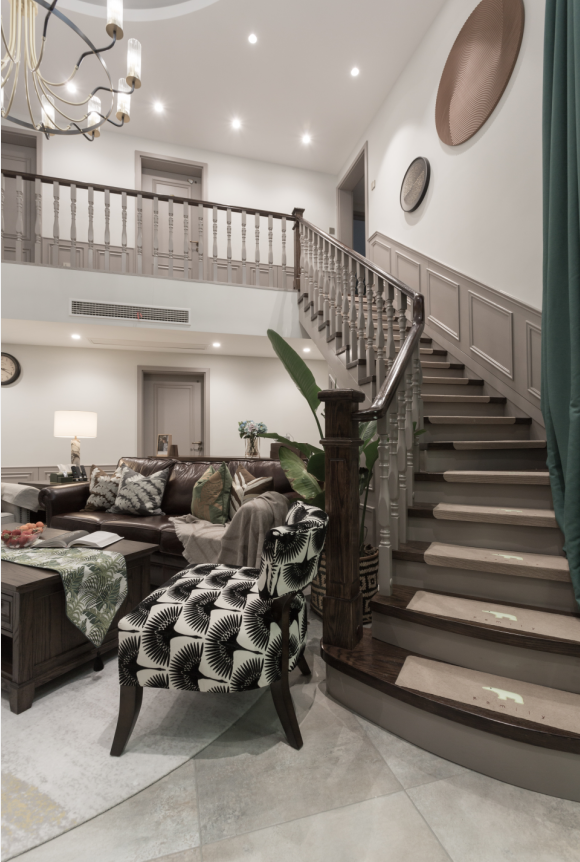 【实景】新美式大宅,护墙板还是必不可少的,色彩上没有使用传统的白,为了空间整体品质感突出。整体木门、踢脚线,护墙板、楼梯小柱,楼梯立板,背景墙,均统一做了同一个颜色,高级感十足的暖灰咖。为控制预算,楼梯跟着门护墙板颜色走了,商家调了几版色终于几乎接近,然后才确定下来。