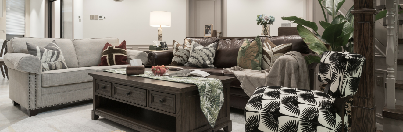 【实景】沙发背景区域的正视角,木咖、暖灰,灰墨绿、灰橙、黑白纹理。共同营造出了稳重,品质,时尚,自由的自然主义空间气质。