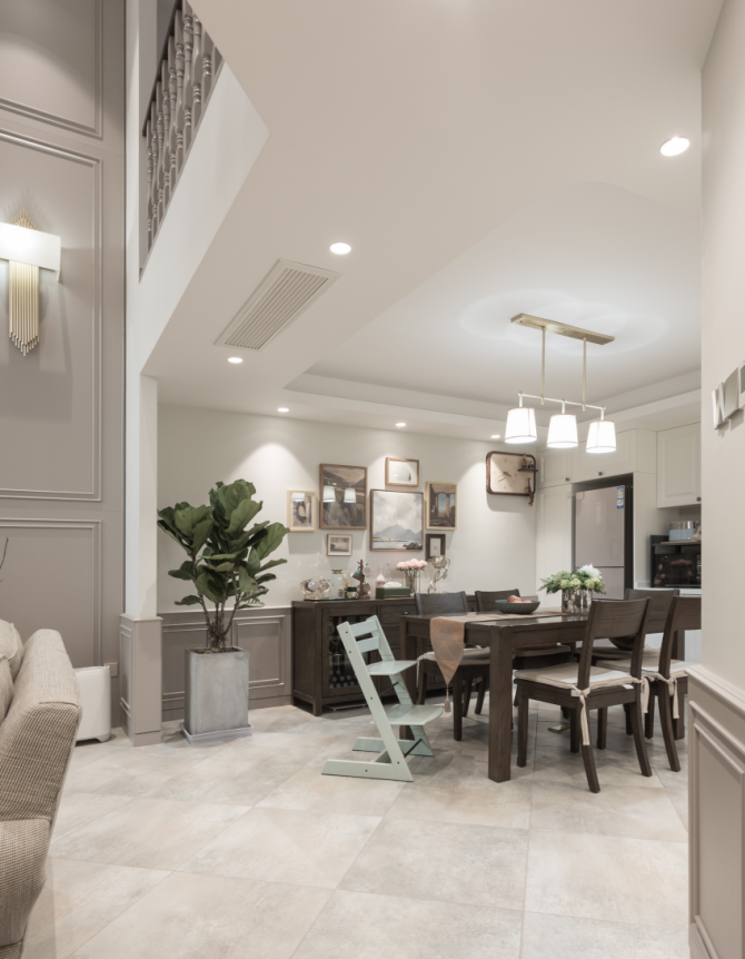 【实景】客厅过道走向餐厅,在护墙板的连贯背景下,让厅的概念模糊化,使得整个公共区域都被融合到整个厅的概念中来,每个区域之间空间共享,弱化边界感。顶部空间划分明显,所以地面材质整体通铺,让空间更加整体大气。