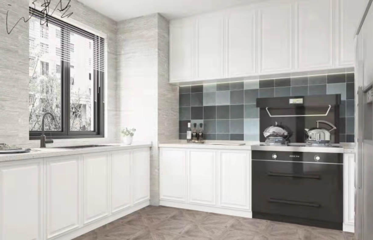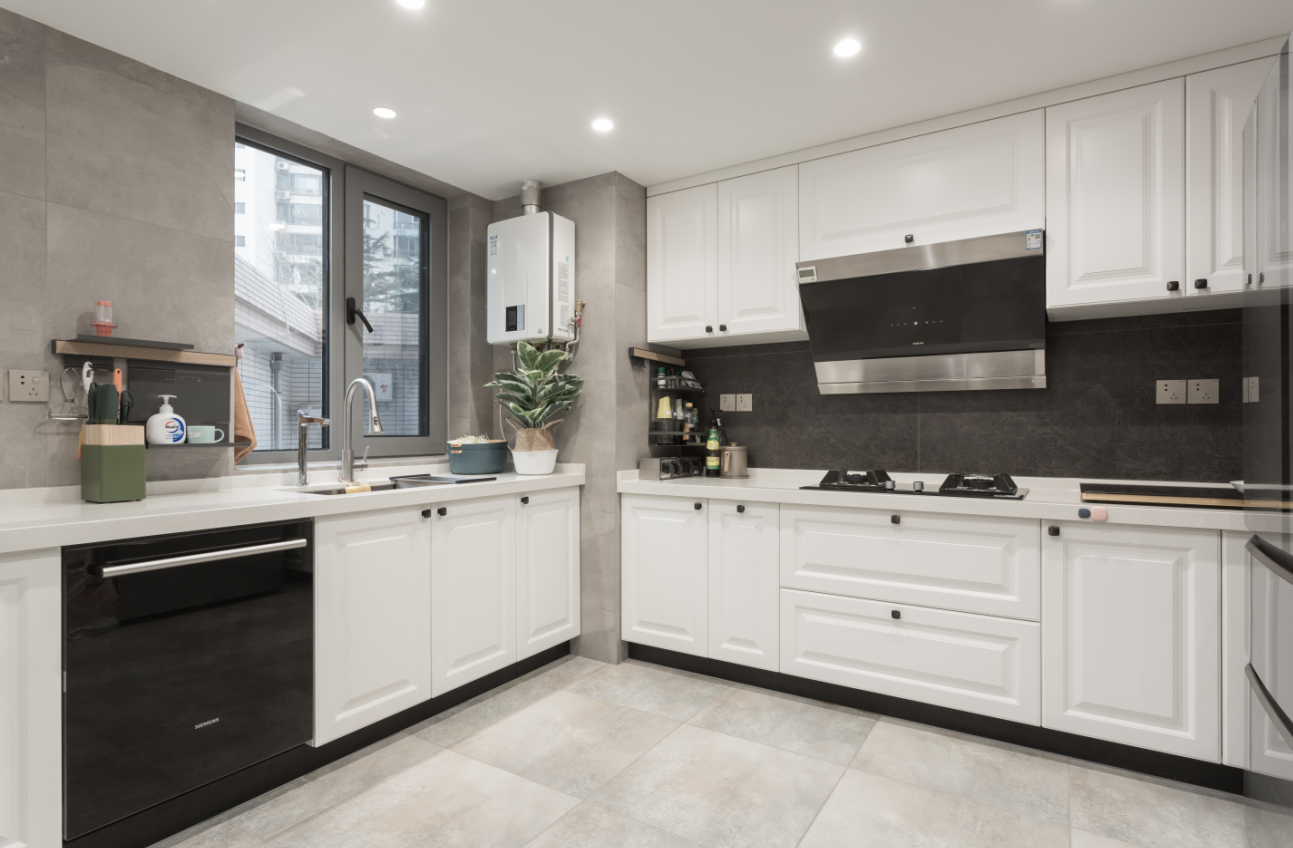 【实景照片】厨房格局改造后的实景照片,厨房门改从餐厅一侧进入更方便,同时也增加了餐厅的空间感。动线的流畅性互动性更强。搭配上灶台区域在选材中遇到一款欧文莱的深色复古砖作为背景,暗纹的低调华丽,让空间瞬间内敛大气。同时深色也让空间增加层次感。大理更方便。