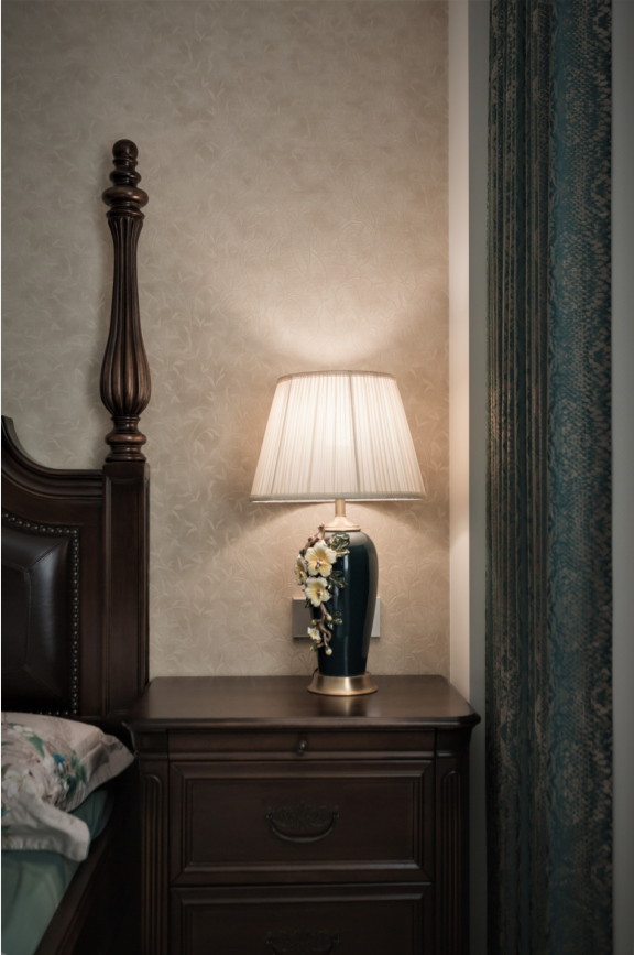 【实景】台灯的色调与窗帘相呼应,灯体自身带有自然味道的装饰,活跃整体氛围。