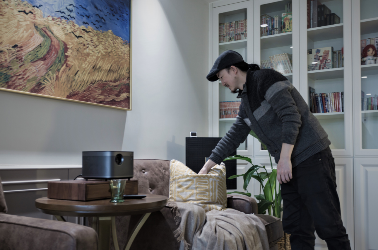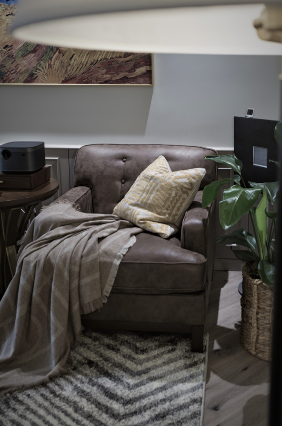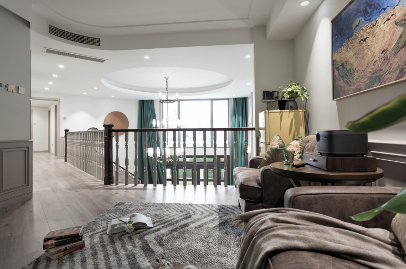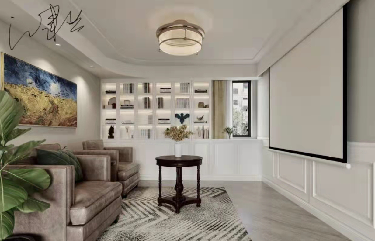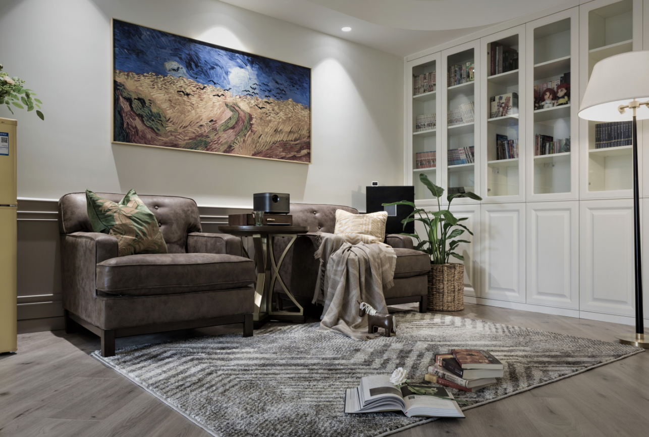 【实景拍摄】影视厅实景照片。孩子不再和长辈们抢电视,大投影光线也更柔和,对孩子视力也是保护。美式的磨砂皮休闲沙发复古艺术气息浓厚。设计师擅用抽象的设计语言,诠释空间与空间,物与物之间的关系。
