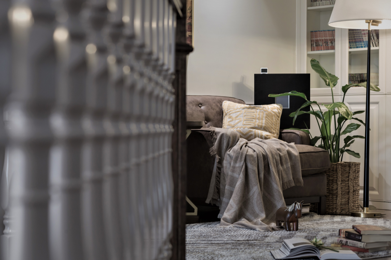 【实景拍摄】沙发背景区域的实景拍摄。在设计落地时候可以更好的优化提升空间搭配,你一定注意到在后期选材料中的两点搭配的优化,一个就是在施工中实际感受到客餐厅实际的采光没有特别理想,索性选地砖时候与业主协调,换了相较原设计较浅的长谷瓷砖。带有浓浓自然气息的哑光仿古砖,在当下市场,选择这类砖也是性价比极高的。搭配上提亮了整个公共区域,同时深浅对比,突出了主体家具软装区域。在调整完这个大项后,主体木门护墙板楼梯栏杆还保持原设计就会整体有些飘,所以设计师果断将原白色产品材质调整为质感十足的暖灰咖系。结果喜人!