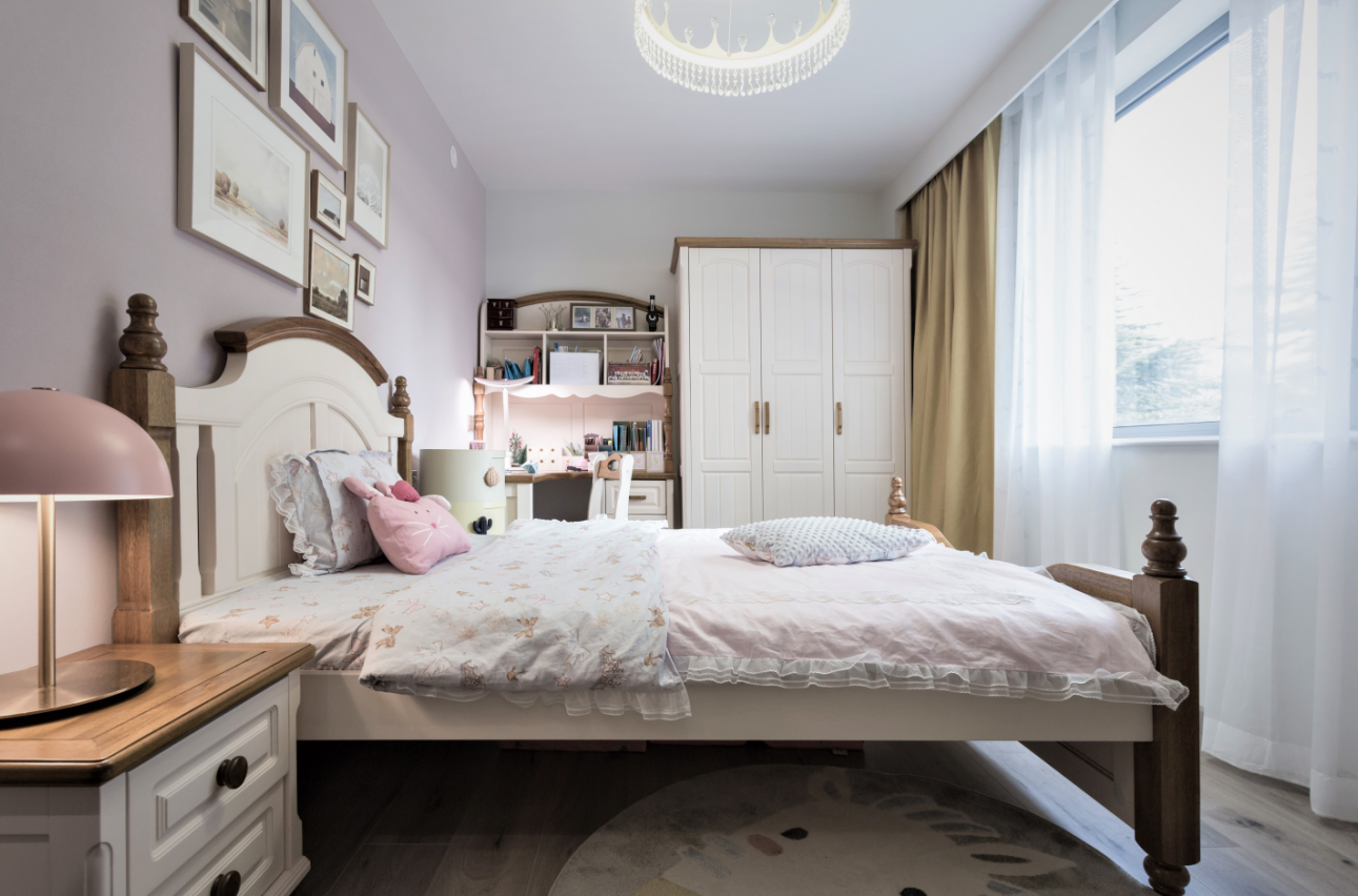 【实景拍摄】女儿房实景照片。轻松愉快、略带公主范的空间感营造。空间上设计出了学习区,满足独立学习需求。搭配上少不了的灰粉色,与水晶皇冠主灯共同撑起主体氛围。