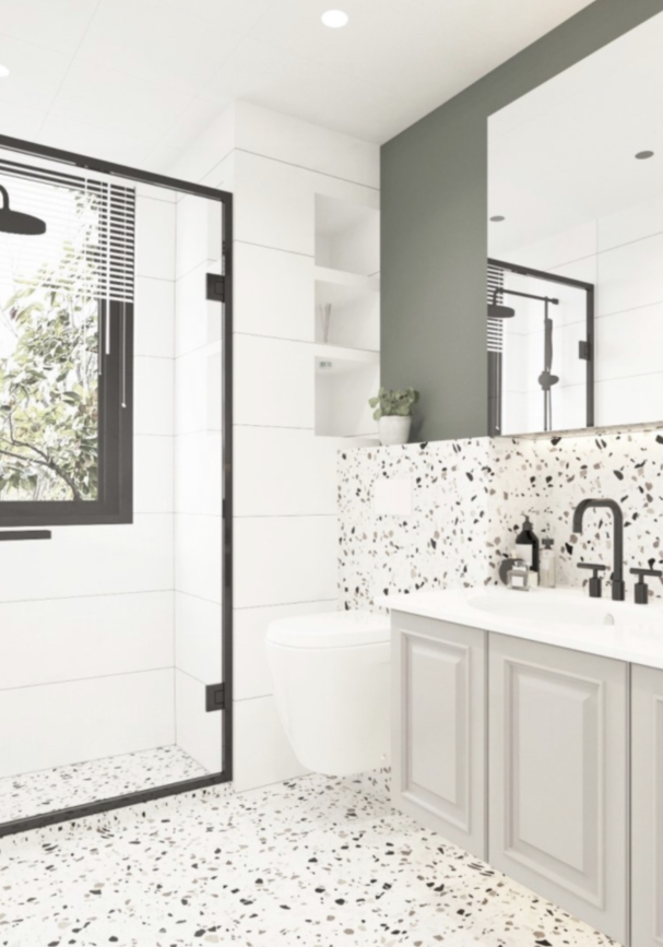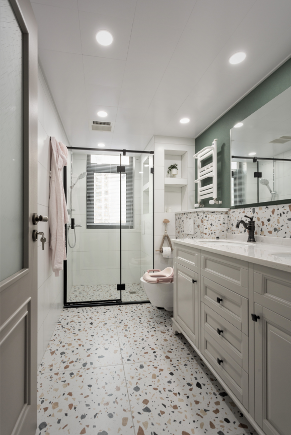 【实景拍摄】孩子卫生间实景照片。有条件的咱们至少是双盆,能做壁龛的绝不要金属架。卫生间功能、打理、安全性永远在第一位。搭配上用了经典的彩色水磨石砖,搭配局部绿色的防水壁布。奶油灰的浴室柜让整体是那么亲切自然。