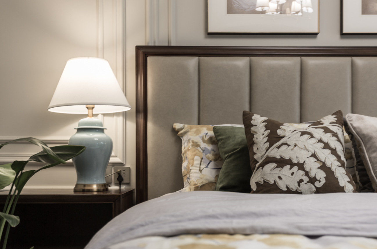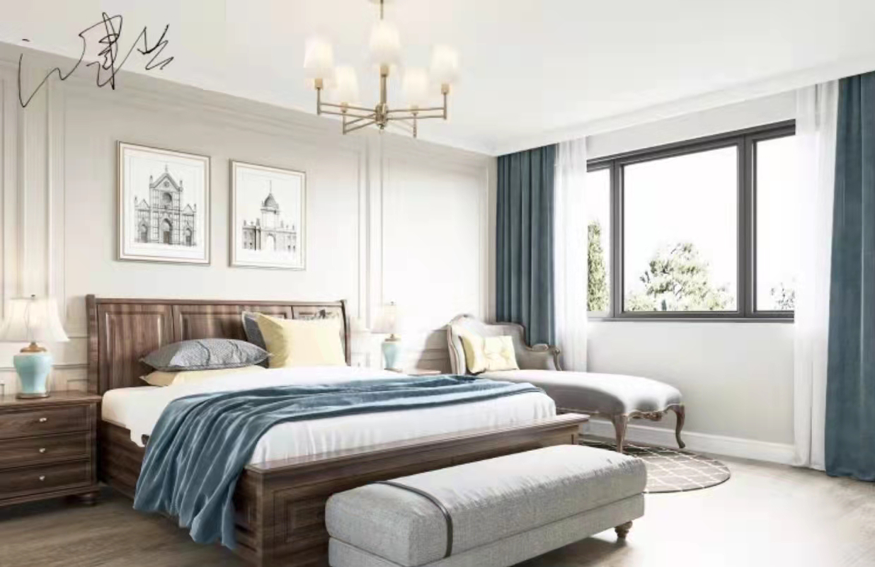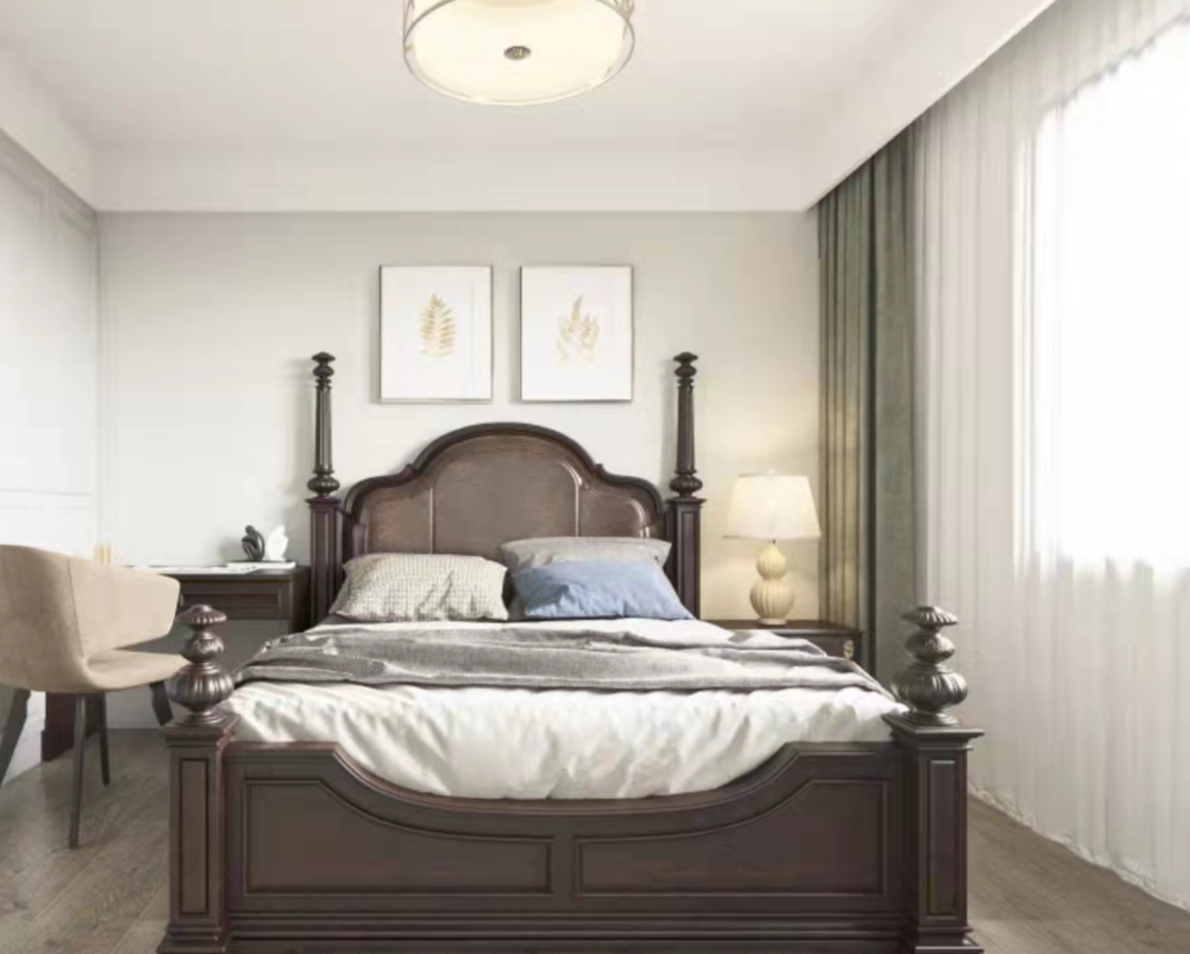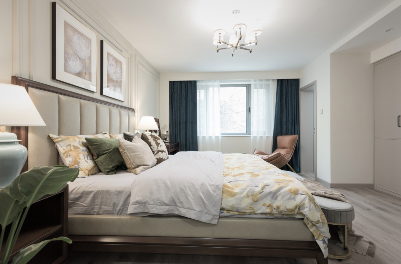 【实景拍摄】长辈卧室实景照片。此空间倾向在复古美式的基础上带些低调奢华的味道。所以从台灯的细节上从窗帘的纹样上都略带金色来提亮整个空间细节,让深色部分保留一些透气感。
