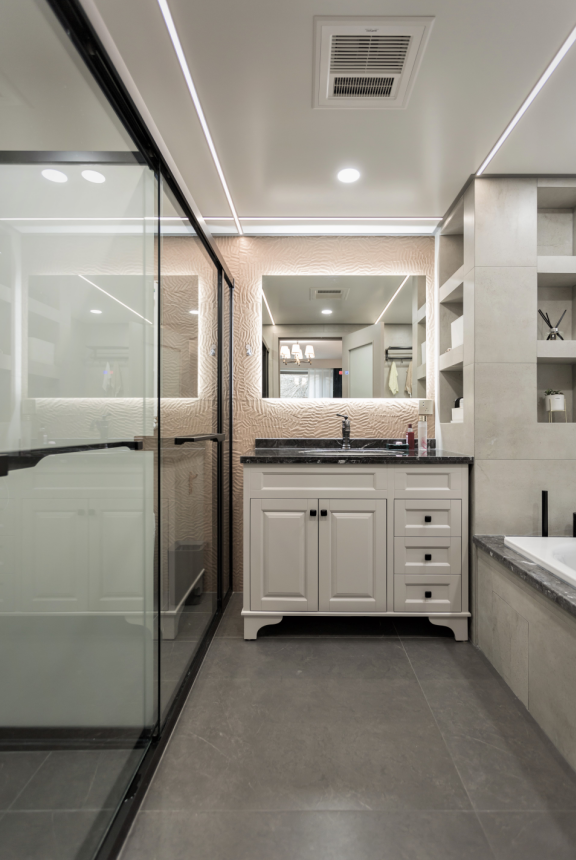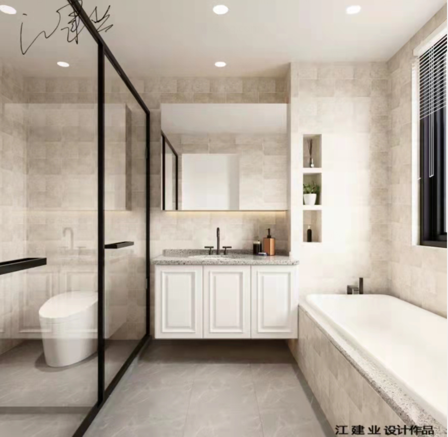 【实景拍摄】主卫实景照片。功能上三分卫设计更独立实用。选材现场有遇到欧文莱的褶皱橘色砖,打动了设计师及业主,设计师根据现场实际瓷砖情况现场搭配,效果确有提升,看设计前后对比。