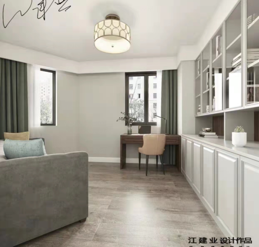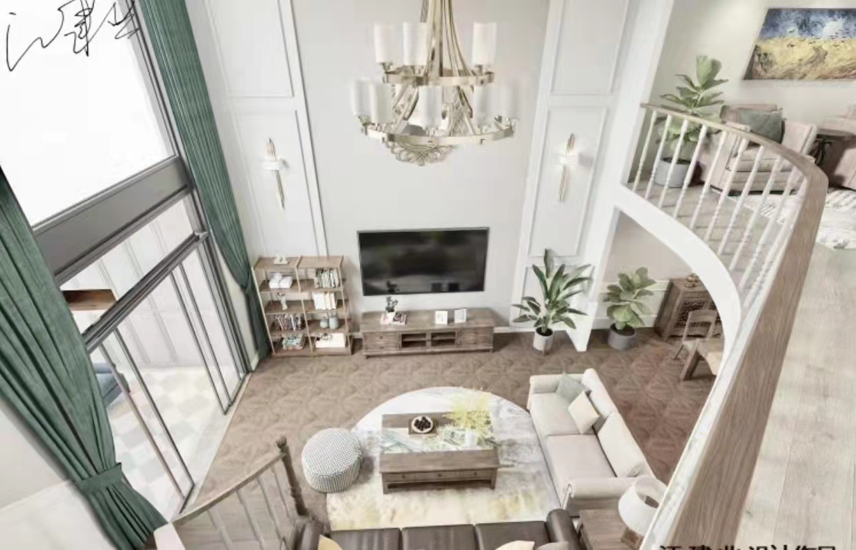 【效果图】客厅主体搭配效果图。 很多时候我做设计不太提倡所谓还原原始效果图,而是倾向尽量在实景时候能解决实际效果中的一些不太理想的搭配或用料,进行选材中的二度创作提升,市场材料的范围要远大于你的材质库。当然这么说也是你必须要超越原始设计的基础上才行的。