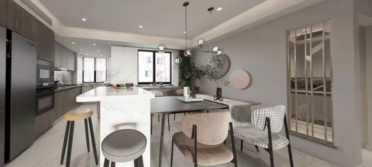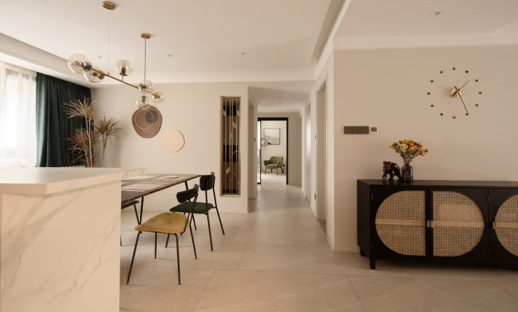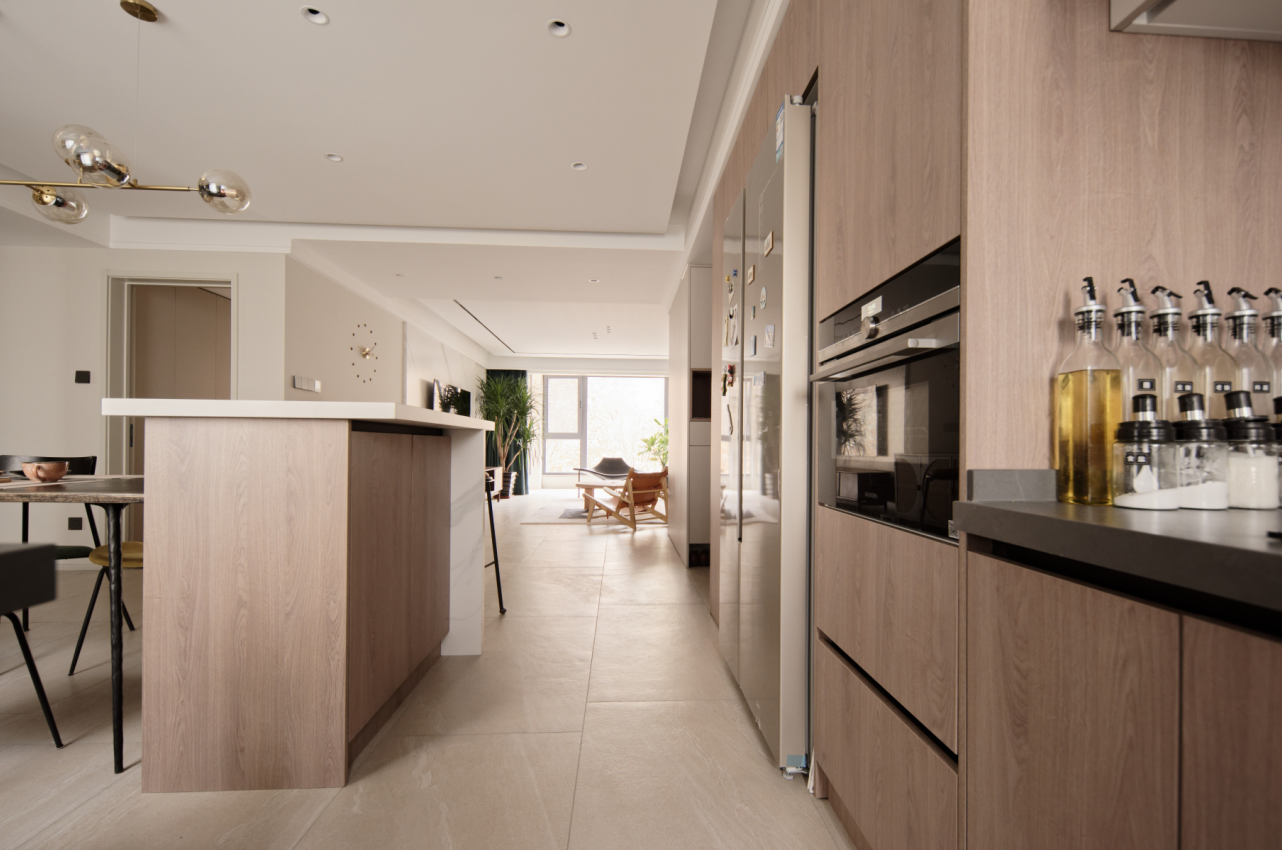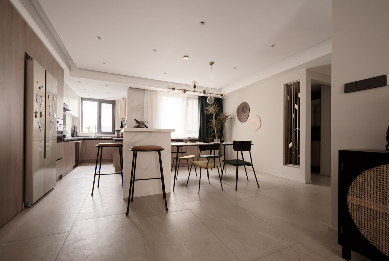 本案为入住后半年拍摄。更真实的还原,家居实用主义装饰艺术。常住3人,父母和儿子,长辈偶尔小住。中大户型在满足功能的前提下,就要体现大的一面。原本封闭的厨房,打开。相对封闭的客卫洗手区,打开。原本封闭的书房空间,打开,做联动通透推拉增加采光通透的前提下保留一定私密性。不放弃一点能增大空间感受和引入采光的点。材质上环保级别第一,质感哑光品质。色彩上整体底饱和度高级暖灰调,点缀单品特色家具装饰。营造舒适和谐有趣味品质的居住氛围。 户型图 本案原始结构,客餐厅间过道狭窄,厨房空间缺少大的收纳面,餐区在放完餐桌椅子的基础上过道已经很窄,动线不便。客卧外过道柜利用不合理,有浪费空间,主卧缺少收纳空间,主卧书房次卧三个空间之间的过道略显狭长,没有利用好这么长的动线来规划功能,或释放空间感。卫生间部分也是功能混乱,使用时互相干扰。 设计师在入户设计上,任然选择保持空间通透性,没有在正面做屏风或所谓意义上的玄关。而是随墙安排各收纳功能,让中心区域保持最大限度的开阔感,这点在小户型里其实也很管用。客卫干区没有完全拆除隔墙,而是做了局部镂空,保证开阔性的基础上,保留了私密性。洗手区正常使用中相对乱一些,这样的做法保证了主体空间效果的完整性。将书房空间对过道的墙体拆除,让空间感加大。为保证主卧的大空间,主卧衣帽间部分借用了客卧的部分空间。这样的做法充分利用了户型中心岛区域,把这个区域给到各个方向来使用。这样空间利用率非常高。让床的一侧不再是衣柜的老套规划。卫生间部分能分离就分离能独立就独立。 玄关设计前 原本入户空间层次混乱,厨房的独立让客餐厅各为独立,空间感小,互动性差。 玄关效果图 玄关实景 打开厨房,收纳功能随墙。收获大开敞空间。将玄关的意义延长到了书房背景装饰。入户空间的选择在满足收纳功能的前提下,要么独立要么开敞。这里我们选择空间为主。 客厅设计前 客厅效果图 客厅实景 餐厅设计前 餐厅效果图 打开的餐厨区肉眼可见的变化。岛台加上 大餐桌的配置是之前空间不敢想象的。收纳也大幅提升。站在厨房望向客厅。大纵深完美展现户型气质。没有将卫生间洗手区的墙体完全打通,而是掏洞,设计通透隔断。保留私密整洁性的同时,加大空间开阔尺度。 次卫设计前 次卫效果图 次卫实景 客卫保留洗手盆外置,使用方便,里外互不干扰,洗衣机干衣机能放进独立空间就放进去,干衣机的噪音和时长,尽量不影响公共区域生活体验感。瓷砖为大砖上墙,薄贴。简洁大气。镜柜保证浴室柜区域的整洁度。入住前入住后基本不会有翻车的现象。洗衣机旁的生活高柜,各种装备,脏衣篮全部收入其中。也是为保证效果而生。安全性上一直倾向哑光砖。主体素色,局部纹理或色彩点缀。窗户使用了内置百叶,虽然有比较低的故障风险,为了居住体现还是选择了。 |