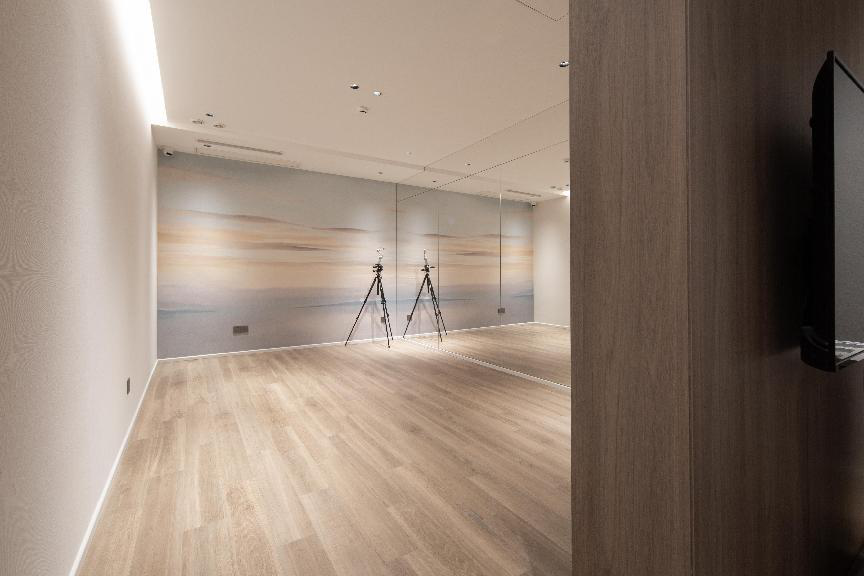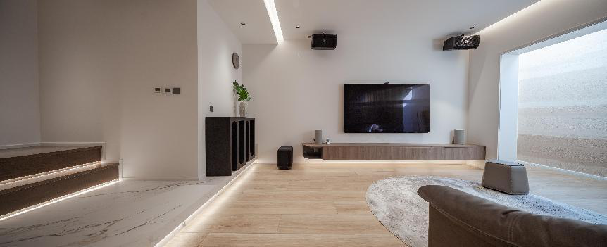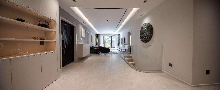 影音房 如果说地上空间是生活所需,那么地下空间则是生活的延展我们将空间打开以模糊化的空间界限构建别墅的专属休闲区。影音式以打造沉浸式观影体验为主基调,去掉多余的修饰,通铺原木地板配置投影仪与电视机满足不同观影需求。墙面绘制艺术画为生活带来诗意。 #影音室#投影仪#地板#电视 下跃阳光连廊 这里不仅是一个艺术与休憩的休息区域,还是一个思考与创新的源泉,供人放松心情,连廊的设计顶部作玻璃质感,外界的阳光照如室内,具有透气感,脱开部分还可以置入景观,打造出轻轻自然的走廊空间。内部通铺原木地板,搭配白墙,秩序感与对称性更强,将视觉的延伸性作为重点,放眼望去,便是靠墙一盏灯,弱化其他元素, 增强空间趣味性! #连廊#玻璃#地板#墙面 廊道作为连通景观与景观的公共空间其自身也可作为一种通道景观结合其自身的线性特征为大家带来一种纵深的景观体验!长廊设计中避免了缺点,充分利用优点,使它变得既美观又实用。天花作木饰面设计,墙面点缀上筒灯,精致又高级,无形中由内到外,生活与艺术,顺势而为的巧妙过渡,神秘与意外之间的对话桥梁! #连廊#筒灯#墙面 卫生间1