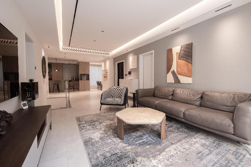 复古皮质沙发靠墙摆放,沙发地毯可移动电视架简单灵活的组合模式在承担会客、观影功能的基础上,客厅的意义反而更多的偏向于休闲放松。去茶几设计以极简的修饰手法释放出更多的空间感,在应对未来生活场景方面也留足空间给居者随意设置加深空间的互动感和体验感。 #客厅#沙发#地毯#可移动电视架#去茶几设计