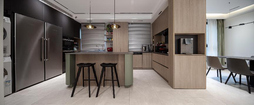 厨房 厨房布局在楼梯的另一侧,极致开阔简约的布局进一步带来了公区空间各自独立却紧密相连的视觉呈现效果。开放式厨房配备中岛经典搭配不仅仅是使用功能上的便利同时也凸显居者生活品味。中岛也可作为临时餐桌组合上吧台椅休闲娱乐的好去处。 #厨房#开放式厨房#中岛