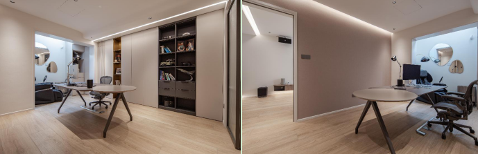 把生活调成自己喜欢的频道每一段时光都藏着不可复制的美好,在细碎的日常中捕捉生活的幸福感。这是原始户型为双层别墅的一套住宅,住宅的屋主是一对恩爱非常的夫妻,是同龄人中的佼佼者,有着美满的家庭体面且高薪的工作。对于新家他们有着无限美好希冀,两人都爱好质感且舒适的家居氛围钟爱现代轻奢风。结合屋主的喜好以细腻的手法为居者打造出温馨舒适的休憩、学习、办公和娱乐场所,同时在设计中大量加入低调、品质、哑光、质感、空间感、无主灯、悬空等元素有机组合出居者心中的世外桃源。 下跃平面布置图 1.原始精装房结构没有做大量的修改,而是通过软装来调控空间使得居者有更舒适的居住体验。 2 楼下主要以影音室加书房为主且增加的收纳缓解楼上厨卫的压力。 3.书房阳台区域的墙面通过组合装饰镜来造窗景缓解压迫感。增加透气感。楼下书房内还设计了衣帽间内置壁床兼临时客卧。以备用不时之需。 4.增加的收纳缓解楼上厨卫的压力。楼下阳光过廊区域墙面为了减少压迫感,设计了一面渐变的夯土墙面,视觉效果上更有延展性。