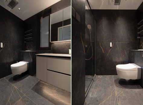 卫生间布局井然有序依次划分出洗漱区和领域,干湿分离互不打扰,提高生活便利性。淋浴区依靠不同花色的瓷砖装点,肌理丰富描摹出品质生活。玻璃门采用磨砂质感得到隔而不断的效果。 #卫生间#干湿分离#瓷砖#玻璃门 卫生间2