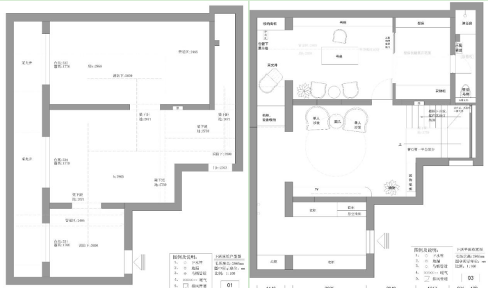 一楼平面布置图 1.客厅与餐厨开放一体的设计与院子的连接外墙拆除以落地窗的形式展现,让空间采光以及通透性得到最优化。 2.一层楼梯位置栏杆用了通透的超白玻璃扶手,原空间北卧室和厨房空间比较窄,家中来客少,所以我们将厨房和北卧打通做了大厨房中间配备岛台做到全屋视觉效果的开阔明朗。 3.将原卧室的卫生间独立出来作为一楼的公共卫生间使用缩短使用动线更方便日常起居。