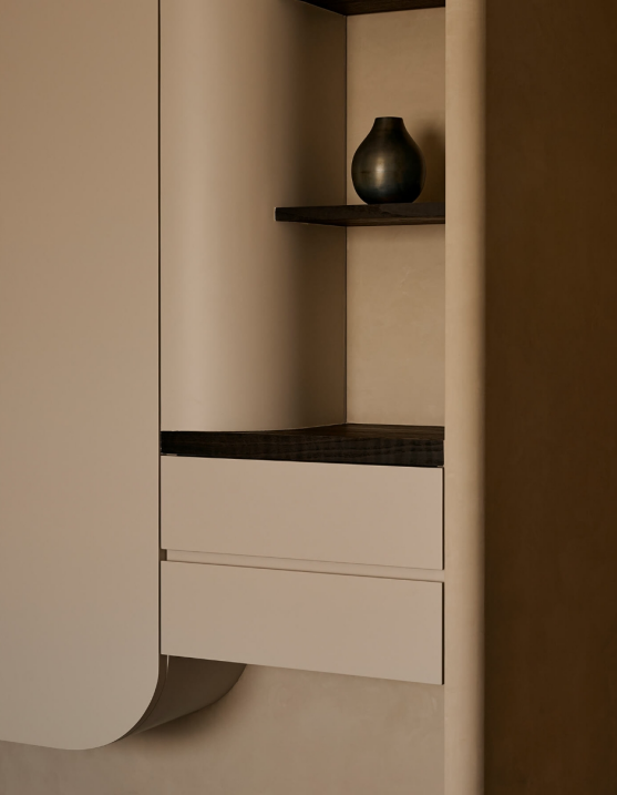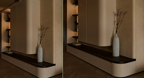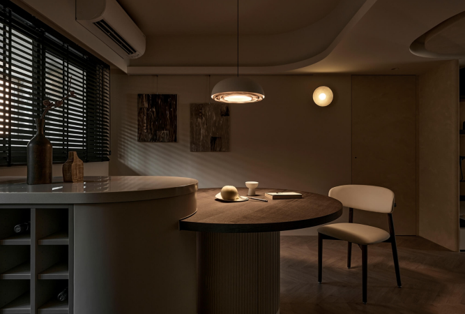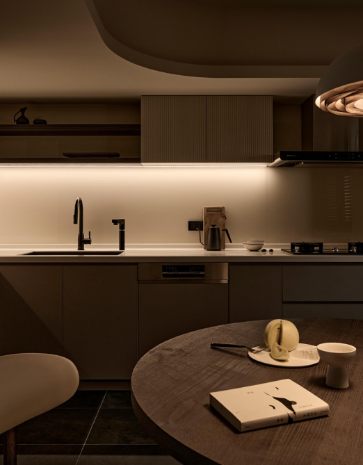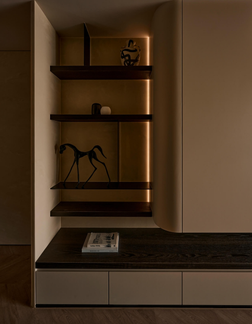 廊道作为整个空间的中枢区域,延续客厅色调,以奶咖色来实现氛围的交叠实现,开阔视感又添一笔~木地板和咖色储物柜搭配灯带,在淡雅的空间中,配上花瓶绿植,恰到好处流露出现代感与舒适感。台面悬着黑色系,平整光滑,既美观又耐用。 #廊道#储物柜#台面#摆件 对美的追求是每一个灵魂所向往的,墙面设置满墙储物柜+展示架,弧形独特的线条营造出一种和谐的美感,嵌入灯带,借助摆件,形成极具秩序感和仪式感的储物空间。地柜置于下方,细腻的纹理打通空间活力,暖色调抚慰着每天因工作疲惫不堪的心灵,沦陷于温暖所带来的抚慰。 #廊道#储物柜#地柜#展示架 餐厅 四方食事,不过一碗人间烟火。餐厅启用圆桌,餐桌通体原木与岛台一体式设计,碰撞出温馨的用餐氛围。弧形岛台大理石质感下方储物格依次排列,线条感十足,搭配绿植最大释放餐厅呼吸感,墙面理性留白,不可多得塑造空间通透感。 #餐厅#餐桌#岛台#墙面 餐厅居于廊道内侧,延续客厅通铺原木地板,窗台+百叶帘组合调控室内光源,上方壁挂式空调,在家实现冬暖夏凉。圆形餐桌较之传统更显轻盈,搭配靠背餐椅既满足使用功能又塑造空间通透感。墙面挂画高低设计凸显居者品味,随意放置用最自然的笔触装点生活。 #餐厅#餐桌#餐椅#挂画 餐桌像一条无形的纽带,连接着四季烟火。餐岛一体扩大操作面的同时无形增加收纳空间,原木材质散发着细腻柔和的温润。吊灯自上而下,照亮美食,一侧挂画置于墙面,用最温暖的灯光,照亮极具美学的每一个细节。 #餐厅#餐桌#美食#吊灯 厨房 餐厨一体的布局规划合理优化生活动线,餐桌与橱柜相邻,既可以作为餐前洗手,还能当做备餐台。咖色橱柜+吊柜组合搭配,白色大理石台面赋予厨房干净舒适感,光线不好成为很多厨房的通病,所以我们通过内嵌式灯带搭配餐厅吊灯为厨房点亮备餐时刻。 #厨房#橱柜#吊柜#灯带#餐厨一体 主卧 来到卧室,奶咖色+灰色贯穿整个主卧空间,一张双人床置于中央,搭配床饰最大程度营造舒适,慵懒的睡眠空间。软包护墙板,利用圆润的线条和软糯的材质交融打造一个专属于这个空间的“修心”之所。 #主卧#双人床#色调#床饰 恰到好处的绿植点缀让空间更有韵味,咖色调墙体穿插搭配壁龛式展示区很好的将主卧空间低调与沉稳的气质相结合,通铺原木地板,打造了墙地一体的视觉效果,窗台+百叶帘透射的光影,营造似有若无包裹感,一张沙发椅让人置身其中,心神气定,悠闲感十足。 #主卧#躺椅#窗台#百叶帘 主卧依靠自然光呈现温润柔和的氛围,依靠弧形作出区分,落地灯+沙发躺椅直观的展示了居住者的随和日常。不同于外部空间,采用创意圆形床头柜充满自然气息与一侧咖色衣柜更适配,底部开放格组合设计,多效利用。 #主卧#落地灯#床头柜#衣柜 次卧 卧室是我们心灵疲惫身心的港湾,一个能够带给屋主宁静和安逸的地方,精心设计的次卧不仅能为我们提供美好的睡眠环境,更重要的是创造一个温馨的私人空间。由墙到底衣柜+开放格组合设计,黑色内框尽显质感,双人床靠墙放置,肉眼可见的软糯床头靠背,演绎着次卧舒适的属性。错落有致的灰色系毛毯,靠枕无一不彰显富有节奏的沉稳空间! #次卧#衣柜#开放格#双人床 卫生间 整个卫生间以高级棕咖为主色调咖色大理石瓷砖自带奢华大气感,带来品味的独特魅力。无主灯的设计,选择筒灯+灯带均匀的照明,营造空间氛围感。几何双层立体感洗漱柜+镜柜大且宽,轻轻松松解决收纳问题。以功能出发,磨砂玻璃门作为隔断打造干湿分离,浴缸+花洒组合,淋浴环境更加舒适,黑色圆凳用于置物拿取方便,无形打造沉浸式体验。 #卫生间#洗漱台#浴缸#花洒#瓷砖