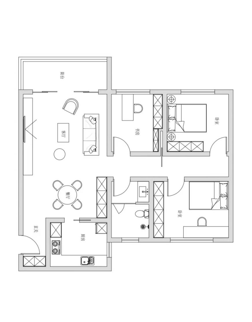 平面布置图 1.原始户型较为完善,我们并没有进行大的拆改,只是在少数地方进行优化处理,让空间利用更加高校合理。 2.大横厅打造客餐一体布局,将阳台融入室内,空间无比宽敞大气,封闭式厨房隔绝油烟,采用玻璃门连接让光线更好流通。 3.选用光线较好,空间较大的一间次卧作书房,更加契合屋主需求,提高生活质量,考究主卧放置,生活动线最优。 4.充分利用走廊室内等区域,打造储物柜扩大储物空间,将杂物隐于无形,保持室内整洁清爽。 客厅 摒弃繁杂,以开放式设计为主轴导引充沛日光入室,公区墙面通刷奶白色艺术涂料,搭配原木元素,温柔淡雅又凸显质感,奠定家的温馨舒适格调。平顶无主灯设计配合筒灯与自然光线完善室内光源。阳台纳入客厅,室内空间得以进一步拓展,搭配全景落地窗,为空间带来宽阔采光,双层帘过滤光影,给全屋镀上柔美滤镜,空间氛围静谧祥和。 #客厅#墙面#无主灯设计#落地窗#窗帘#筒灯