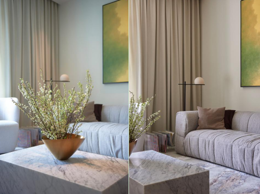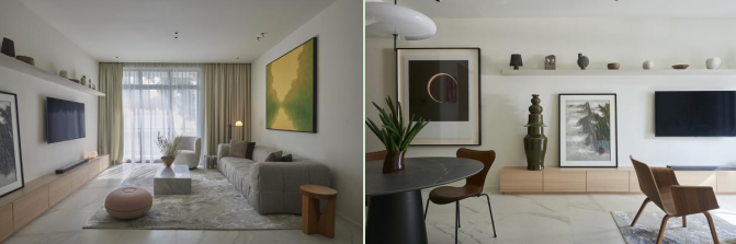 灰色沙发靠墙摆放,多人沙发+单人沙发的组合开放客厅休息区不同形式,同色系抱枕带来放松与闲适。沙发一侧放置黑白撞色落地灯,闲暇时可静静依靠沙发在灯光的照耀下阅读学习。墙面悬挂艺术挂画,黄绿配色点缀空间带来无限清新。大理石茶几居中摆放,通透冷冽是石材与生俱来的特色,金属花瓶放置郁郁葱葱的绿植渲染生机盎然,塑造禅静意境。 #客厅#沙发#抱枕#落地灯#挂画#茶几#绿植 客厅地面通铺大理石纹地砖,铺上纹理清晰质感满满的地毯塑造客厅温馨氛围,电视背景墙整体以白色搭配原木色为主,视觉效果干净清爽,不失格调与气质。原木电视柜造型简约大方,台面位置可摆放摆件与收藏品,黑色电视悬挂上方布局条理有序。白色置物架沿墙体向外延伸,为家中小物件创造归属之地。 #客厅#地砖#地毯#电视柜#置物架#摆件 餐厅