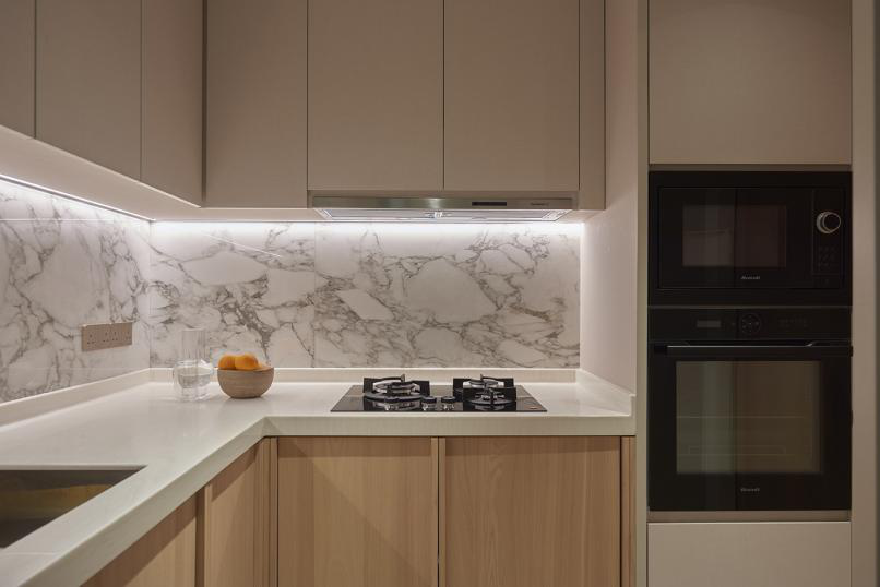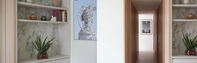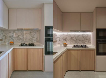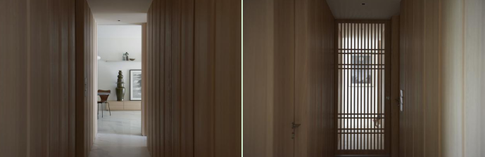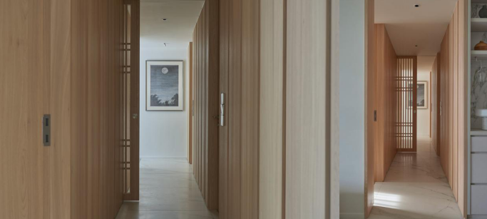 白色台面干净易清洁污垢无所遁形,水槽灶台各置一侧,洗切炒动线一目了然。吊柜与橱柜均采用无把手隐藏式柜门保持整洁流畅,尽显极简之没,大理石纹瓷砖填满缝隙吊柜下方隐藏灯带严丝合缝。 #厨房#台面#吊柜#瓷砖#灯带 走廊 原木房门与木饰面构成日式气息十足的走廊,一字型布局带来由浅入深的纵深感,铺设白色大理石瓷砖,串联客厅卧室卫生间提升空间互动感。沿着走廊平铺的筒灯则为走廊蒙上微黄的灯光,步步生莲熠熠生辉。 #走廊#房门#木饰面#一字型布局#地砖#筒灯