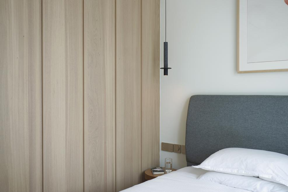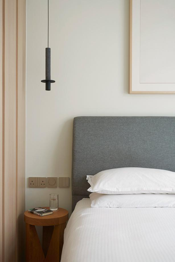以原木小圆桌代替繁杂沉重的床头柜,配合上方线性吊灯以轻盈小巧的姿态融入清透空间,减少不必要的空间占用整体更加简约。极简的造型和简单的配色补充储物与照明的同时,进一步丰富空间层次。床侧安装整墙衣柜,墙柜一体视觉清爽统一,睡眠氛围简约舒适。 #主卧#圆桌#吊灯#衣柜