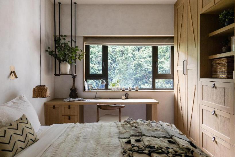 次卧 次卧的风格跳脱出简约多出一丝童趣与可爱。房间整体衣柜采用浅棕色实木制作,与整体风格一致。窗前位置留出空间放置原木桌椅作为看书办公的场所,合理利用空间的同时又能扩展使用功能。书桌上方黑色置物架垂直而下摆放白色花瓶点缀绿植,颜色对比带来层次的提升的同时也与窗外景色相生相伴。衣柜与墙壁的空余刚好可以放一张双人床,去床头的设计显得简单舒适,奶油色的床上用品刚好中和了洁白墙面的单调给。墙面的小夜灯让空间在夜晚中也能温暖治愈。 #次卧#衣柜#书桌#椅子#置物架#绿植#窗户#吊灯#双人床