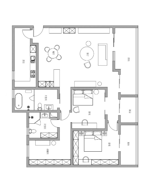 平面布置图 1,客厅墙面设定为收纳柜+背景墙模式,深化空间利用,既能保证墙面的完整性,又能深化垂直空间的利用。 2,客厅与餐厅做一体衔接,打破两个空间的界限,让空间更加开阔显大,同时利于增加家人间的互动与交流,,实现功能融合,提高空间利用率。 3,客厅卧室打破千篇一律的空间布局,采用一条纵向的通道连接起来,使整个空间被有理有序的组织起来。