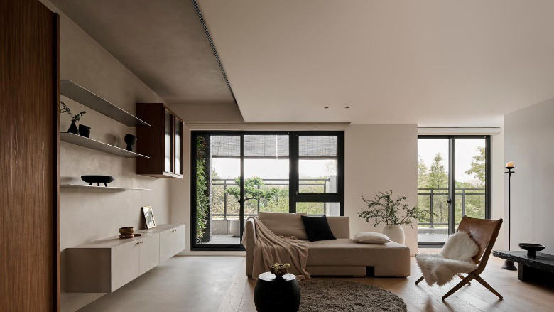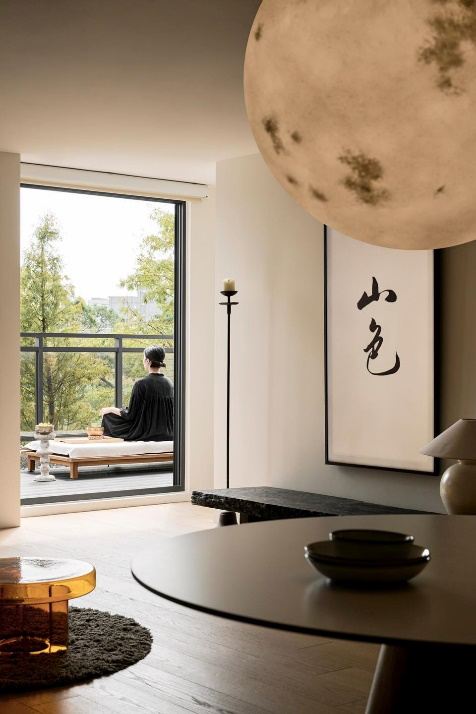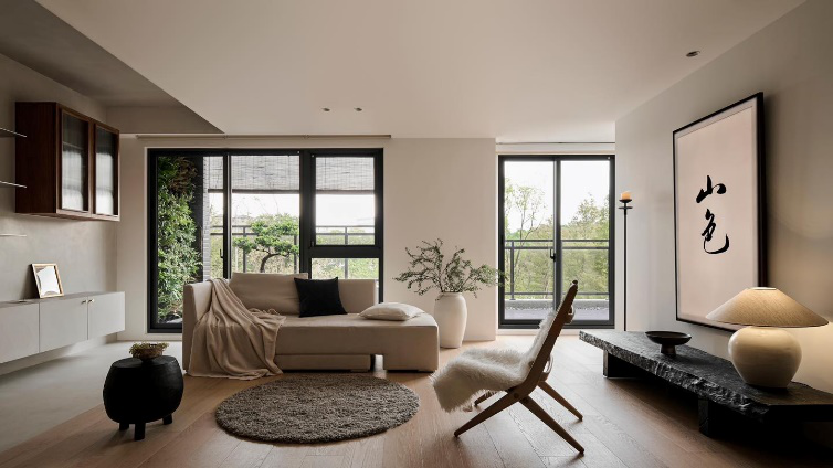 客厅 来到客厅,平吊顶+无踢脚线设计,让墙顶面仿佛浑然成为一体,横平竖直,让人感觉极度清爽。无主灯设计使得灯光保持隐匿,最大限度地让度于自然光,空气、阳光在空间里自由流动,仿佛有一份不被打扰的宁静悠远。木地板通铺延伸至家中的每一个角落,让空间的开阔感和通透性更上一层楼。 #客厅#平吊顶设计#无踢脚线设计#无主灯设计#木地板 简洁明朗的乳白色沙发与阳台射入的光线交织,让整个客厅空间都处于一种舒适静谧的氛围之中,与周遭的懒人椅,矮几,绿植互相陪衬,松弛感呼之欲出。沙发背景墙摒弃传统的墙面装饰,因为刚好客厅屋外是一个露台,于是直接将墙面中部打通,安装上落地窗,以户外的大自然绿景做成背景装饰,让整个家在每天都富有变化。 #客厅#沙发#沙发背景墙#懒人椅#矮几#绿植#露台 客厅采用去电视化设计,原有的电视墙只保留了装饰的功能,背景墙与其他墙面同色,最大限度保持一致性和流畅性,墙面挂置屋主书写的毛笔画,“山色”二字不仅点亮整个设计主题,还能为整个空间营造出独有的东方气韵。下方放置一张长方形的黑色木凳,代替原有的电视柜,搭配一上烛台,陶盘,台灯,让家的禅意感满满。 #客厅#去电视化设计#长木凳 沙发的右侧是一堵长而宽的墙面,为了让墙面空间更加丰富有层次,我们在墙安装了几组不同造型的柜子,造出一个超有个性和性价比的收纳墙,置物板,悬空柜,木柜,一起合作干大事,丝毫没影响收纳的同时,颜值还更上一层。 #客厅#墙面利用#收纳柜#收纳墙 阳台 现代人在快节奏的生活状态下,高强度的工作和压力时常让人变得焦虑不安,所以在住宅里我们利用户外阳台,为屋主打造了一处心灵与身体的冥想休闲空间,在这里,屋主可瑜伽、可喝茶、可弹奏古筝、可阅读、可冥想、可会友,功能百变,女屋主说这简直就是为他量身定做的。 #阳台#休闲阳台#露台