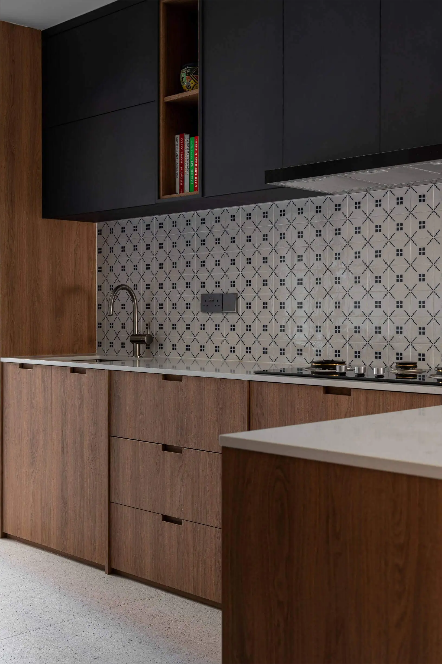 厨房 厨房以吊柜+地柜来展开布局,黑色的吊柜与胡桃木色的地柜做搭配,上深下浅的色彩配比舒适自然,更有层次感。超大的上下储物柜体还分别做了抽屉,开放格,储物柜三种形式的收纳,完美让厨房的储物问题迎刃而解。中间的墙面采用花砖进行点缀,富有规律的花点,增强整个空间的氛围感。L型厨房设计也方便了平时的烹饪操作,洗菜切菜烹菜的区域自成一体,做饭直接循着一条线一气呵成。 #厨房#吊柜#地柜#花砖#L型厨房设计