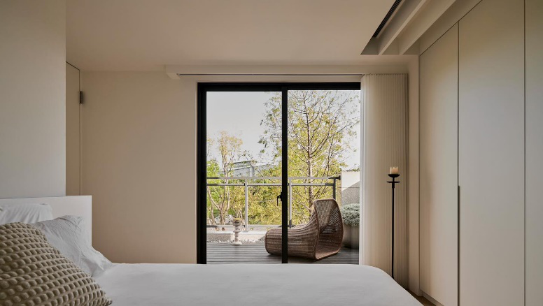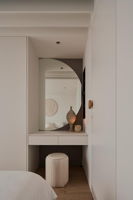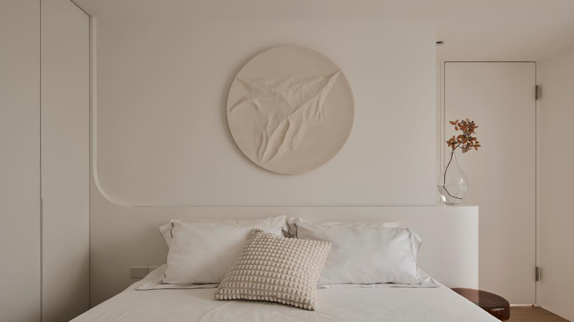 主卧 来到家中的主卧,墙面采用奶白色打底,丝滑细腻的颜色与质感使得空间更具有家居生活的温馨感,双人床靠墙侧摆放,床头背景墙的立体浮雕与柔软的床品碰撞出浪漫又富有情调的空间。背景墙下端还巧妙延伸出一部分来,放置图画或绿植都很不错。 #主卧#双人床#床头背景墙#立体浮雕#床品 主卧床尾与床侧的衣柜相交处遗留处了一平米的空间,索性我们在此搭建一个梳妆台,这样一来,既能做衣柜梳妆台一体化的设计,让空间衔接更加完整流畅,又能减少空间浪费,物超所值。梳妆台采用悬浮式设计,造型轻盈,也利用双腿放松,双抽屉设定进一步拓展储物空间,偶尔也可以做办公桌使用,双赢。 #主卧#衣柜梳妆台一体化设计#悬浮式梳妆台 为了让屋主能更惬意的使用和享受户外空间,我们将主卧的露台保留下来,用一扇玻璃推拉门为界限,摆上茶几,休闲椅,屋内是烟火,屋外是诗和远方。 #主卧#露台设计#玻璃推拉门