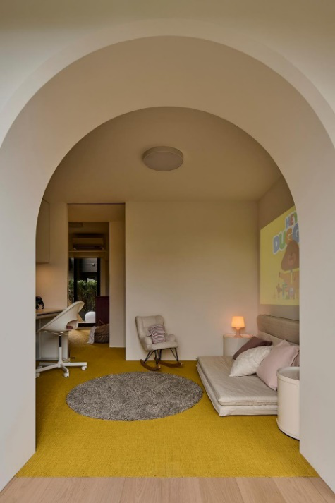 次卧 在次卧的外侧我们打造了一个休闲区,休闲区域不设门,仅由一道拱形门充当室内外的软隔断,让区域之间更加开放流畅。拱形门的内侧也没“闲”着,里侧两边掏空做成开放格,收纳书籍,玩具,摆件,美观又不占空间。 #次卧#休闲区#拱形门#开放格 休闲区以左右来划分功能,左边是一个书桌,平常屋主在这处理公务、上网,打游戏都很方便,右边则是一个懒人小沙发,抱着零食就能打开投影仪看剧看电影。地面的姜黄色地毯从休闲区一直通铺进室内,明媚的颜色自带温暖感受,让整个区域在秋冬都温暖又治愈,光脚触碰,每一寸肌肤也都能有柔软体验。 #次卧#休闲区#书桌#懒人沙发#投影仪#地毯 卫生间 卫生间墙地采用白灰色的柔光砖通铺,颜色统一,干净又透亮,整个卫生间看起来都显大不少。中间一道极窄的玻璃门做隔断,既能丰富视觉效果,又能实现干湿分离。浴缸靠窗,,方便通风和采光,再也不用怕水汽闷人了,窗面的百叶帘透光不透人,泡澡也能窥见窗外大自然风光。 #卫生间#柔光砖#玻璃门隔断#干湿分离设计#百叶帘