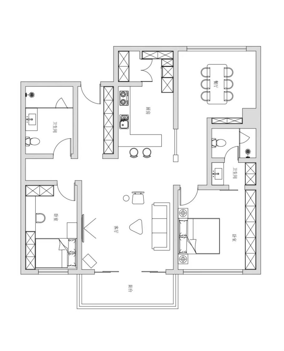 户型图 1.房屋的布局没有较大的改动,以中间的客厅为中心,向用餐区与起居室延伸,走廊与隔断的恰当安置有助于全屋动静区域的划分,让各个空间有序独立的同时,保证动线上的贯通。 2.两个卫生间均采用干湿分离的设计,可以有效增加使用空间。主卧里的卫生间是三分离的独立空间,将洗手台、马桶和淋浴区相隔,而在外的卫生间则是将三者依次平行排列,相互独立有序,避免了不同区域之间的互相干扰。 3.厨房采用半开放式的设计,在与客厅相邻的区域设计了一个吧台,可供屋主享受一个方便省事又不失精致的早餐;与餐厅之间则是设计了一个半开放的隔断,打造出相联系又分离的独立空间,保留屋内隐私界限。 #户型图#结构图#平面布置图