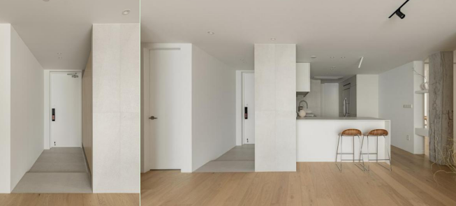 玄关 一进门,首先来到玄关的位置,是一个长方形的半开放空间。墙面选择了纯白色的粉刷,地面选择了浅灰色的设计,整个色彩的搭配简约又大方。在布局上进行大量的留白,少有装饰物,更显干净。 #玄关#地面设计#墙面设计