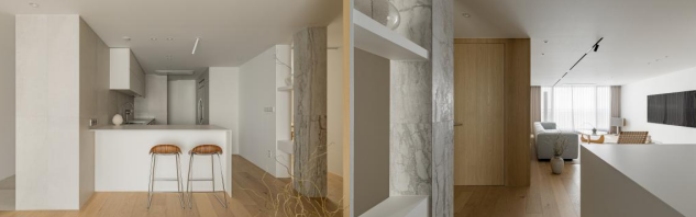 在靠近走廊一侧的墙壁设计上,选择在原有墙壁的基础上设计大理石纹路的支柱以及纵向的装饰梁,使整个空间充满艺术氛围的同时,也减少大面墙壁带来的封闭压抑感,增加不同空间之间的流通、联络性。 #厨房#墙壁设计#吧台#高脚凳