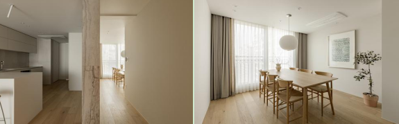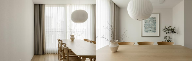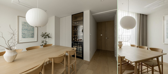 餐厅 顺着大理石墙壁装饰的过道往里走,便来到了餐厅的区域。餐厅朝阳,落地窗的设计,让整个空间享有极好的采光,适合白日休闲,也适合傍晚团聚。较为封闭式的方形空间给予用餐者更多的凝聚感与安全感,定制的一套白橡木餐桌也与全屋的原木风相协调,纯白的墙面延续简约温馨的风格。 #餐厅#窗户#餐桌#地板 餐桌上方悬挂着一个白色纸灯笼样式的吊灯,与整体呈现的和谐温馨的氛围十分协调。桌面上摆放了一个简单的杏白色花瓶,增加装饰艺术感。纯色墙面的一侧悬挂着一张屋主喜欢的艺术画,点缀着空间。角落搭配了一株绿植,为餐厅增加更多的鲜活、生机能量。 #餐厅#餐桌#吊灯#墙面设计