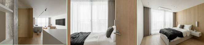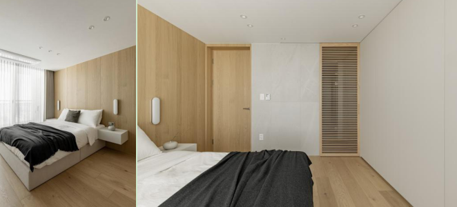 餐厅采用无吊顶的设计,纯白的天花板上内嵌了中央空调。同时,在其间穿插了零星的LED灯,满足局部照明的需求,在右侧的墙角处,设计了顶天立地式的橱柜,可以增加收纳储物的功能。并镶嵌了一个多功能数字酒柜,可以调节温度,储放屋主喜爱的酒类。 #餐厅#无吊顶#LED灯#酒柜 主卧 从厨房的吧台向前望,在客厅的背面便是主卧的区域。打开木质的房门,我们可以看到整个主卧的空间是十分开阔的,在布局上也清晰明了。一张双人床靠墙放置在中间,一侧安置了悬空式的床头柜,两个长方形样式的床头灯悬挂在床头墙面上,简单中显现精致感。临窗的朝向享受极佳的采光。 #主卧#双人床#墙面设计#床头柜#窗户 主卧在房顶设计上依旧是无吊顶的设计,使整个空间的纵向视野更加的开阔。并且也采用无主灯的设计,将不同款式的灯光,例如LED灯、长方形照明灯等搭配起来,可以分别调整不同的亮度的同时,共同完成整个空间的照明。在房门设计上选择两扇木质的房门,与整体的原木色,风格相一致,可以做到与房间外以及卫生间区域进行自然的区域分隔与过渡。 #主卧#无吊顶#无主灯#灯具#房门