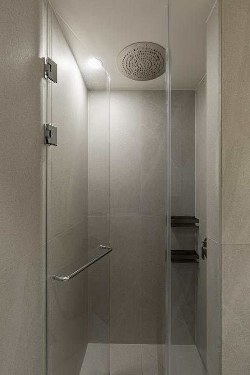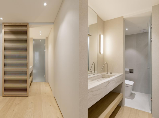 卫生间1 从这个木质的移动门往里走,便来到了主卧的卫生间区域。整个卫生间做了完整的干湿分离。靠近门的地方是洗手台的区域,依旧选择了木地板的铺置,与洗手台下的原木色开放式隔层相协调,搭配墙壁上悬挂的暖色灯光,更显温馨。在台面上选择了大理石花纹质地的嵌入式台盆,给台面上留有更多放置物品的空间。 #洗手间#地板#洗手台#灯 淋浴间在墙面的设计中选择时下流行的大理石灰,与天花板和地面瓷砖整体相协调,更显高级质感。在顶部安置了一个顶喷花洒,满足屋主对于淋浴时雨淋、水雾等不同出水方式的多种需求。在墙角的一侧悬挂了一个两层的黑色置物架,与简约高级质感风格十分的协调。 #卫生间#淋浴间#顶喷花洒#置物架