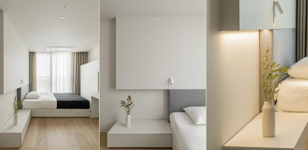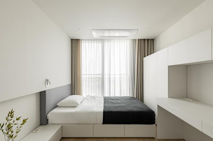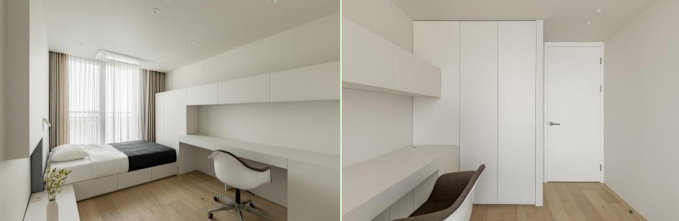 次卧 次卧选择白色系为主的色调,采用一体化定制的床具、橱柜,更具整体协调感。床放置在靠窗的一侧,享有极佳的采光。定制的床铺、床垫下设计的是可收纳用品的抽屉,符合生活的需要,很是实用。床尾部分设计了长方形的竖形橱柜,可以起到衣橱柜的功能。往右侧延伸则是一个写字台,展现了整个组合功能的多元性。 #次卧#床#橱柜 在墙面设计上,临近床头的部分选择局部灰色格纹软垫的设计,在一定程度上保护头部,给与使用者更舒适的使用感。在床垫的上方则进行了局部的纯色墙面叠加,营造空间的立体层次感。并在上方设计了一个白色系的简约床头照明灯,减少纯色调的单一感。在床边的一侧搭配了一个长方体式样的床头柜,单层抽屉的设计不会过多占据空间,减少繁琐感,搭配一个简单的白色小花瓶,简约中不失精致。 #次卧#床头设计#床头柜