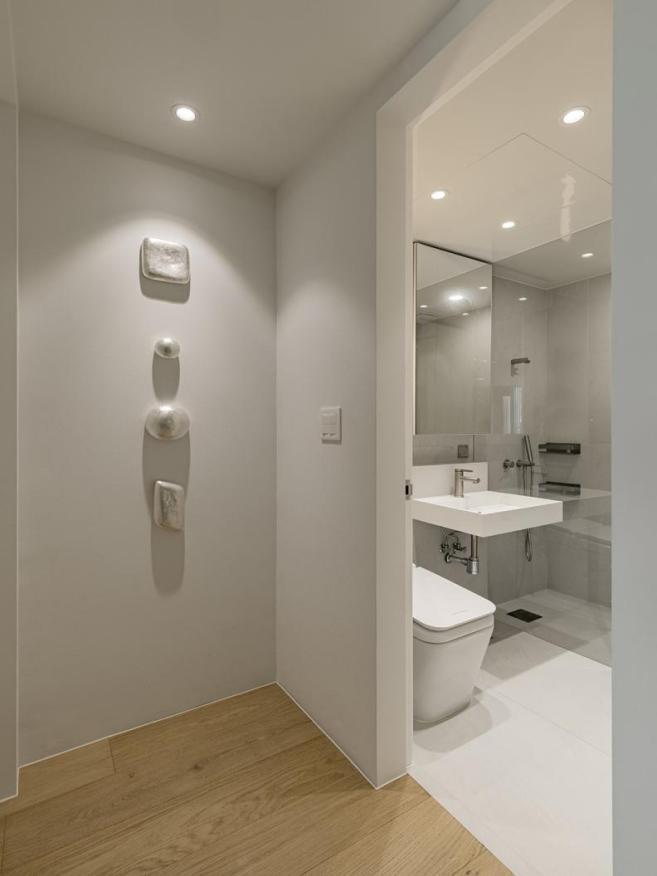卫生间2 进屋向右走,是一个独立的卫生间,主要是起到待客和日常的使用需要。外侧的纯色墙面上增加一些白色系、带有珠光材质的装饰,艺术品在LED灯光下更显精致。里侧的布局也是以灰白色系为主,观感上十分的简约。整个卫生间呈现一个长方形的空间,马桶、洗手台以及淋浴间由外向里依次平行排列,相独立存在,不影响单独的使用。 #洗手间#墙面设计#马桶#地砖