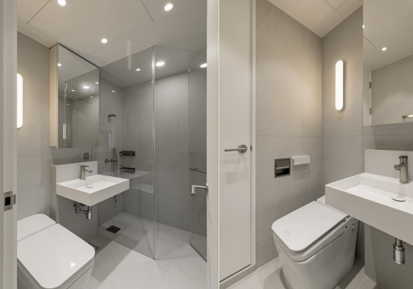 马桶选择纯白的样式,在灰色的墙面瓷砖设计下更为的突出。而洗手台也选择了与马桶同色系,并在样式上选择了最为简约的台盆款。去掉繁琐的橱柜设计,不占过多的空间视角,显得更为的轻便。在镜子的样式选择上选择了镜柜的款式,增加收纳功能,不占据过多的表层空间,更符合屋主对简洁的追求。里侧的淋浴间是透明玻璃门,会减少空间的封闭感,安置的淋浴头是深色系的搭配,耐脏、易于清洁。 #洗手间#马桶#洗手台#淋浴间