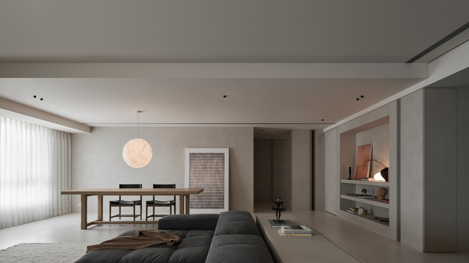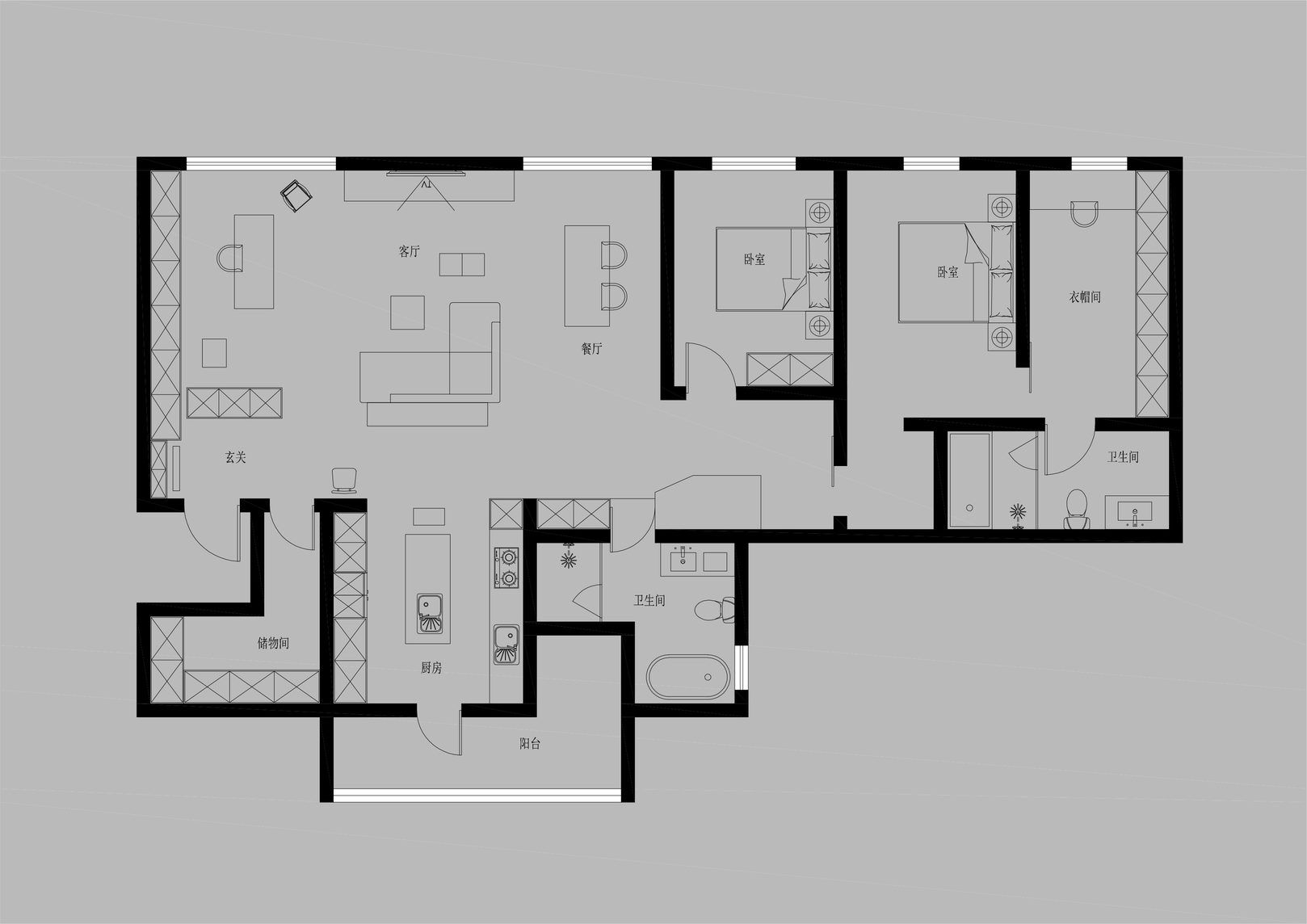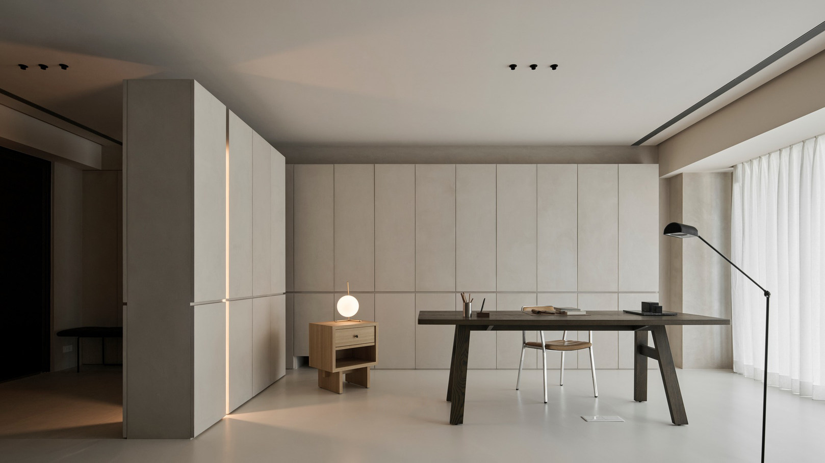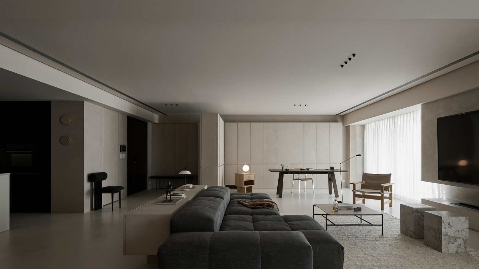 说在前面 该案是为两口之家打造,夫妻二人偏爱简约居家风格,女主人对家具质感有所追求。这是夫妻的第一套房子,通过与他们二人的不断沟通,耐心解答他们的问题和提出一下针对性的建议,让夫妻两人更确定自己想要的生活体验。由此打造出这套兼顾上班族日常与下班后身心放松需求的,既有现代简约的氛围,又呈现居家舒适度的房屋设计。 户型图 ①空间原始结构为二室两厅一厨两卫,房型方正,动线流畅。 ②客厅与餐厅的视野联通,通透性墙,采光条件好。 ③厨房通向阳台,半开放式的设计, ④书房邻近客厅,做成开放式的设计,视野更加开阔,能将朝向的优势得到最大化的利用。 ⑤卧室有两间,次卧用作客房,主卧自带卫生间与衣帽间,功能充足,空间规划有条理。 玄关 入户是一个开放式的玄关空间,橱柜选择简约的浅色系,通过对光线的调控,打造出视觉上的明暗面,减少单一色调的沉闷,而且为屋主提供了充裕的收纳空间来存放鞋具,简约大方的外观下兼具生活的便利性。 #玄关 玄关通向屋内的长廊,整体视野开阔,将客厅、餐厅的布局一览无余,各个区域间相互联系又独立,无吊顶的设计进一步放大视野优势,里侧镶嵌了暖黄色的灯带,条状的直线走向从玄关延展到客厅,视觉动线上达成一致。 #玄关 客厅 客厅位于书房和餐厅之间,中心的位置讲求与两侧区域自然的过渡衔接,不仅要有功能区域上的区分,并且在动线上也相互连接。电视墙面在两扇落地窗的中间,与沙发相对而置。沙发背后摆放了一个近似等高的长方形置物桌,纯白的外观干净又大方,内置不同样式的抽屉格,满足屋主多样的收纳需求。 #客厅 沙发在样式上选择深灰色的布艺绒面款,经典的深色系,沉稳大气。地面上平铺着浅灰色的毛绒地铁,增加局部的层次感。有一张四边形的茶几,大方不失简约的设计。 #客厅#沙发 电视悬挂在墙上,减少对空间台面的表层占用。设计了镂空式的电视柜,能提供一定的收纳空间。底座的收纳也沿用隐形抽屉的设计,视觉上不占据过多空间,给人洁净、舒服的观感。 #客厅 电视墙一侧的线路做了隐藏收纳,视觉效果上更简约干净,墙体做了不规则的封边,两侧挖空做开放式的柜身,下方也预留一层开放格,避免整面橱柜带来的闭塞感,注入更多轻盈氧气。 #客厅 客厅与书房一起采用了统一的无主灯设计。这样能拉高空间的纵向视野,更显开阔,为空间提供纯色简约背景板,在视觉上做减法,整体效果呈现上轻盈大方。 #客厅#无主灯 在软装的选择上,选择简约样式的家具。一盏线性落地灯摆放在靠背椅的一侧,讲简约的线条美传递的淋漓尽致。另一侧的餐椅采用原木的支架设计,搭配轻薄软垫,多种元素汇集而成的家具为屋主提供多样不繁重的装饰特色 餐厅 以客厅为中心,右侧的开放空间便是餐厅的区域。在吊顶内安置全屋新风系统,墙壁粉刷上统一使用纯白简约色系,色彩搭配上更和谐。 #餐厅#空间设计 一张长方形餐桌摆放在中间的位置,原木材质传递出朴实敦厚的质感,结实耐用。外观上是简单的线条勾勒,餐椅同样选择原木的材质,深棕红木的选色与餐桌的配色进行色彩上的递进,风格上从简却不显单调。 #餐厅#餐桌 餐厅背后的纯色背景墙为空间做出适当的留白,一张屋主装裱的画框在一旁落地放置,点缀着空白的墙面。餐桌上方搭配了的是野口勇纸灯,暖黄色的灯光加上新中式风格的元素,与餐桌一同渲染着淳朴恬静的美好氛围。 #餐厅#吊灯 厨房 厨房在沙发后方,充裕的空间为厨房的动线设计提供更多的可能。整体采用开放式设计,外侧的一面无需墙体或者门窗的间隔,直接与客厅、餐厅区域进行自然的联动。 #厨房#开放式厨房 厨房出口处墙框的收边采用同色系的搭配,视觉上自然过渡,不显突兀,区域分工合理,烹饪动线不易打乱,并且搭配灯带,提高屋主的烹饪体验感。 #厨房#开放式厨房 卧室 卧室在选色上偏重白色简约系列,营造出纯净的观感。整体布局上分为睡眠休息区、衣帽间与独卫三个不同的功能侧重。舒适的双人床靠着白色的橱柜放置,浅灰色的床品低调沉稳,色彩搭配上十分和谐,效果呈现极佳观感。 #卧室 床头采用黑色双层简约款式,不会占据过多的空间,同时既有方便日常置物的开放式台面,也有保护隐私、防灰防尘的封闭式抽屉,满足屋主不同的收纳需求。 #卧室#床头柜 床尾角落放置一个原木的靠背餐椅,凸显质感的肌理搭配方正的外形,一旁搭配了一盏简易样式的落地灯,黑色的选色含蓄低调。白色大理石纹路的小台桌,可以放置书籍杂物,打造出一个幽静舒适的阅读休闲区。 #卧室 书房 顺着客厅向左侧的方向,是书房的区域。考虑到分区的过渡以及对朝向优势的利用,在书房设计上采用半开放的形式。书橱柜定制成L型环绕在书桌一方,纯白色系简约干净,与整屋的色彩相适宜。 #书房 长方形的书桌选择深色原木材质彰显独到质感。搭配上白色的靠背椅,简约的配色与整体氛围相得益彰。左侧添置原木材质的置屋桌加以装饰,上方搭配的暖黄色台灯烘托温馨色彩。 #书房#书桌 书房区域整体简约自然,沿线视野更为开阔通透。落地窗一侧安置电动窗帘保护屋内隐私,另一侧的橱柜间隙镶嵌了暖黄色的灯带,与玄关空间进行联动。 #书房 卫生间 卫生间的空间十分充裕,分为浴缸,泡澡区,淋浴间,洗手台以及马桶四个区域。在用材选色采用近似纯白