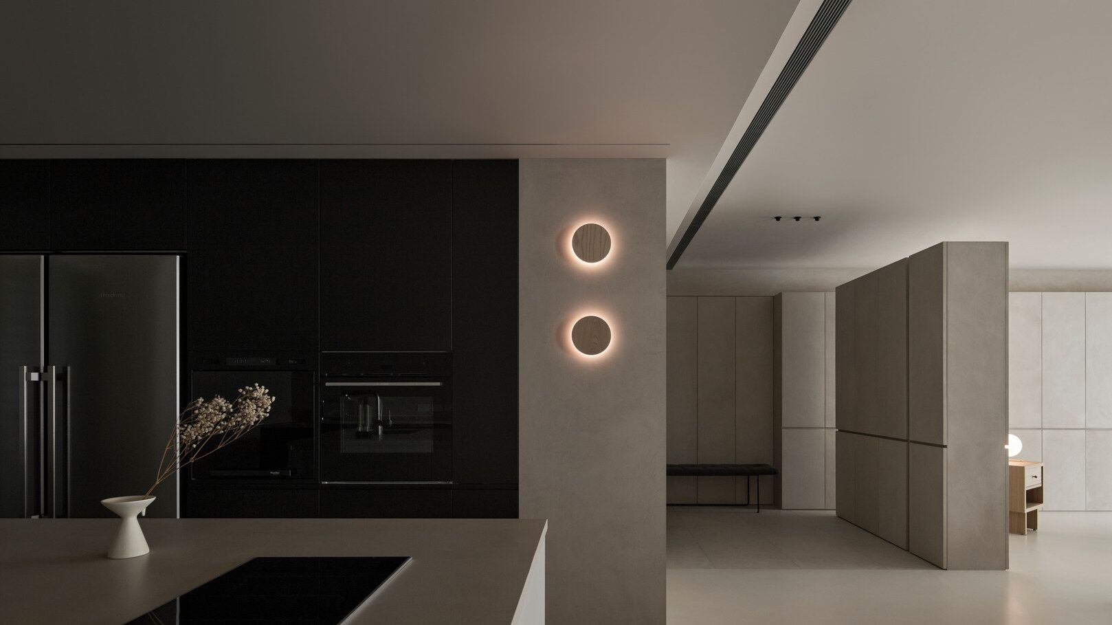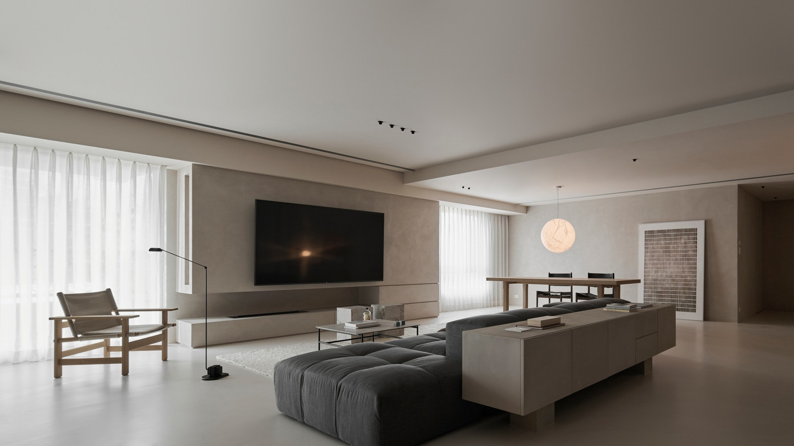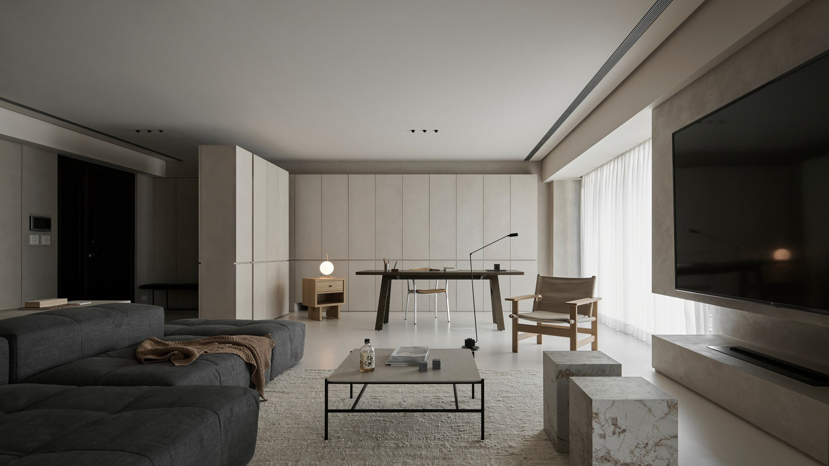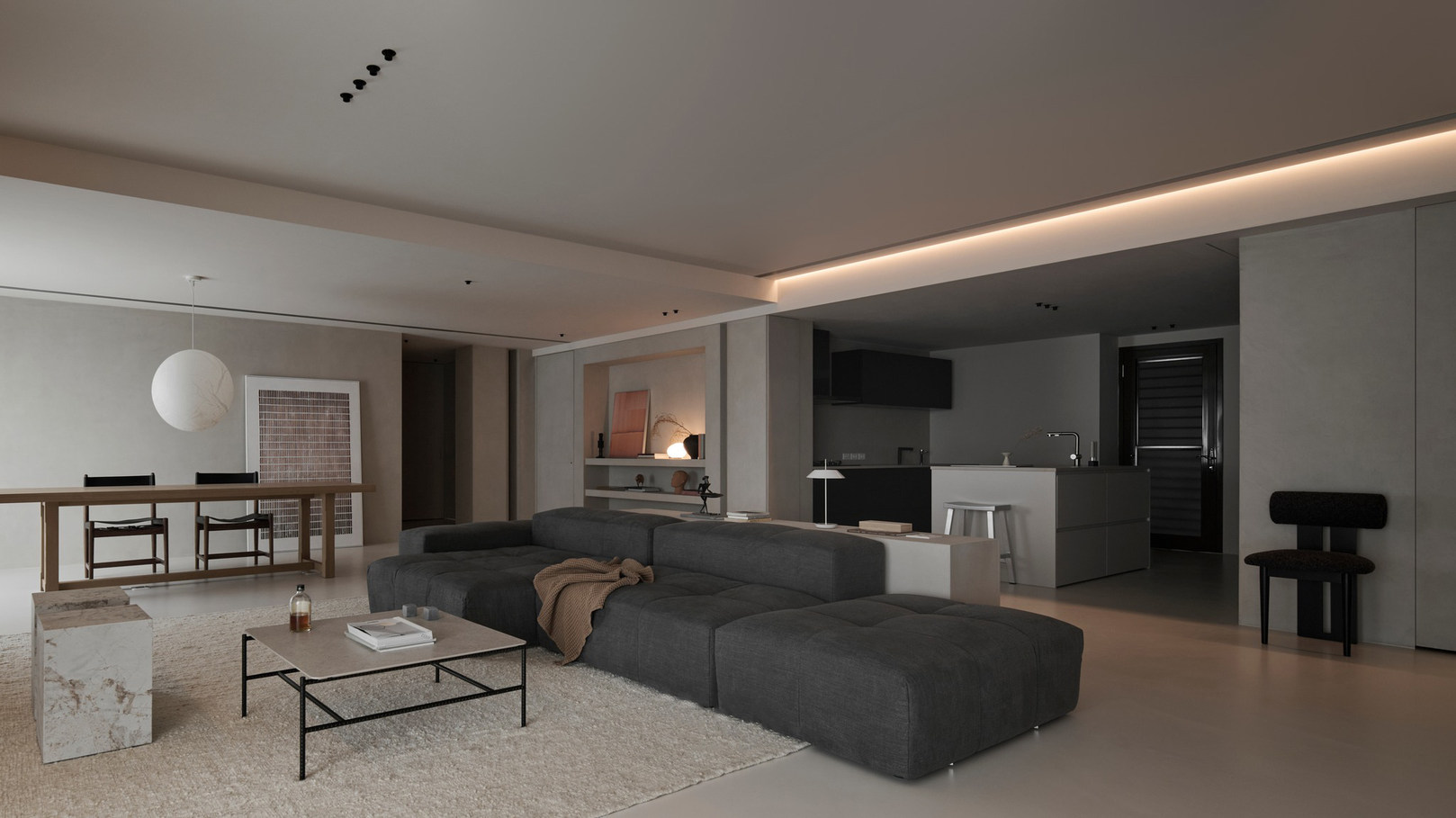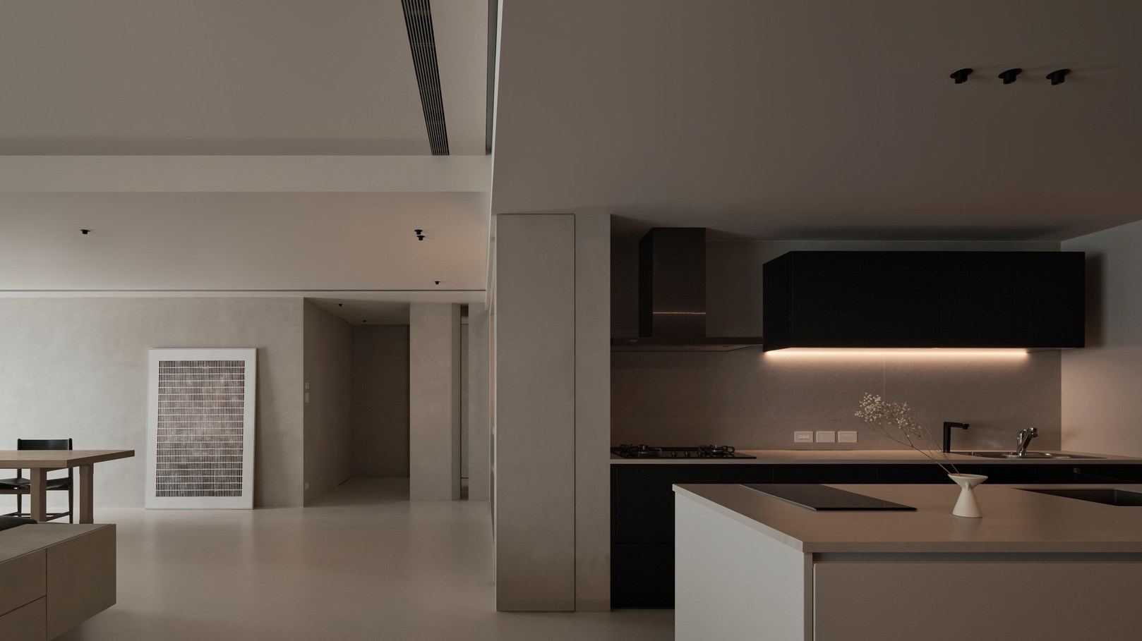 说在前面 该案是为两口之家打造,夫妻二人偏爱简约居家风格,女主人对家具质感有所追求。这是夫妻的第一套房子,通过与他们二人的不断沟通,耐心解答他们的问题和提出一下针对性的建议,让夫妻两人更确定自己想要的生活体验。由此打造出这套兼顾上班族日常与下班后身心放松需求的,既有现代简约的氛围,又呈现居家舒适度的房屋设计。 户型图 ①空间原始结构为二室两厅一厨两卫,房型方正,动线流畅。 ②客厅与餐厅的视野联通,通透性墙,采光条件好。 ③厨房通向阳台,半开放式的设计, ④书房邻近客厅,做成开放式的设计,视野更加开阔,能将朝向的优势得到最大化的利用。 ⑤卧室有两间,次卧用作客房,主卧自带卫生间与衣帽间,功能充足,空间规划有条理。 玄关 入户是一个开放式的玄关空间,橱柜选择简约的浅色系,通过对光线的调控,打造出视觉上的明暗面,减少单一色调的沉闷,而且为屋主提供了充裕的收纳空间来存放鞋具,简约大方的外观下兼具生活的便利性。 #玄关 玄关通向屋内的长廊,整体视野开阔,将客厅、餐厅的布局一览无余,各个区域间相互联系又独立,无吊顶的设计进一步放大视野优势,里侧镶嵌了暖黄色的灯带,条状的直线走向从玄关延展到客厅,视觉动线上达成一致。 #玄关 客厅 客厅位于书房和餐厅之间,中心的位置讲求与两侧区域自然的过渡衔接,不仅要有功能区域上的区分,并且在动线上也相互连接。电视墙面在两扇落地窗的中间,与沙发相对而置。沙发背后摆放了一个近似等高的长方形置物桌,纯白的外观干净又大方,内置不同样式的抽屉格,满足屋主多样的收纳需求。 #客厅 沙发在样式上选择深灰色的布艺绒面款,经典的深色系,沉稳大气。地面上平铺着浅灰色的毛绒地铁,增加局部的层次感。有一张四边形的茶几,大方不失简约的设计。 #客厅#沙发 电视悬挂在墙上,减少对空间台面的表层占用。设计了镂空式的电视柜,能提供一定的收纳空间。底座的收纳也沿用隐形抽屉的设计,视觉上不占据过多空间,给人洁净、舒服的观感。 #客厅 电视墙一侧的线路做了隐藏收纳,视觉效果上更简约干净,墙体做了不规则的封边,两侧挖空做开放式的柜身,下方也预留一层开放格,避免整面橱柜带来的闭塞感,注入更多轻盈氧气。 #客厅 客厅与书房一起采用了统一的无主灯设计。这样能拉高空间的纵向视野,更显开阔,为空间提供纯色简约背景板,在视觉上做减法,整体效果呈现上轻盈大方。 #客厅#无主灯 在软装的选择上,选择简约样式的家具。一盏线性落地灯摆放在靠背椅的一侧,讲简约的线条美传递的淋漓尽致。另一侧的餐椅采用原木的支架设计,搭配轻薄软垫,多种元素汇集而成的家具为屋主提供多样不繁重的装饰特色 餐厅 以客厅为中心,右侧的开放空间便是餐厅的区域。在吊顶内安置全屋新风系统,墙壁粉刷上统一使用纯白简约色系,色彩搭配上更和谐。 #餐厅#空间设计 一张长方形餐桌摆放在中间的位置,原木材质传递出朴实敦厚的质感,结实耐用。外观上是简单的线条勾勒,餐椅同样选择原木的材质,深棕红木的选色与餐桌的配色进行色彩上的递进,风格上从简却不显单调。 #餐厅#餐桌 餐厅背后的纯色背景墙为空间做出适当的留白,一张屋主装裱的画框在一旁落地放置,点缀着空白的墙面。餐桌上方搭配了的是野口勇纸灯,暖黄色的灯光加上新中式风格的元素,与餐桌一同渲染着淳朴恬静的美好氛围。 #餐厅#吊灯 厨房 厨房在沙发后方,充裕的空间为厨房的动线设计提供更多的可能。整体采用开放式设计,外侧的一面无需墙体或者门窗的间隔,直接与客厅、餐厅区域进行自然的联动。 #厨房#开放式厨房 厨房出口处墙框的收边采用同色系的搭配,视觉上自然过渡,不显突兀,区域分工合理,烹饪动线不易打乱,并且搭配灯带,提高屋主的烹饪体验感。 #厨房#开放式厨房 卧室 卧室在选色上偏重白色简约系列,营造出纯净的观感。整体布局上分为睡眠休息区、衣帽间与独卫三个不同的功能侧重。舒适的双人床靠着白色的橱柜放置,浅灰色的床品低调沉稳,色彩搭配上十分和谐,效果呈现极佳观感。 #卧室 床头采用黑色双层简约款式,不会占据过多的空间,同时既有方便日常置物的开放式台面,也有保护隐私、防灰防尘的封闭式抽屉,满足屋主不同的收纳需求。 #卧室#床头柜 床尾角落放置一个原木的靠背餐椅,凸显质感的肌理搭配方正的外形,一旁搭配了一盏简易样式的落地灯,黑色的选色含蓄低调。白色大理石纹路的小台桌,可以放置书籍杂物,打造出一个幽静舒适的阅读休闲区。 #卧室 书房 顺着客厅向左侧的方向,是书房的区域。考虑到分区的过渡以及对朝向优势的利用,在书房设计上采用半开放的形式。书橱柜定制成L型环绕在书桌一方,纯白色系简约干净,与整屋的色彩相适宜。 #书房 长方形的书桌选择深色原木材质彰显独到质感。搭配上白色的靠背椅,简约的配色与整体氛围相得益彰。左侧添置原木材质的置屋桌加以装饰,上方搭配的暖黄色台灯烘托温馨色彩。 #书房#书桌 书房区域整体简约自然,沿线视野更为开阔通透。落地窗一侧安置电动窗帘保护屋内隐私,另一侧的橱柜间隙镶嵌了暖黄色的灯带,与玄关空间进行联动。 #书房 卫生间 卫生间的空间十分充裕,分为浴缸,泡澡区,淋浴间,洗手台以及马桶四个区域。在用材选色采用近似纯白