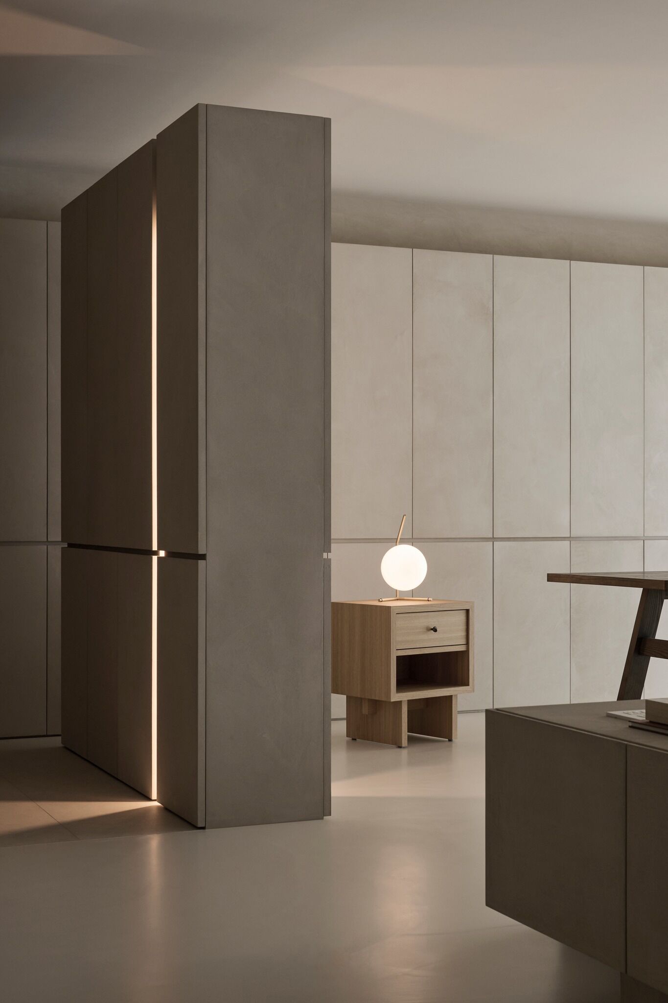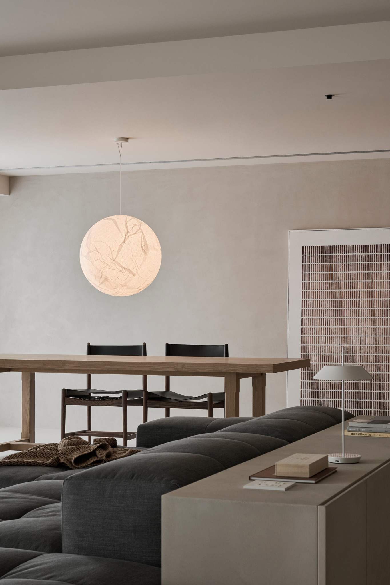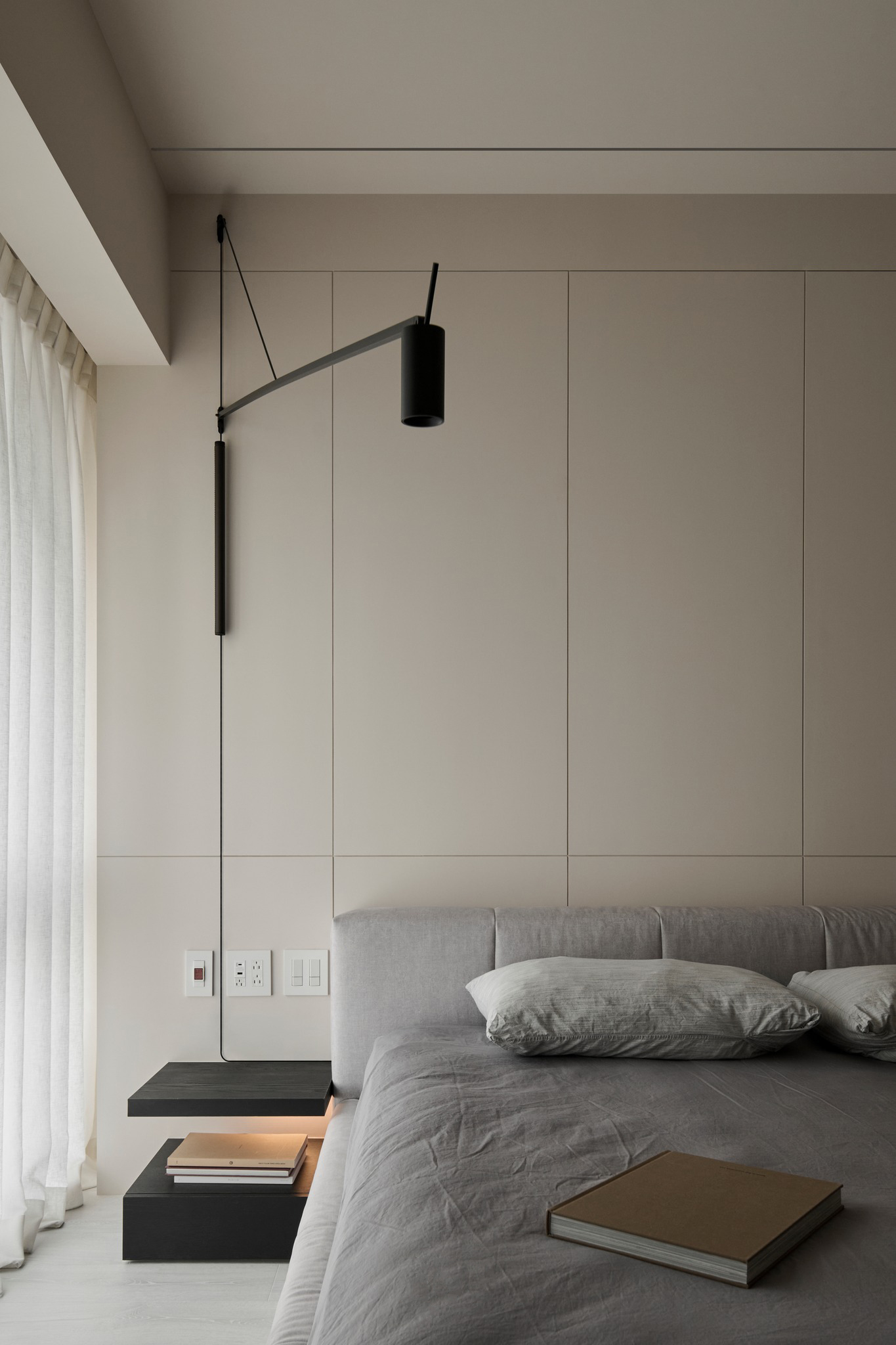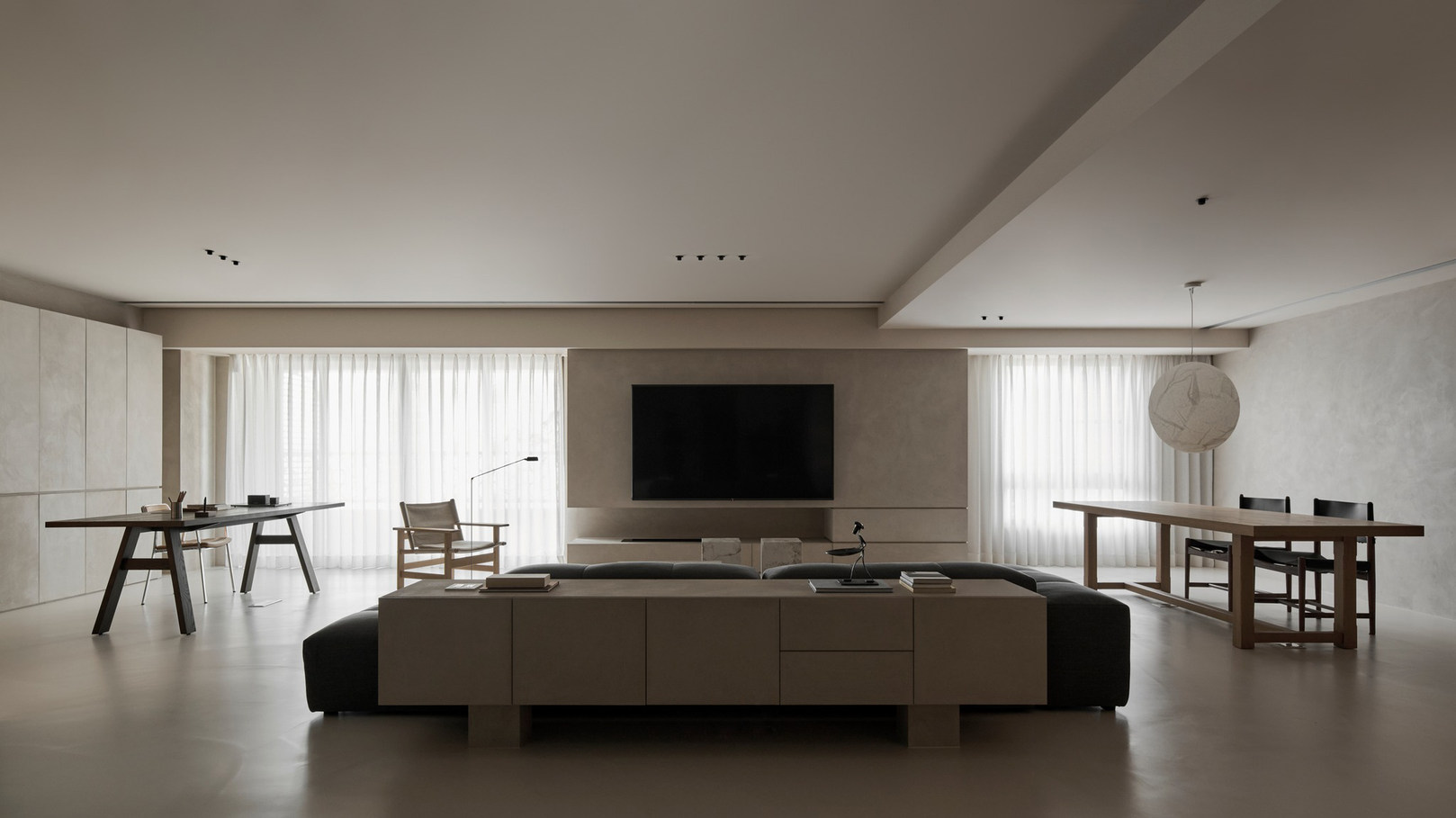 说在前面 该案是为两口之家打造,夫妻二人偏爱简约居家风格,女主人对家具质感有所追求。这是夫妻的第一套房子,通过与他们二人的不断沟通,耐心解答他们的问题和提出一下针对性的建议,让夫妻两人更确定自己想要的生活体验。由此打造出这套兼顾上班族日常与下班后身心放松需求的,既有现代简约的氛围,又呈现居家舒适度的房屋设计。 户型图 ①空间原始结构为二室两厅一厨两卫,房型方正,动线流畅。 ②客厅与餐厅的视野联通,通透性墙,采光条件好。 ③厨房通向阳台,半开放式的设计, ④书房邻近客厅,做成开放式的设计,视野更加开阔,能将朝向的优势得到最大化的利用。 ⑤卧室有两间,次卧用作客房,主卧自带卫生间与衣帽间,功能充足,空间规划有条理。 玄关 入户是一个开放式的玄关空间,橱柜选择简约的浅色系,通过对光线的调控,打造出视觉上的明暗面,减少单一色调的沉闷,而且为屋主提供了充裕的收纳空间来存放鞋具,简约大方的外观下兼具生活的便利性。 #玄关 玄关通向屋内的长廊,整体视野开阔,将客厅、餐厅的布局一览无余,各个区域间相互联系又独立,无吊顶的设计进一步放大视野优势,里侧镶嵌了暖黄色的灯带,条状的直线走向从玄关延展到客厅,视觉动线上达成一致。 #玄关 客厅 客厅位于书房和餐厅之间,中心的位置讲求与两侧区域自然的过渡衔接,不仅要有功能区域上的区分,并且在动线上也相互连接。电视墙面在两扇落地窗的中间,与沙发相对而置。沙发背后摆放了一个近似等高的长方形置物桌,纯白的外观干净又大方,内置不同样式的抽屉格,满足屋主多样的收纳需求。 #客厅 沙发在样式上选择深灰色的布艺绒面款,经典的深色系,沉稳大气。地面上平铺着浅灰色的毛绒地铁,增加局部的层次感。有一张四边形的茶几,大方不失简约的设计。 #客厅#沙发 电视悬挂在墙上,减少对空间台面的表层占用。设计了镂空式的电视柜,能提供一定的收纳空间。底座的收纳也沿用隐形抽屉的设计,视觉上不占据过多空间,给人洁净、舒服的观感。 #客厅 电视墙一侧的线路做了隐藏收纳,视觉效果上更简约干净,墙体做了不规则的封边,两侧挖空做开放式的柜身,下方也预留一层开放格,避免整面橱柜带来的闭塞感,注入更多轻盈氧气。 #客厅 客厅与书房一起采用了统一的无主灯设计。这样能拉高空间的纵向视野,更显开阔,为空间提供纯色简约背景板,在视觉上做减法,整体效果呈现上轻盈大方。 #客厅#无主灯 在软装的选择上,选择简约样式的家具。一盏线性落地灯摆放在靠背椅的一侧,讲简约的线条美传递的淋漓尽致。另一侧的餐椅采用原木的支架设计,搭配轻薄软垫,多种元素汇集而成的家具为屋主提供多样不繁重的装饰特色 餐厅 以客厅为中心,右侧的开放空间便是餐厅的区域。在吊顶内安置全屋新风系统,墙壁粉刷上统一使用纯白简约色系,色彩搭配上更和谐。 #餐厅#空间设计 一张长方形餐桌摆放在中间的位置,原木材质传递出朴实敦厚的质感,结实耐用。外观上是简单的线条勾勒,餐椅同样选择原木的材质,深棕红木的选色与餐桌的配色进行色彩上的递进,风格上从简却不显单调。 #餐厅#餐桌 餐厅背后的纯色背景墙为空间做出适当的留白,一张屋主装裱的画框在一旁落地放置,点缀着空白的墙面。餐桌上方搭配了的是野口勇纸灯,暖黄色的灯光加上新中式风格的元素,与餐桌一同渲染着淳朴恬静的美好氛围。 #餐厅#吊灯 厨房 厨房在沙发后方,充裕的空间为厨房的动线设计提供更多的可能。整体采用开放式设计,外侧的一面无需墙体或者门窗的间隔,直接与客厅、餐厅区域进行自然的联动。 #厨房#开放式厨房 厨房出口处墙框的收边采用同色系的搭配,视觉上自然过渡,不显突兀,区域分工合理,烹饪动线不易打乱,并且搭配灯带,提高屋主的烹饪体验感。 #厨房#开放式厨房 卧室 卧室在选色上偏重白色简约系列,营造出纯净的观感。整体布局上分为睡眠休息区、衣帽间与独卫三个不同的功能侧重。舒适的双人床靠着白色的橱柜放置,浅灰色的床品低调沉稳,色彩搭配上十分和谐,效果呈现极佳观感。 #卧室 床头采用黑色双层简约款式,不会占据过多的空间,同时既有方便日常置物的开放式台面,也有保护隐私、防灰防尘的封闭式抽屉,满足屋主不同的收纳需求。 #卧室#床头柜 床尾角落放置一个原木的靠背餐椅,凸显质感的肌理搭配方正的外形,一旁搭配了一盏简易样式的落地灯,黑色的选色含蓄低调。白色大理石纹路的小台桌,可以放置书籍杂物,打造出一个幽静舒适的阅读休闲区。 #卧室 书房 顺着客厅向左侧的方向,是书房的区域。考虑到分区的过渡以及对朝向优势的利用,在书房设计上采用半开放的形式。书橱柜定制成L型环绕在书桌一方,纯白色系简约干净,与整屋的色彩相适宜。 #书房 长方形的书桌选择深色原木材质彰显独到质感。搭配上白色的靠背椅,简约的配色与整体氛围相得益彰。左侧添置原木材质的置屋桌加以装饰,上方搭配的暖黄色台灯烘托温馨色彩。 #书房#书桌 书房区域整体简约自然,沿线视野更为开阔通透。落地窗一侧安置电动窗帘保护屋内隐私,另一侧的橱柜间隙镶嵌了暖黄色的灯带,与玄关空间进行联动。 #书房 卫生间 卫生间的空间十分充裕,分为浴缸,泡澡区,淋浴间,洗手台以及马桶四个区域。在用材选色采用近似纯白