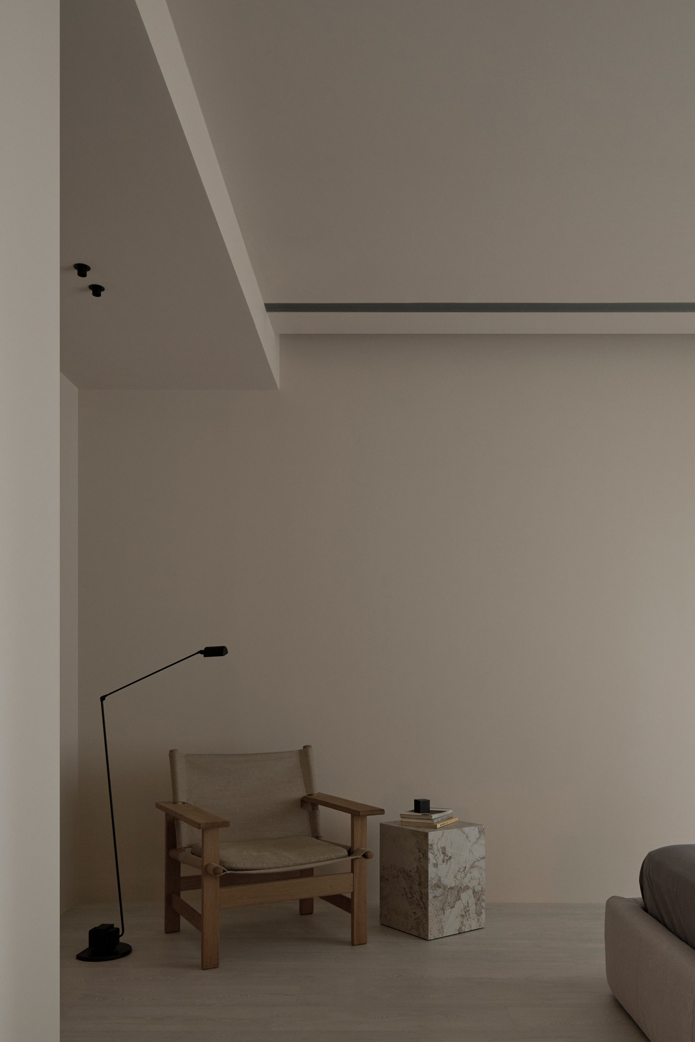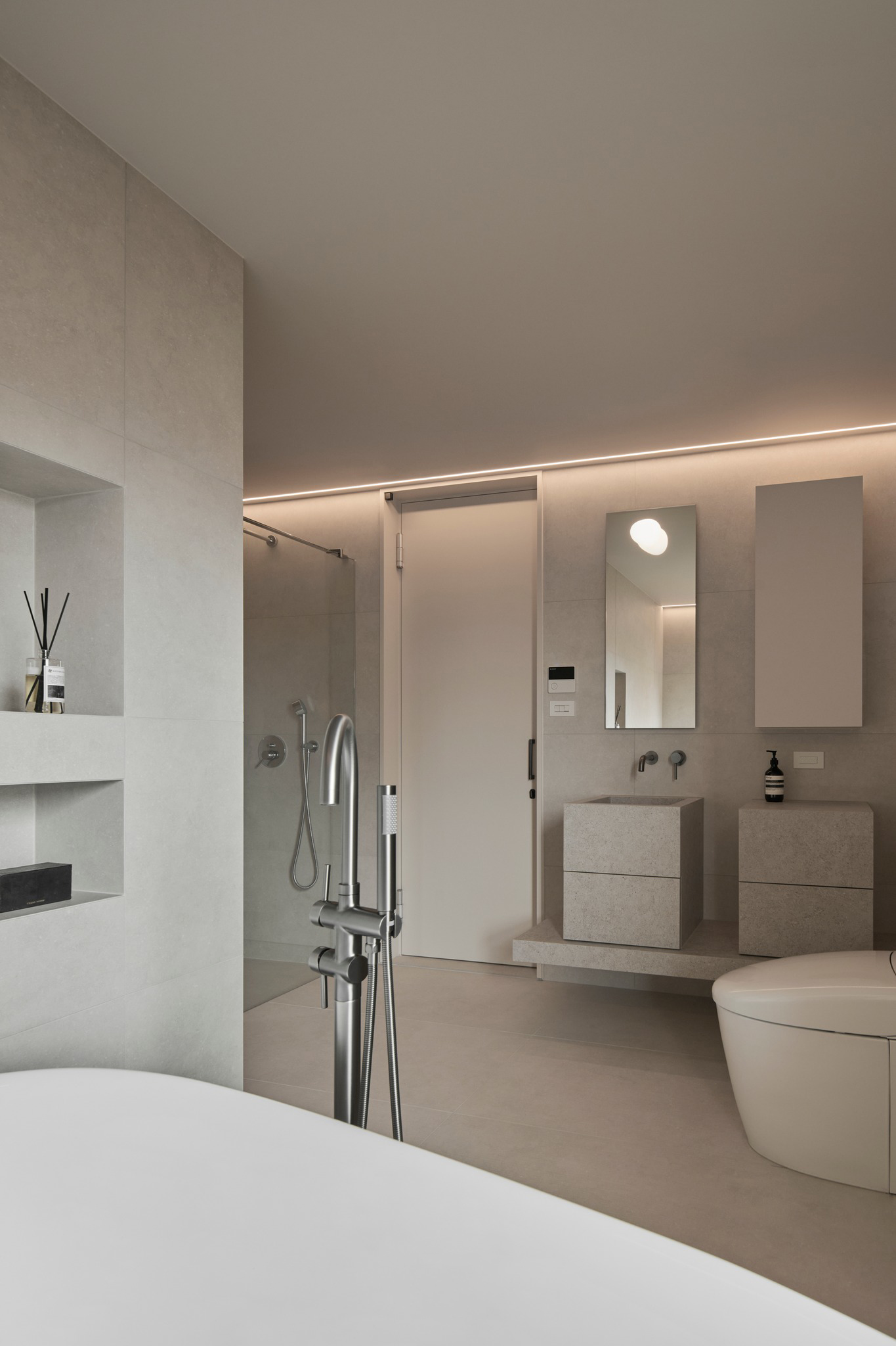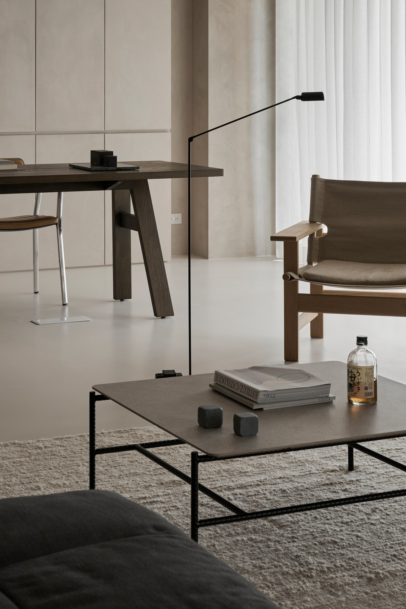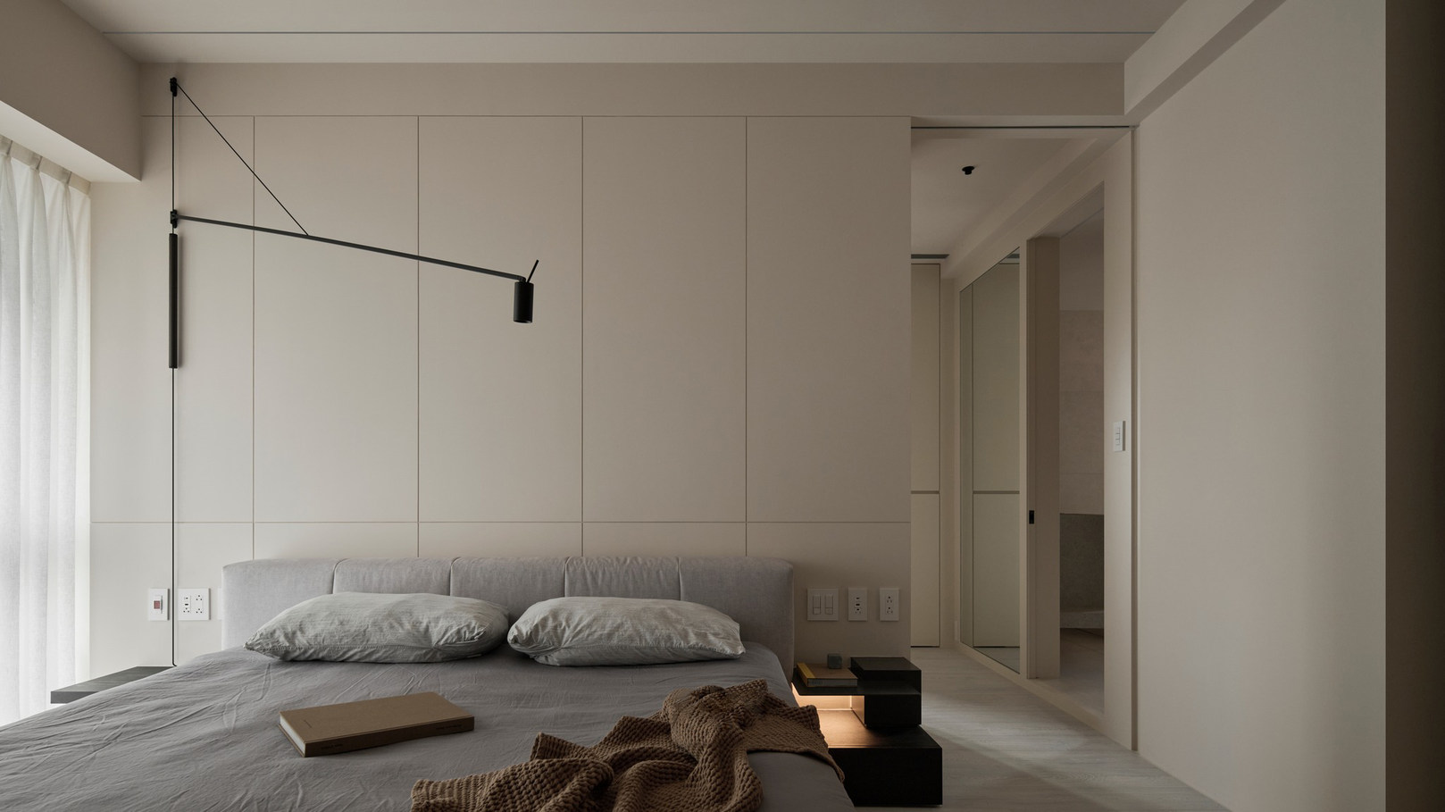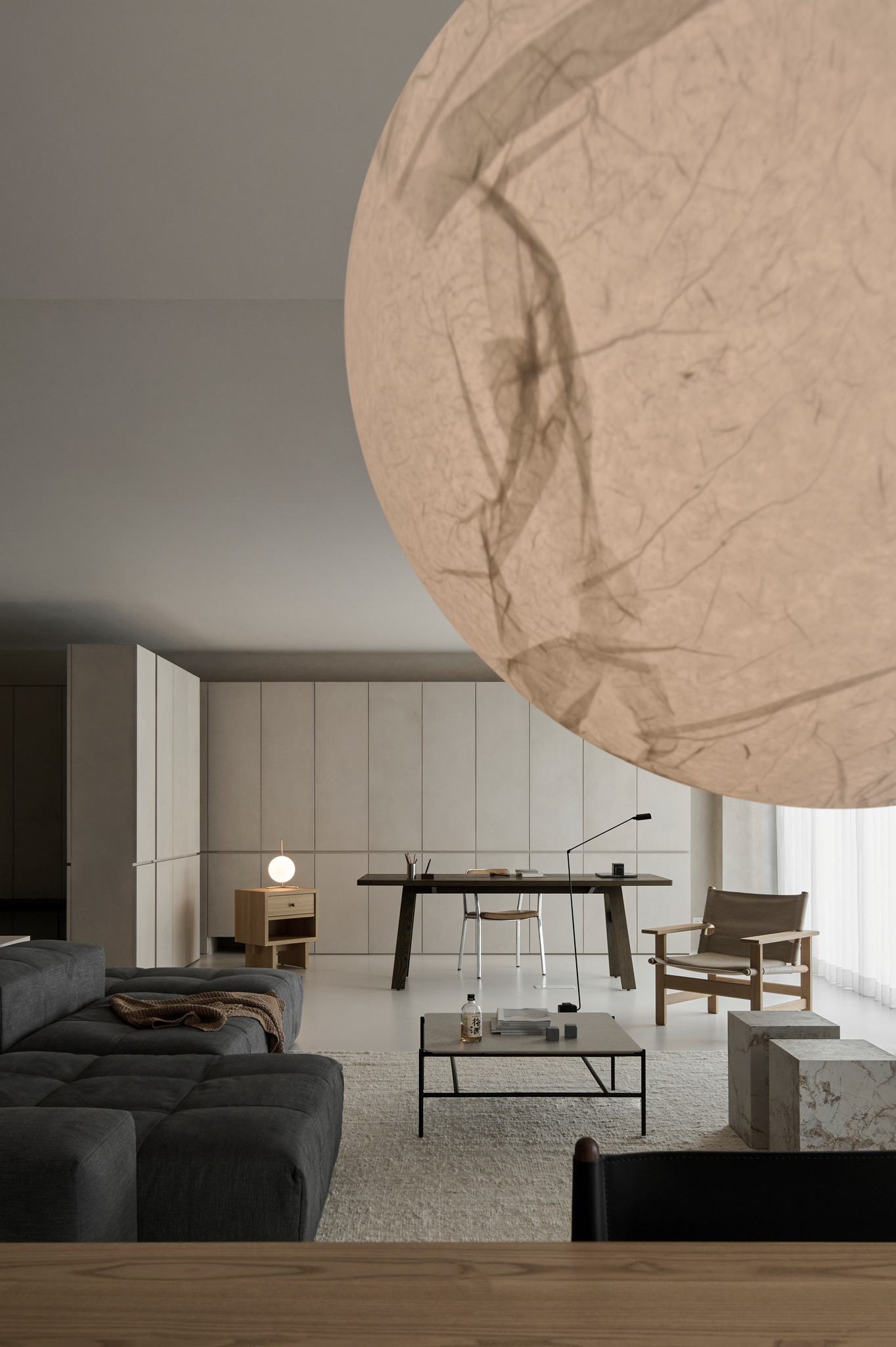 说在前面 该案是为两口之家打造,夫妻二人偏爱简约居家风格,女主人对家具质感有所追求。这是夫妻的第一套房子,通过与他们二人的不断沟通,耐心解答他们的问题和提出一下针对性的建议,让夫妻两人更确定自己想要的生活体验。由此打造出这套兼顾上班族日常与下班后身心放松需求的,既有现代简约的氛围,又呈现居家舒适度的房屋设计。 户型图 ①空间原始结构为二室两厅一厨两卫,房型方正,动线流畅。 ②客厅与餐厅的视野联通,通透性墙,采光条件好。 ③厨房通向阳台,半开放式的设计, ④书房邻近客厅,做成开放式的设计,视野更加开阔,能将朝向的优势得到最大化的利用。 ⑤卧室有两间,次卧用作客房,主卧自带卫生间与衣帽间,功能充足,空间规划有条理。 玄关 入户是一个开放式的玄关空间,橱柜选择简约的浅色系,通过对光线的调控,打造出视觉上的明暗面,减少单一色调的沉闷,而且为屋主提供了充裕的收纳空间来存放鞋具,简约大方的外观下兼具生活的便利性。 #玄关 玄关通向屋内的长廊,整体视野开阔,将客厅、餐厅的布局一览无余,各个区域间相互联系又独立,无吊顶的设计进一步放大视野优势,里侧镶嵌了暖黄色的灯带,条状的直线走向从玄关延展到客厅,视觉动线上达成一致。 #玄关 客厅 客厅位于书房和餐厅之间,中心的位置讲求与两侧区域自然的过渡衔接,不仅要有功能区域上的区分,并且在动线上也相互连接。电视墙面在两扇落地窗的中间,与沙发相对而置。沙发背后摆放了一个近似等高的长方形置物桌,纯白的外观干净又大方,内置不同样式的抽屉格,满足屋主多样的收纳需求。 #客厅 沙发在样式上选择深灰色的布艺绒面款,经典的深色系,沉稳大气。地面上平铺着浅灰色的毛绒地铁,增加局部的层次感。有一张四边形的茶几,大方不失简约的设计。 #客厅#沙发 电视悬挂在墙上,减少对空间台面的表层占用。设计了镂空式的电视柜,能提供一定的收纳空间。底座的收纳也沿用隐形抽屉的设计,视觉上不占据过多空间,给人洁净、舒服的观感。 #客厅 电视墙一侧的线路做了隐藏收纳,视觉效果上更简约干净,墙体做了不规则的封边,两侧挖空做开放式的柜身,下方也预留一层开放格,避免整面橱柜带来的闭塞感,注入更多轻盈氧气。 #客厅 客厅与书房一起采用了统一的无主灯设计。这样能拉高空间的纵向视野,更显开阔,为空间提供纯色简约背景板,在视觉上做减法,整体效果呈现上轻盈大方。 #客厅#无主灯 在软装的选择上,选择简约样式的家具。一盏线性落地灯摆放在靠背椅的一侧,讲简约的线条美传递的淋漓尽致。另一侧的餐椅采用原木的支架设计,搭配轻薄软垫,多种元素汇集而成的家具为屋主提供多样不繁重的装饰特色 餐厅 以客厅为中心,右侧的开放空间便是餐厅的区域。在吊顶内安置全屋新风系统,墙壁粉刷上统一使用纯白简约色系,色彩搭配上更和谐。 #餐厅#空间设计 一张长方形餐桌摆放在中间的位置,原木材质传递出朴实敦厚的质感,结实耐用。外观上是简单的线条勾勒,餐椅同样选择原木的材质,深棕红木的选色与餐桌的配色进行色彩上的递进,风格上从简却不显单调。 #餐厅#餐桌 餐厅背后的纯色背景墙为空间做出适当的留白,一张屋主装裱的画框在一旁落地放置,点缀着空白的墙面。餐桌上方搭配了的是野口勇纸灯,暖黄色的灯光加上新中式风格的元素,与餐桌一同渲染着淳朴恬静的美好氛围。 #餐厅#吊灯 厨房 厨房在沙发后方,充裕的空间为厨房的动线设计提供更多的可能。整体采用开放式设计,外侧的一面无需墙体或者门窗的间隔,直接与客厅、餐厅区域进行自然的联动。 #厨房#开放式厨房 厨房出口处墙框的收边采用同色系的搭配,视觉上自然过渡,不显突兀,区域分工合理,烹饪动线不易打乱,并且搭配灯带,提高屋主的烹饪体验感。 #厨房#开放式厨房 卧室 卧室在选色上偏重白色简约系列,营造出纯净的观感。整体布局上分为睡眠休息区、衣帽间与独卫三个不同的功能侧重。舒适的双人床靠着白色的橱柜放置,浅灰色的床品低调沉稳,色彩搭配上十分和谐,效果呈现极佳观感。 #卧室 床头采用黑色双层简约款式,不会占据过多的空间,同时既有方便日常置物的开放式台面,也有保护隐私、防灰防尘的封闭式抽屉,满足屋主不同的收纳需求。 #卧室#床头柜 床尾角落放置一个原木的靠背餐椅,凸显质感的肌理搭配方正的外形,一旁搭配了一盏简易样式的落地灯,黑色的选色含蓄低调。白色大理石纹路的小台桌,可以放置书籍杂物,打造出一个幽静舒适的阅读休闲区。 #卧室 书房 顺着客厅向左侧的方向,是书房的区域。考虑到分区的过渡以及对朝向优势的利用,在书房设计上采用半开放的形式。书橱柜定制成L型环绕在书桌一方,纯白色系简约干净,与整屋的色彩相适宜。 #书房 长方形的书桌选择深色原木材质彰显独到质感。搭配上白色的靠背椅,简约的配色与整体氛围相得益彰。左侧添置原木材质的置屋桌加以装饰,上方搭配的暖黄色台灯烘托温馨色彩。 #书房#书桌 书房区域整体简约自然,沿线视野更为开阔通透。落地窗一侧安置电动窗帘保护屋内隐私,另一侧的橱柜间隙镶嵌了暖黄色的灯带,与玄关空间进行联动。 #书房 卫生间 卫生间的空间十分充裕,分为浴缸,泡澡区,淋浴间,洗手台以及马桶四个区域。在用材选色采用近似纯白