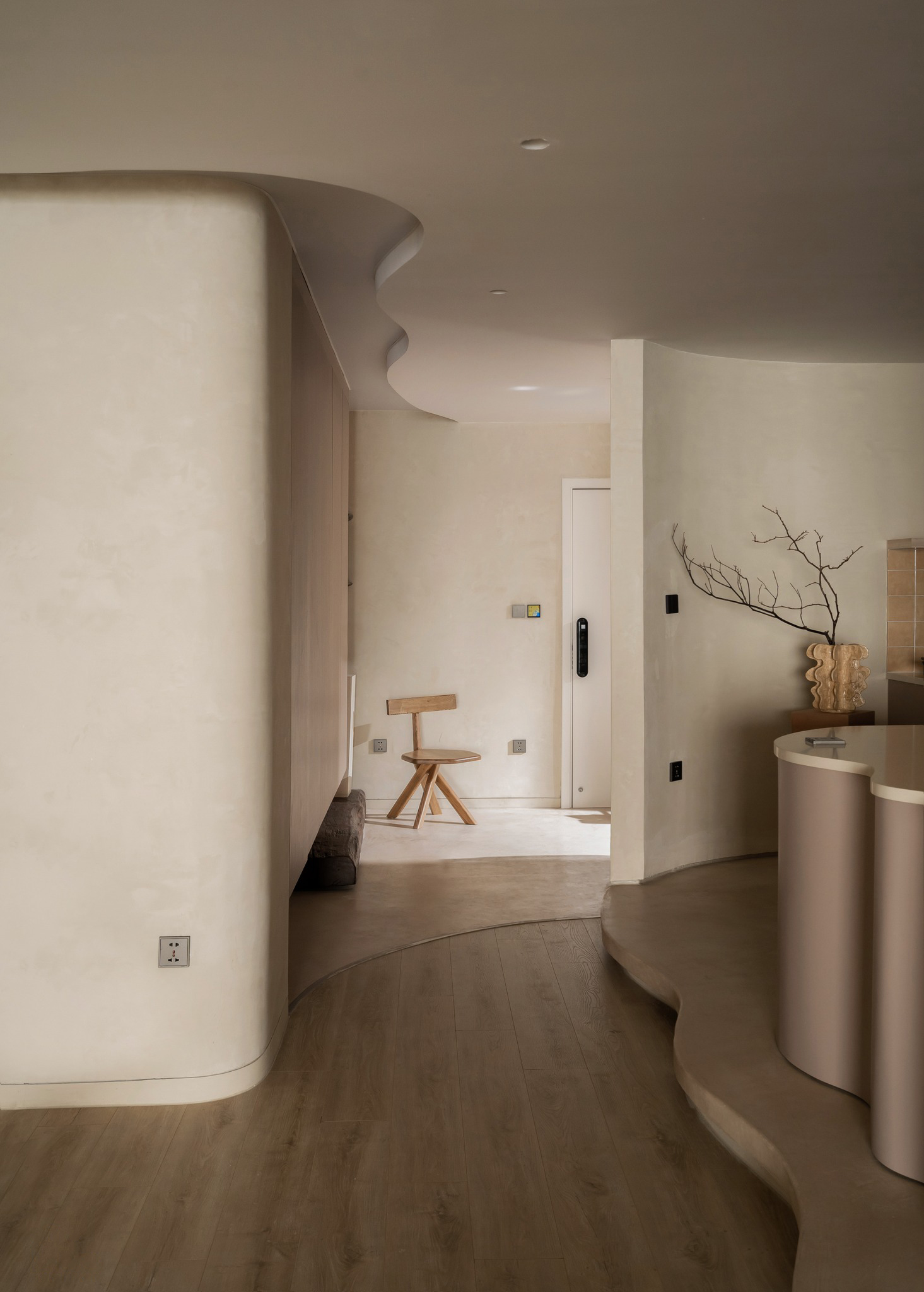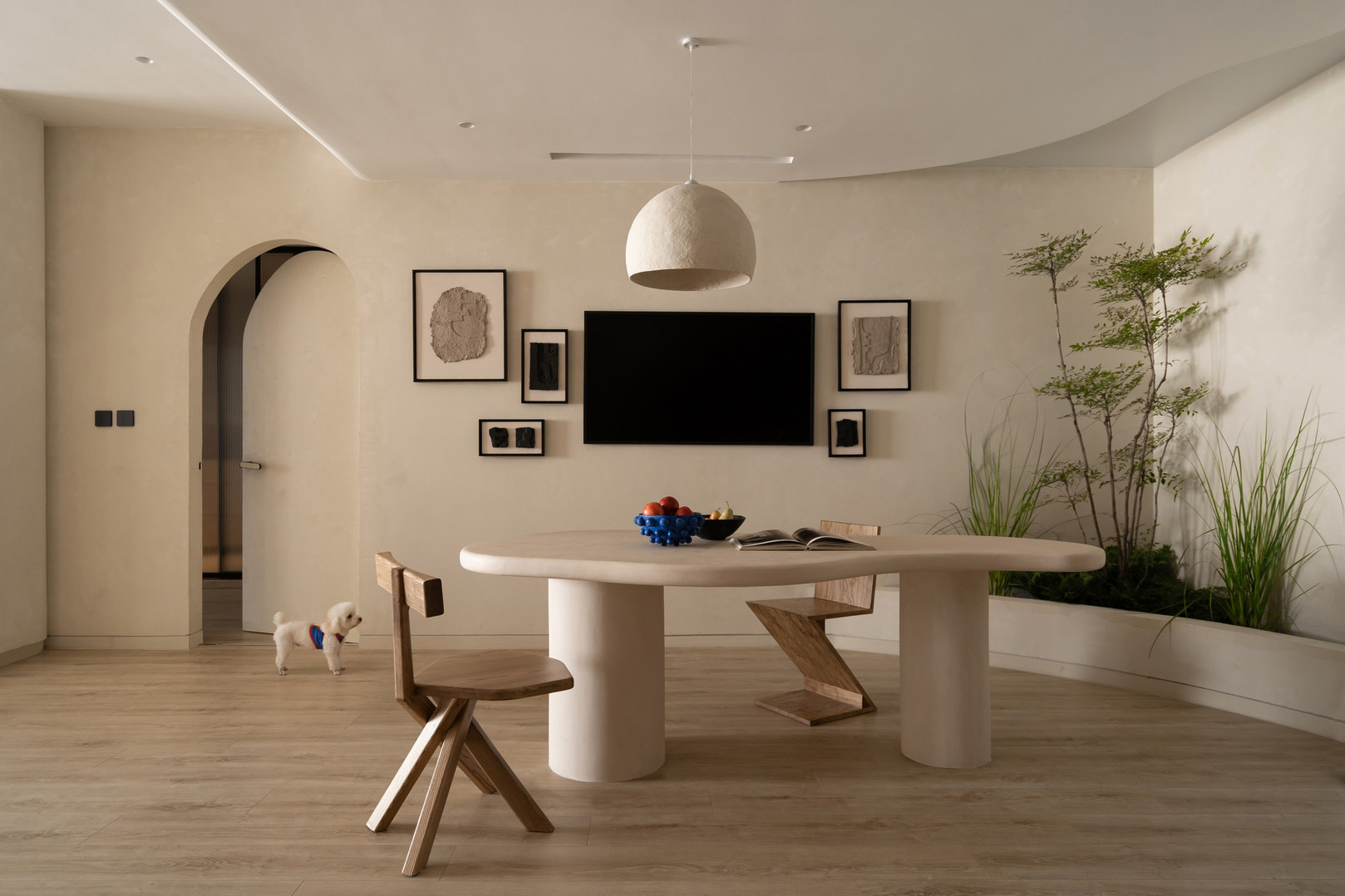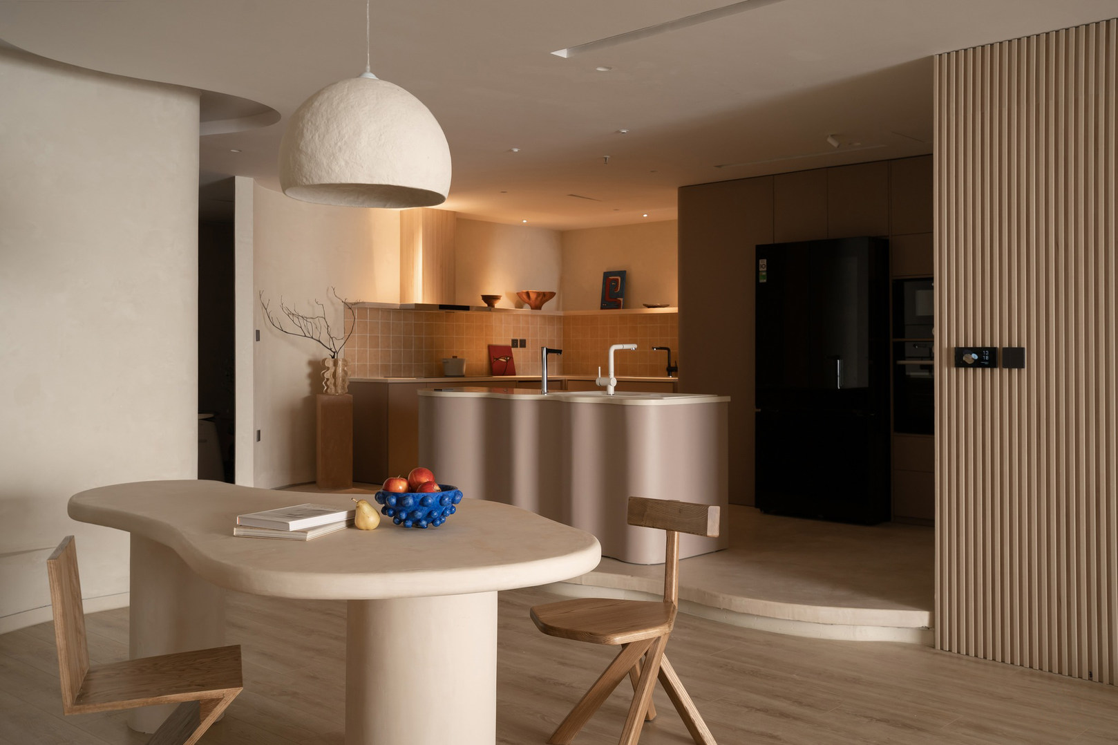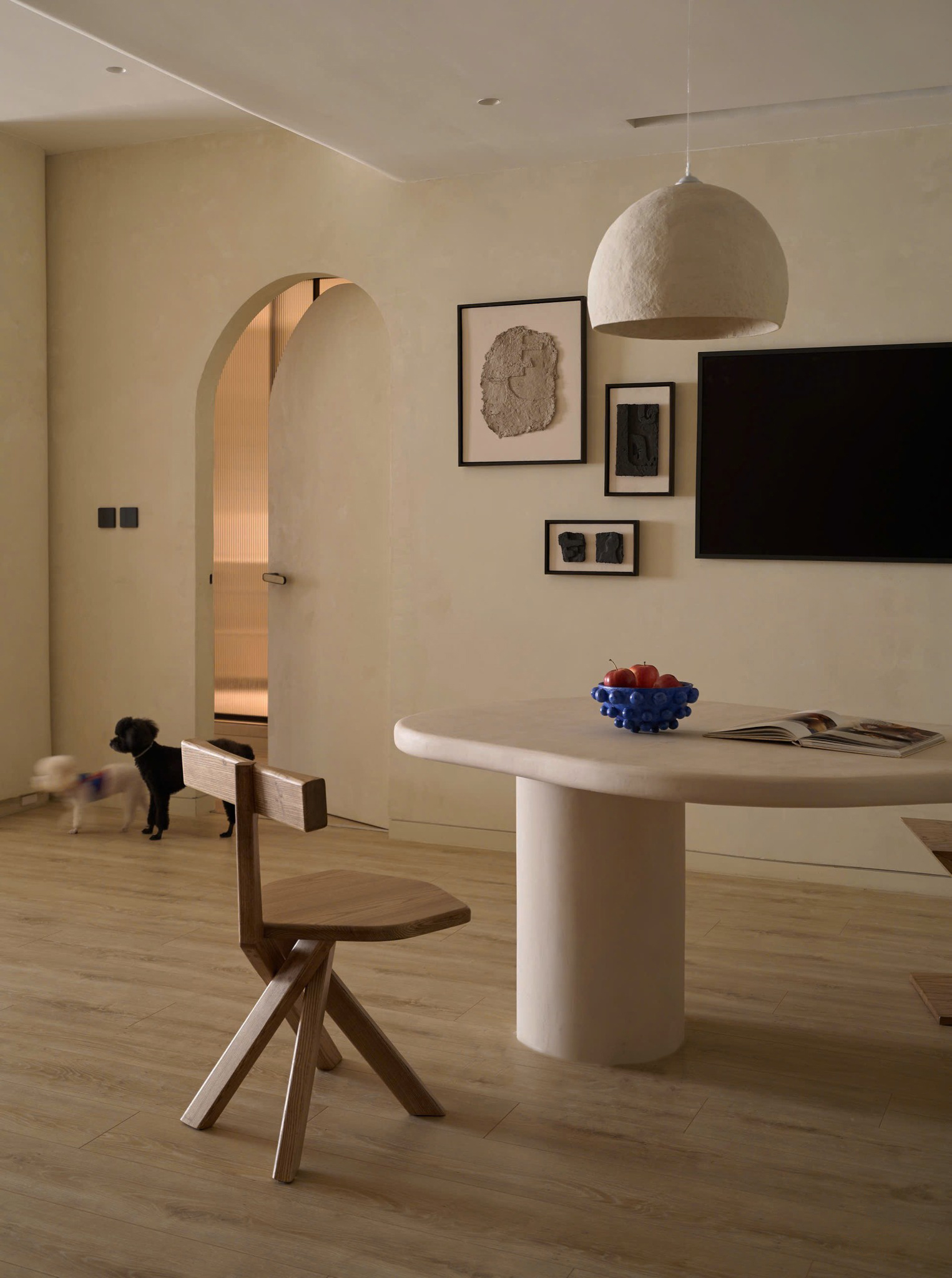 家的简介 家是需要慢慢规划的,从空间布局、功能到风格特质,一切以生活为原点而展开。目前的生活以男女两位业主和两个可爱的小狗构成,生动而活泼。未来的生活依然也在规划之中,小宝宝的到来将为这个家带来全新的感受。设计因此留下了动态可调整的空间,让家完全适应对未来美好生活的憧憬和规划。本案融合奶油色调和轻法元素,以"简约、温馨、实用”为核心,不仅满足了对美学的追求,更兼顾了功能性和舒适性。从玄关的精致设计到客厅的光影艺术,从餐厨一体的便捷布局到卫生间、卧室的个性化打造,每一个细节都经过深思熟虑,为家注入更多的生活气息和功能性。 户型图 1.独立厨房,扩充操作面积,将内部设备区域调整位置。 2.融合为拥有衣帽区,睡眠区,卫生间一体的舒适套房 玄关 通过光的引导,推动进入者往客厅区域行走。鞋柜储物基于墙面延展,通过门廊的矩形限定原木柜体呈现。删繁就简的几何设计语言主导空间的设计理念,从入户的换鞋凳选品开始,异性原木靠背椅,生动真实的纹理还原自然状态,让使用者开放自在。与公区原木地板强调出独立的功能区域性,增强弥漫开来的空间过渡层次。 #玄关 客厅 客厅空间以大面积艺术漆、自然木材、低饱和色相构图来传达主题故事线,克制与舒适的空间美学得以展现。柔软的弧线沙发将不同的功能区域整合为一体,以此为点,呈现出一条自由流动的洄游动线。孩子尽情撒欢,父母开心微笑,独属于空间的“生活方式化"应运而生。 #客厅#沙发 根据夫妻品位爱好,选择去装饰化,还原空间最纯粹的体验感。电视区域以留白加弧形设计 局部优化细节,干净利落的线条框架让深邃感得到进一步延长。利用叠构设计手法,获取立面之间的层次关系,应和为不同部分,但却统一和谐的整体。墙角柔和暖光轻洒,温润质感蔓延。原石艺术摆件静立,放慢脚步,于这静谧角落,邂逅生活本真的宁静与美好。 #客厅#电视背景墙 与次卧门口打造专属屋主的地台小区域,加上一张舒适单人椅,既成为最温暖的休闲阅读角落,上方的筒灯随需求灵活调节光线,让空间晕染上一层柔影,营造平心静气的冥想氛围。同时,基于空间高效利用,沿墙定制装饰画,给单调的空间带来一抹独特,于无形之中巧填一丝温情。 #客厅 餐厅 对形式进行重构,将圆润餐桌的设计融入空间,以新的视角转换内外关系。作为曲形,柔化了空间中方正的矩形元素,吟游感巧妙蕴藏其中,带来行走间的感受变化。餐厅一角规划出方寸绿植区,视觉与自然产生联结,当优渥的光线洒入室内,摇曳的绿植释放出绝佳的舒适度,全然模糊了自然与空间之间的边界。 #餐厅#绿植 餐厅空间整体运用米色调,以极简的设计手法,椭圆餐桌混搭餐椅赋予家居三餐四季。留空设计减轻传统餐桌厚重感更显轻盈,有序的空间便于通行形成自由通达整体格局。吊灯置于上方,半圆外形增加空间功能性同时提高视觉美感。餐厅区域点缀设计感壁画,墙面悬挂电视,用餐、观影两不误。 #餐厅#餐桌 圆润的弧线餐桌四面可以灵活围坐,使用功能得以延伸。不再只局限于单一的用餐属性,阅读、办公都可以满足。以此为点,与客厅、饮水吧台、厨房区域形成有趣、流动的自由洄游动线。 #餐厅 厨房 地台隔离出烹饪区,开放通透的布局,形成以中岛为核心的动线,屋主烹调料理时,能与在客餐厅的家人互动。大理石纹理与咖调岩板注入朴雅质感,让烹饪成为一种疗愈的享受。而顶部通过散点照明设计烘托舒适,静谧,温暖的互动氛围,任时光流转,一刻即是永恒。 #厨房#开放式厨房 厨房去掉多余隔墙,改为开放式布局,经由紧贴墙面的L型橱柜延伸暗示,自然过渡到中岛餐厅空间,用减法设计优化公区的动线和采光。同时为解决烟道移位的问题,精心挑选强力吸油烟机,并细化烟管排布,油烟不倒灌的同时演绎简洁利落的设计美感。 #厨房#开放式厨房 厨房延续外部,以素雅简爽的浅咖色为空间色调,厨台,水槽,电器,收纳于一体,充分满足日常使用需求。长方形的岛台采用大理石的台面,利于日常的清洁工作。增添洗手台,加以分担橱柜的使用压力。靠墙一侧是一个嵌入式的收纳区,深色调的选色与橱柜形成对比,可放置家电。实用的储物空间和操作台,让屋主在烹饪时更加得心应手。 #厨房#开放式厨房 卧室 主卧的位置尤为独特,它处于公区搭建部分。在这里,构建了一个多功能套间形式,包含寝居,卫浴以及衣帽区。整体的设计上,将一切材质与元素都回归最简状态。天然原木地板通铺,质感细腻,给人以充分的安全感,能让睡眠更加安稳。温馨且中性的色调,使人放松心情,回归身体与内心的私密之处。家,在这里真正承托人的一切。 #卧室 忙碌了一天后,卧室便成为了身心放松的港湾。可靠的色调拥有绝对安定的舒缓力,米白色为简约空间提升温暖质感,并与灰色,木色搭配形成优雅沉稳的层次视觉。一张舒适的双人床靠墙放置在邻窗的位置。床头的墙面选择米白色的暖色调加以粉刷,增添温馨感。同时,搭配上舒适的床品,营造出一种安逸温馨的氛围。 #卧室 卫生间 卫生间采用干湿分离的布局,浴缸,洗漱台和马桶区分别位于不同的区域,且各自独立。其中,洗漱台借鉴酒店的风格,大理石的质地,白色台面干净易清洁,上方安装一盏浴室镜方便日常使用也能反射光线扩大卫生间内部视野。 #卫生间 |