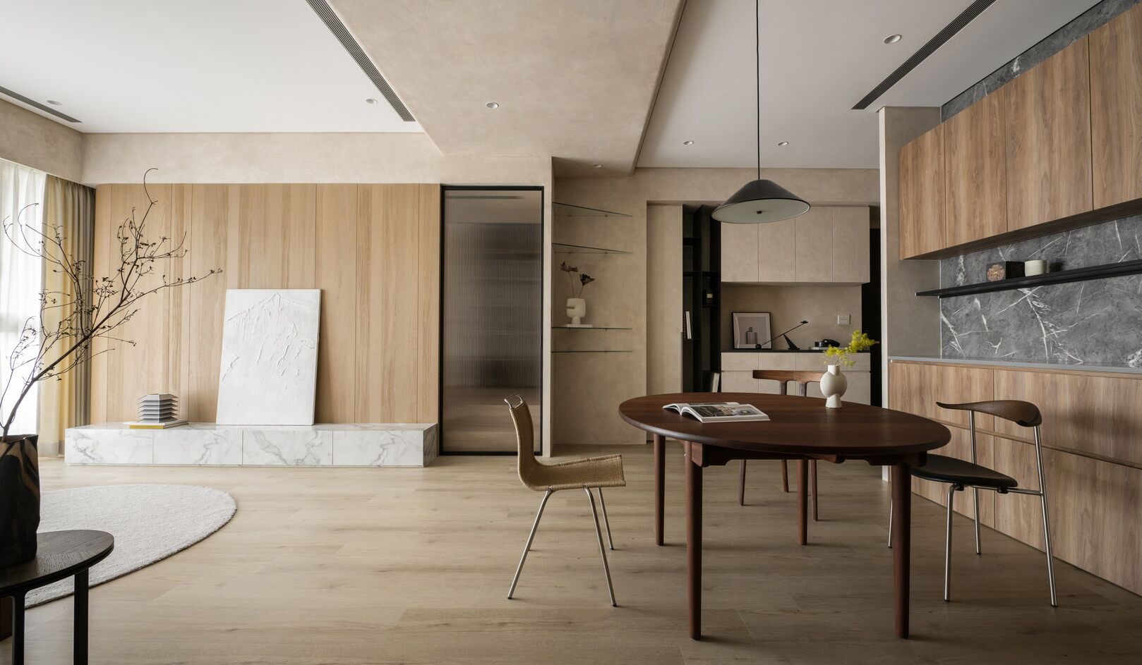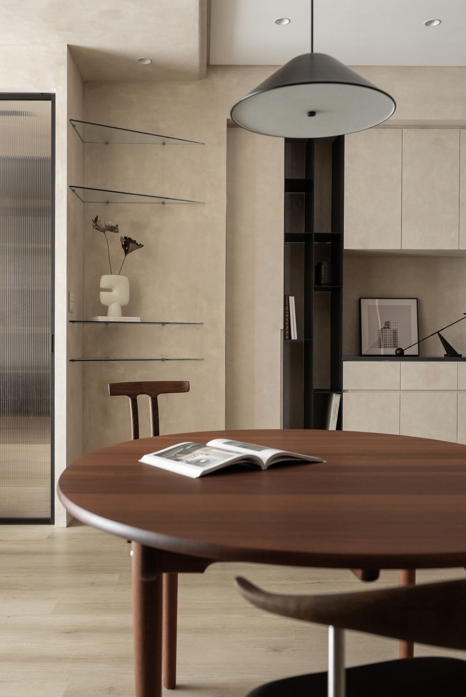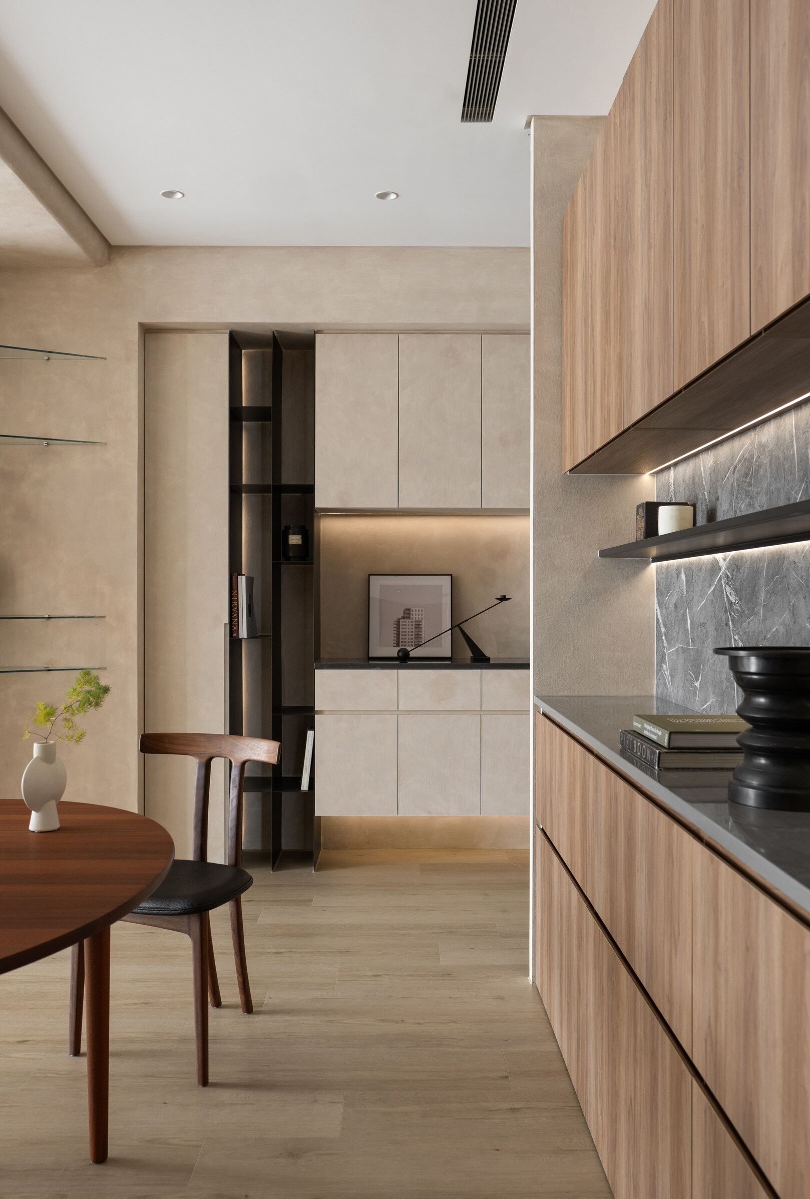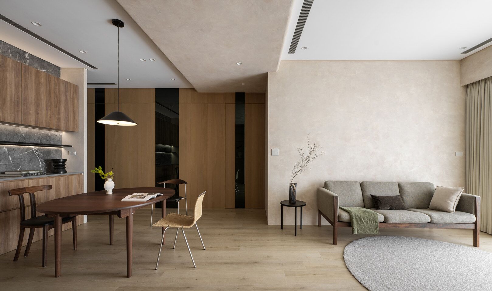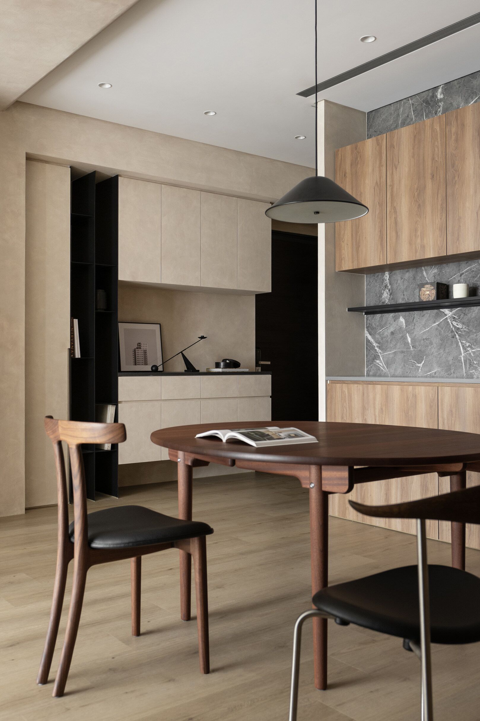 该案是为二口之家打造,夫妻二人偏爱原木经典风格,同时女主人比较喜欢北欧的时尚简约感,最终确定的装修风格将两者进行一个结合,呈现出北欧原木的温馨氛围。这是夫妻的第一套房子,在设计师的耐心沟通与建议下,两人确定下房屋的整体风格基调,落定带有原木元素与北欧风格特色的装修色彩,打造出一个温暖又时尚的避风港,为他们的生活增添更美好的享受空间,凸显专属于夫妻二人的独特气质。 户型图 ①空间原始结构为三室两厅一厨一卫,房型方正,房间的独立与隐蔽性极佳。 ②南北朝向,自然采光充足,空间视野好。 ③客厅与餐厅相邻,动线流畅,增强室内的通透感。 ④主卧自带一个衣帽间,收纳空间充裕,功能齐全。 ⑤书房邻近主卧,动线便利,提高使用率。 玄关 进门处是一个半开放式的玄关,面向厨房,有墙面作隔挡。向右侧看,视野开阔,直达客厅。房屋整体的通透感强,充分利用采光朝向的优势。 餐厅 顺着玄关来到餐厅,是一个开放式的空间。一张原木的大餐桌摆放在中间,圆形的台面少了几分锋利与严肃,与整体的温馨氛围相呼应。一旁的墙面定制了橱柜用作餐边收纳,原木纹路样式的柜门更显质感。 餐桌选择深棕色系的纹路,在材质上偏向结实耐用的款式。在日常使用过程中不仅更加耐脏,而且外观也很显质感。上方搭配一盏简约样式的吊灯,四周搭配三把独立式的靠背餐椅,同样简约的现代款式,整体营造温馨又不失简约的时尚感。 客厅 客厅与餐厅相邻,整体共同享有开阔的视野与极佳的采光条件。地面上通铺浅咖棕色的木质地板,天花板采用局部吊顶的设计,能减少空间的密闭沉闷。 电视墙与玄关之间进行了自然的联结,中间包含一个卧室的大门,采用玻璃磨砂的门,能保证隐私性的同时,增加两个区域之间的联动性。玄关过来的过渡处,有一个墙角,设计了一个开放式的多层收纳架,透明的层板不会显得过于呆板,摆放花瓶以点缀空间,恰到好处。 一张精致小巧的双人座沙发靠墙放置,森系的选色素雅大方,中间的地板处搭配一个圆形的毛绒地毯,在氛围上更显柔和温馨。 电视墙一侧的背景板采用木质纹路的壁纸,地面上摆放长方形样式的大理石储物柜,里侧自带收纳功能的同时兼具外侧的时尚美观,还可以摆放油画、台灯这类装饰品。 厨房位于玄关前的一个独立的空间,考虑到实际大小的限制,选用最为节省空间的一字性橱柜,能为屋主提供动线使用上的便利。橱柜上设计的白色大理石台面干净又大方,下方的纯色系橱柜包含充足的收纳空间,并且内嵌洗碗机,增添屋主的生活幸福感。 卧室 主卧入门处正对着的是衣帽间的区域,在这里,我们将主卧内侧与衣帽间的部分进行分区设计,对床头的墙面进行个性化处理,纯白与原木的拼色设计更具立体层次感,同时提供摆放生活物品的台面,便利屋主的生活。 舒适的双人床靠着墙面放置,环绕式的落地窗提供极佳的视野,搭配的电动窗帘省时省力,深棕系的选色干练利落。吊顶部分采用局部吊顶的设计,中间部分保证调高的留白,四周进行原木元素的镶边,呈现上更立体多面。 书房 书房是一个独立式的休闲区,左边一侧张贴木质元素的壁纸,上下搭配上杏白色的晕染图样,减少同色系带来的单调感,右边一侧进行纯色的粉刷,更显利落大方。靠近窗户的一侧放置一张原木靠椅,其余空间做了留白,可供屋主自由搭配。 卫生间 卫生间在风格上偏向简约现代风,更显轻盈大方。原木材质的橱柜质感十足,上方搭配大理石的台面能防水防霉,独立式洗手台盆突出设计感,上方搭配双开的镜柜,增加储物空间,空间折盒度更高。墙壁上采用浅灰色瓷砖作为打底,低调不张扬。 |