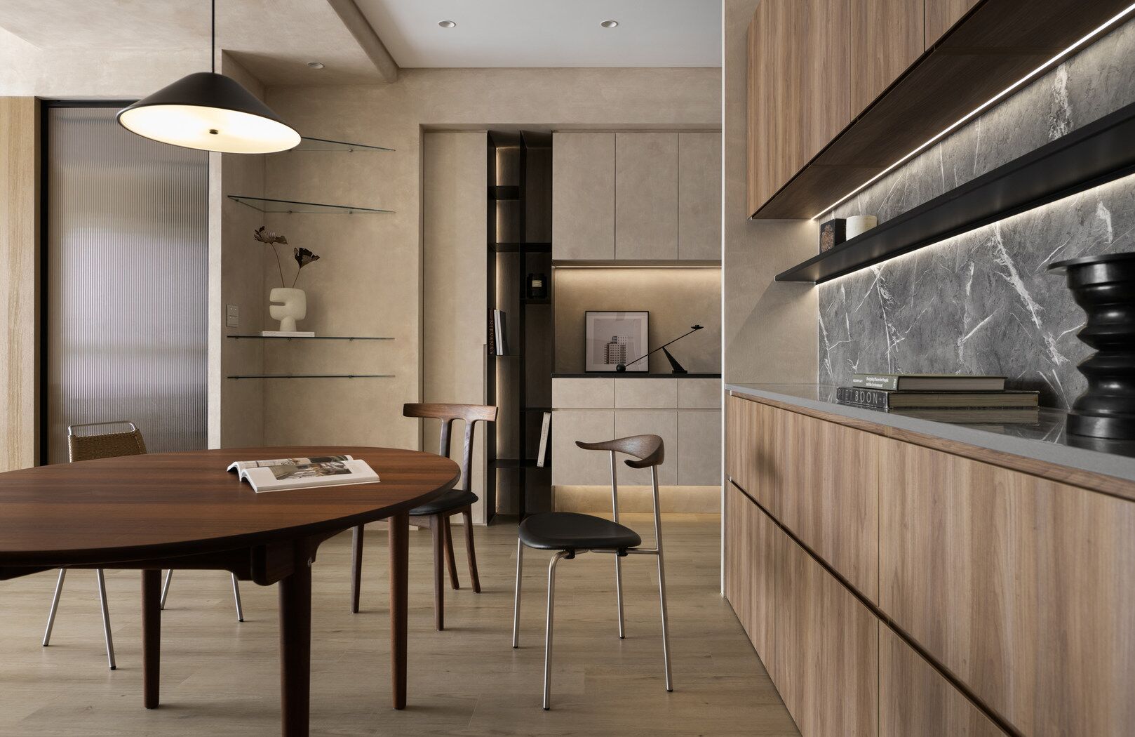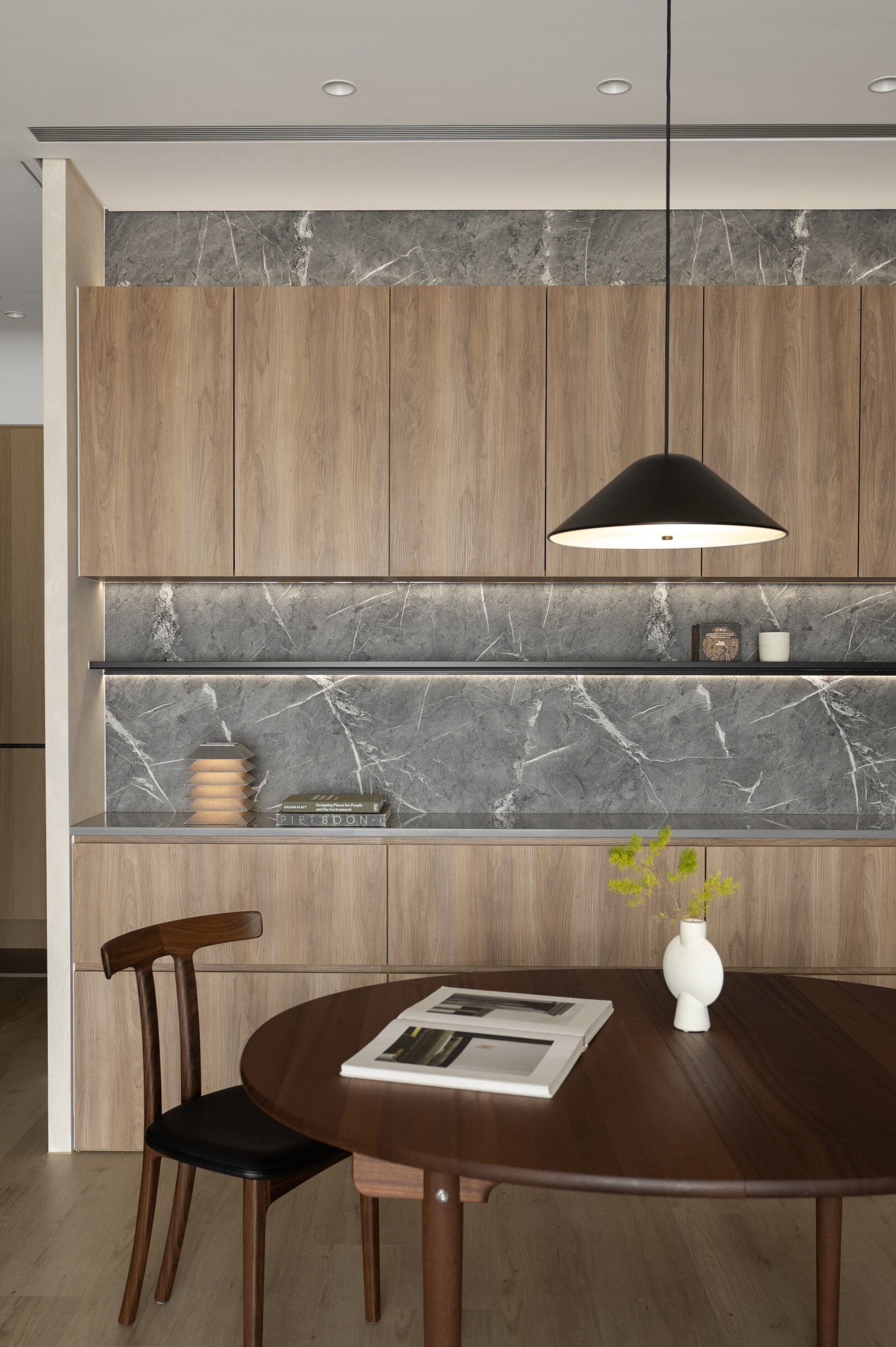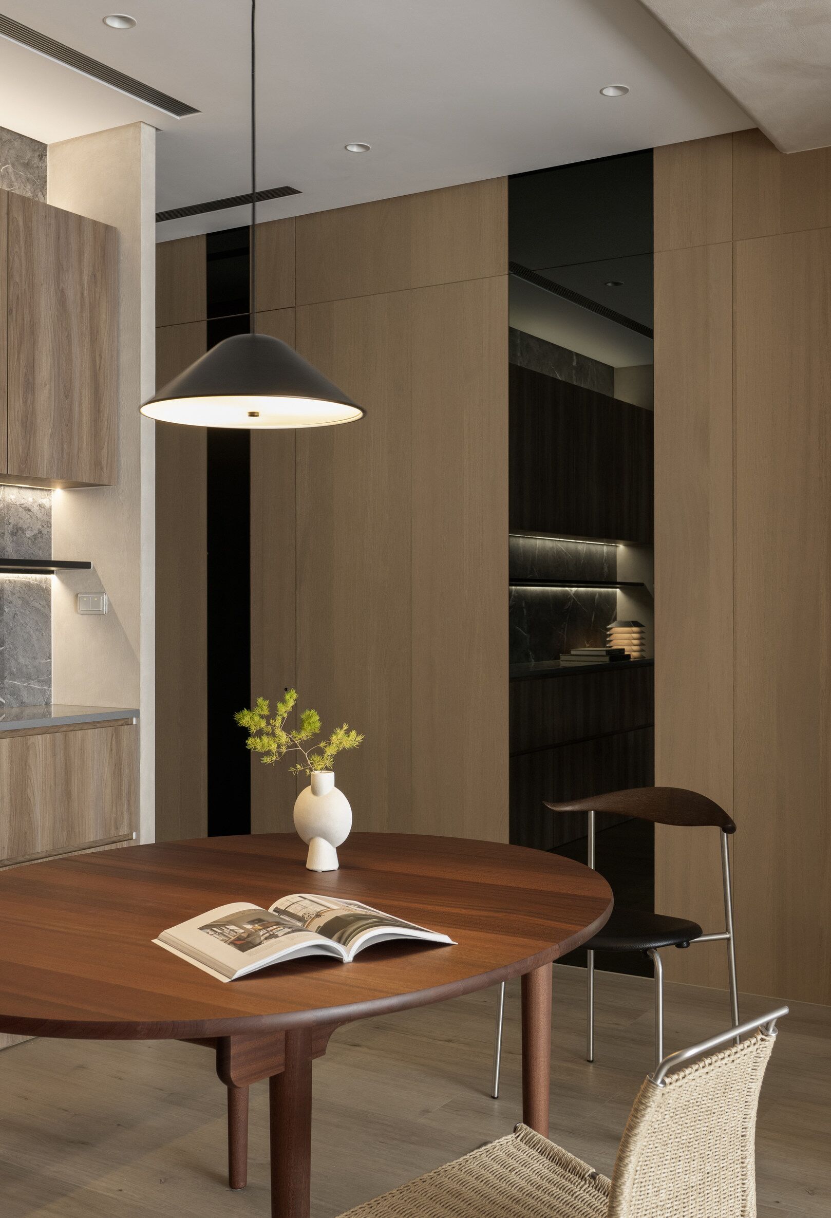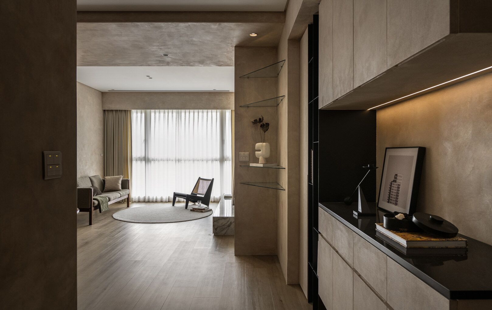 该案是为二口之家打造,夫妻二人偏爱原木经典风格,同时女主人比较喜欢北欧的时尚简约感,最终确定的装修风格将两者进行一个结合,呈现出北欧原木的温馨氛围。这是夫妻的第一套房子,在设计师的耐心沟通与建议下,两人确定下房屋的整体风格基调,落定带有原木元素与北欧风格特色的装修色彩,打造出一个温暖又时尚的避风港,为他们的生活增添更美好的享受空间,凸显专属于夫妻二人的独特气质。 户型图 ①空间原始结构为三室两厅一厨一卫,房型方正,房间的独立与隐蔽性极佳。 ②南北朝向,自然采光充足,空间视野好。 ③客厅与餐厅相邻,动线流畅,增强室内的通透感。 ④主卧自带一个衣帽间,收纳空间充裕,功能齐全。 ⑤书房邻近主卧,动线便利,提高使用率。 玄关 进门处是一个半开放式的玄关,面向厨房,有墙面作隔挡。向右侧看,视野开阔,直达客厅。房屋整体的通透感强,充分利用采光朝向的优势。 餐厅 顺着玄关来到餐厅,是一个开放式的空间。一张原木的大餐桌摆放在中间,圆形的台面少了几分锋利与严肃,与整体的温馨氛围相呼应。一旁的墙面定制了橱柜用作餐边收纳,原木纹路样式的柜门更显质感。 餐桌选择深棕色系的纹路,在材质上偏向结实耐用的款式。在日常使用过程中不仅更加耐脏,而且外观也很显质感。上方搭配一盏简约样式的吊灯,四周搭配三把独立式的靠背餐椅,同样简约的现代款式,整体营造温馨又不失简约的时尚感。 客厅 客厅与餐厅相邻,整体共同享有开阔的视野与极佳的采光条件。地面上通铺浅咖棕色的木质地板,天花板采用局部吊顶的设计,能减少空间的密闭沉闷。 电视墙与玄关之间进行了自然的联结,中间包含一个卧室的大门,采用玻璃磨砂的门,能保证隐私性的同时,增加两个区域之间的联动性。玄关过来的过渡处,有一个墙角,设计了一个开放式的多层收纳架,透明的层板不会显得过于呆板,摆放花瓶以点缀空间,恰到好处。 一张精致小巧的双人座沙发靠墙放置,森系的选色素雅大方,中间的地板处搭配一个圆形的毛绒地毯,在氛围上更显柔和温馨。 电视墙一侧的背景板采用木质纹路的壁纸,地面上摆放长方形样式的大理石储物柜,里侧自带收纳功能的同时兼具外侧的时尚美观,还可以摆放油画、台灯这类装饰品。 厨房位于玄关前的一个独立的空间,考虑到实际大小的限制,选用最为节省空间的一字性橱柜,能为屋主提供动线使用上的便利。橱柜上设计的白色大理石台面干净又大方,下方的纯色系橱柜包含充足的收纳空间,并且内嵌洗碗机,增添屋主的生活幸福感。 卧室 主卧入门处正对着的是衣帽间的区域,在这里,我们将主卧内侧与衣帽间的部分进行分区设计,对床头的墙面进行个性化处理,纯白与原木的拼色设计更具立体层次感,同时提供摆放生活物品的台面,便利屋主的生活。 舒适的双人床靠着墙面放置,环绕式的落地窗提供极佳的视野,搭配的电动窗帘省时省力,深棕系的选色干练利落。吊顶部分采用局部吊顶的设计,中间部分保证调高的留白,四周进行原木元素的镶边,呈现上更立体多面。 书房 书房是一个独立式的休闲区,左边一侧张贴木质元素的壁纸,上下搭配上杏白色的晕染图样,减少同色系带来的单调感,右边一侧进行纯色的粉刷,更显利落大方。靠近窗户的一侧放置一张原木靠椅,其余空间做了留白,可供屋主自由搭配。 卫生间 卫生间在风格上偏向简约现代风,更显轻盈大方。原木材质的橱柜质感十足,上方搭配大理石的台面能防水防霉,独立式洗手台盆突出设计感,上方搭配双开的镜柜,增加储物空间,空间折盒度更高。墙壁上采用浅灰色瓷砖作为打底,低调不张扬。 |