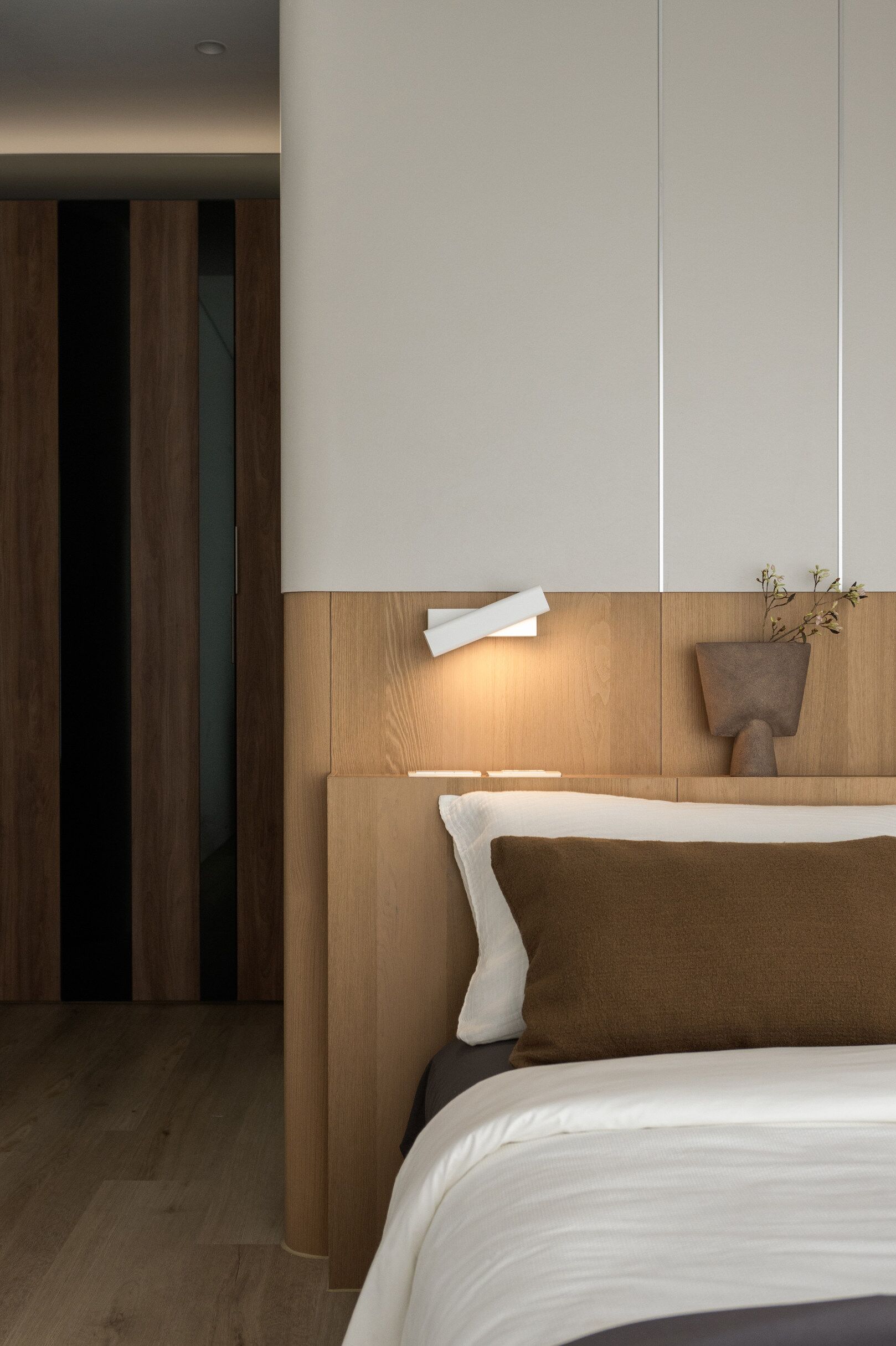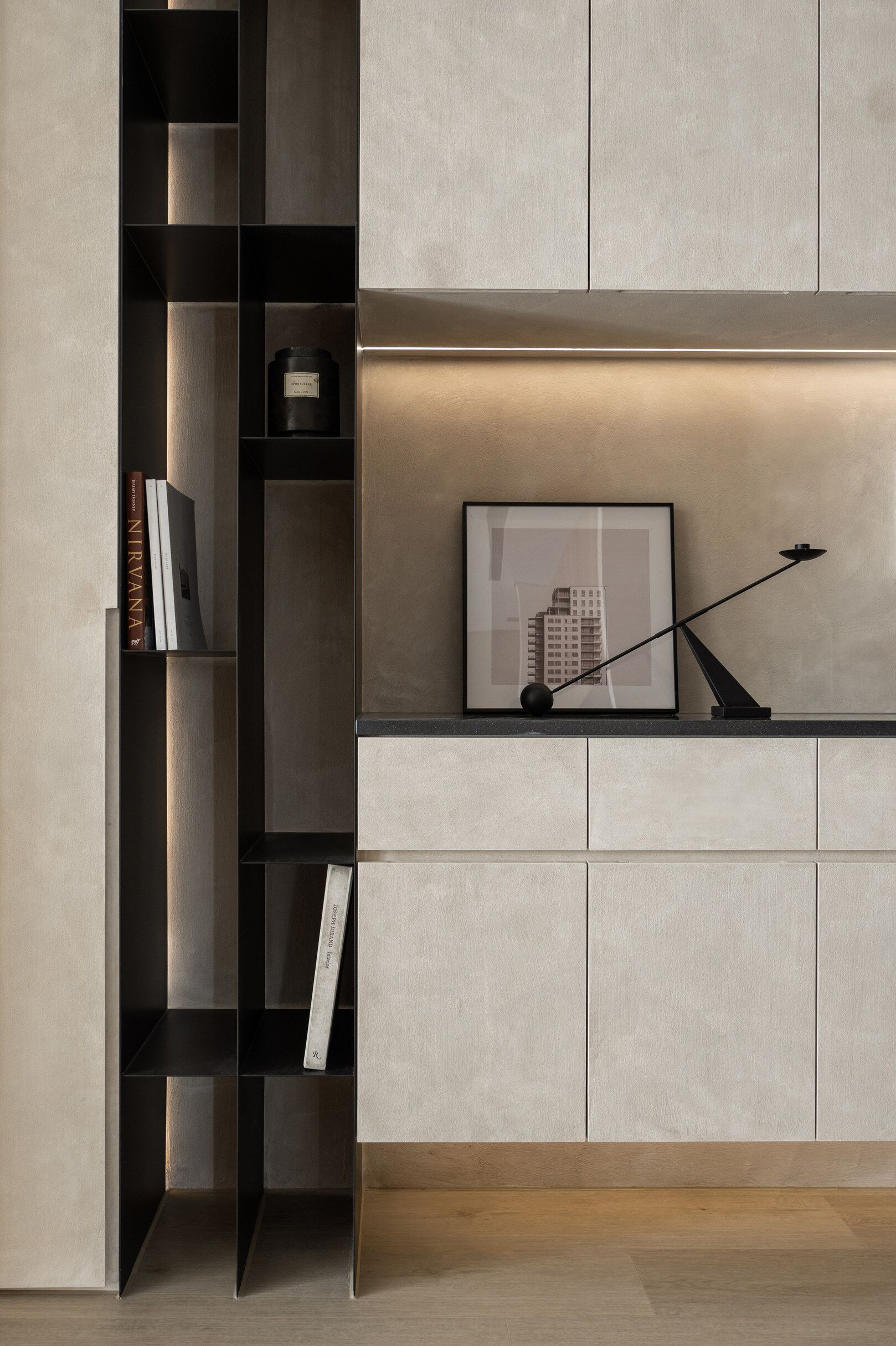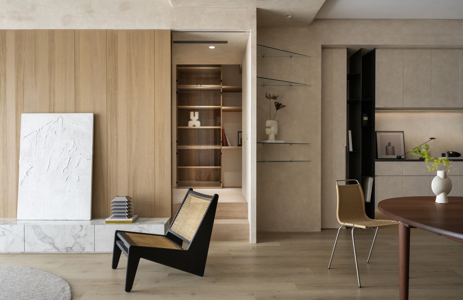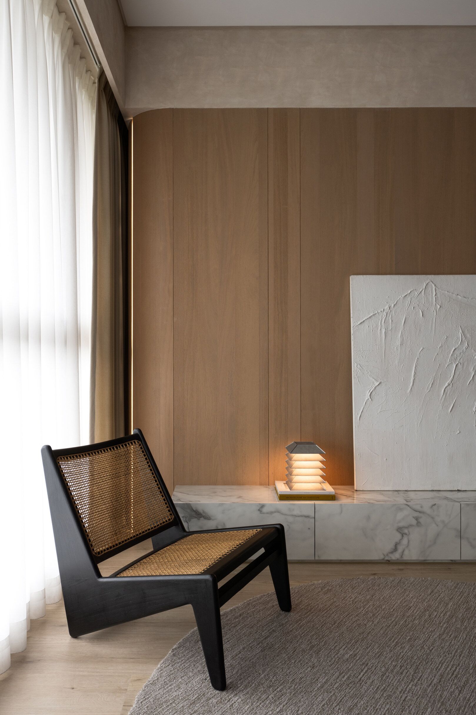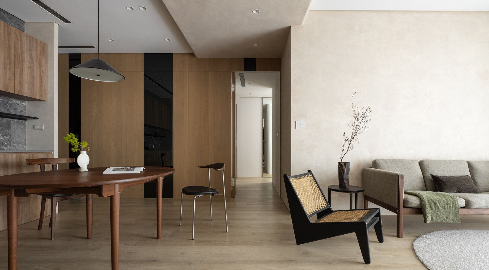 该案是为二口之家打造,夫妻二人偏爱原木经典风格,同时女主人比较喜欢北欧的时尚简约感,最终确定的装修风格将两者进行一个结合,呈现出北欧原木的温馨氛围。这是夫妻的第一套房子,在设计师的耐心沟通与建议下,两人确定下房屋的整体风格基调,落定带有原木元素与北欧风格特色的装修色彩,打造出一个温暖又时尚的避风港,为他们的生活增添更美好的享受空间,凸显专属于夫妻二人的独特气质。 户型图 ①空间原始结构为三室两厅一厨一卫,房型方正,房间的独立与隐蔽性极佳。 ②南北朝向,自然采光充足,空间视野好。 ③客厅与餐厅相邻,动线流畅,增强室内的通透感。 ④主卧自带一个衣帽间,收纳空间充裕,功能齐全。 ⑤书房邻近主卧,动线便利,提高使用率。 玄关 进门处是一个半开放式的玄关,面向厨房,有墙面作隔挡。向右侧看,视野开阔,直达客厅。房屋整体的通透感强,充分利用采光朝向的优势。 餐厅 顺着玄关来到餐厅,是一个开放式的空间。一张原木的大餐桌摆放在中间,圆形的台面少了几分锋利与严肃,与整体的温馨氛围相呼应。一旁的墙面定制了橱柜用作餐边收纳,原木纹路样式的柜门更显质感。 餐桌选择深棕色系的纹路,在材质上偏向结实耐用的款式。在日常使用过程中不仅更加耐脏,而且外观也很显质感。上方搭配一盏简约样式的吊灯,四周搭配三把独立式的靠背餐椅,同样简约的现代款式,整体营造温馨又不失简约的时尚感。 客厅 客厅与餐厅相邻,整体共同享有开阔的视野与极佳的采光条件。地面上通铺浅咖棕色的木质地板,天花板采用局部吊顶的设计,能减少空间的密闭沉闷。 电视墙与玄关之间进行了自然的联结,中间包含一个卧室的大门,采用玻璃磨砂的门,能保证隐私性的同时,增加两个区域之间的联动性。玄关过来的过渡处,有一个墙角,设计了一个开放式的多层收纳架,透明的层板不会显得过于呆板,摆放花瓶以点缀空间,恰到好处。 一张精致小巧的双人座沙发靠墙放置,森系的选色素雅大方,中间的地板处搭配一个圆形的毛绒地毯,在氛围上更显柔和温馨。 电视墙一侧的背景板采用木质纹路的壁纸,地面上摆放长方形样式的大理石储物柜,里侧自带收纳功能的同时兼具外侧的时尚美观,还可以摆放油画、台灯这类装饰品。 厨房位于玄关前的一个独立的空间,考虑到实际大小的限制,选用最为节省空间的一字性橱柜,能为屋主提供动线使用上的便利。橱柜上设计的白色大理石台面干净又大方,下方的纯色系橱柜包含充足的收纳空间,并且内嵌洗碗机,增添屋主的生活幸福感。 卧室 主卧入门处正对着的是衣帽间的区域,在这里,我们将主卧内侧与衣帽间的部分进行分区设计,对床头的墙面进行个性化处理,纯白与原木的拼色设计更具立体层次感,同时提供摆放生活物品的台面,便利屋主的生活。 舒适的双人床靠着墙面放置,环绕式的落地窗提供极佳的视野,搭配的电动窗帘省时省力,深棕系的选色干练利落。吊顶部分采用局部吊顶的设计,中间部分保证调高的留白,四周进行原木元素的镶边,呈现上更立体多面。 书房 书房是一个独立式的休闲区,左边一侧张贴木质元素的壁纸,上下搭配上杏白色的晕染图样,减少同色系带来的单调感,右边一侧进行纯色的粉刷,更显利落大方。靠近窗户的一侧放置一张原木靠椅,其余空间做了留白,可供屋主自由搭配。 卫生间 卫生间在风格上偏向简约现代风,更显轻盈大方。原木材质的橱柜质感十足,上方搭配大理石的台面能防水防霉,独立式洗手台盆突出设计感,上方搭配双开的镜柜,增加储物空间,空间折盒度更高。墙壁上采用浅灰色瓷砖作为打底,低调不张扬。 |