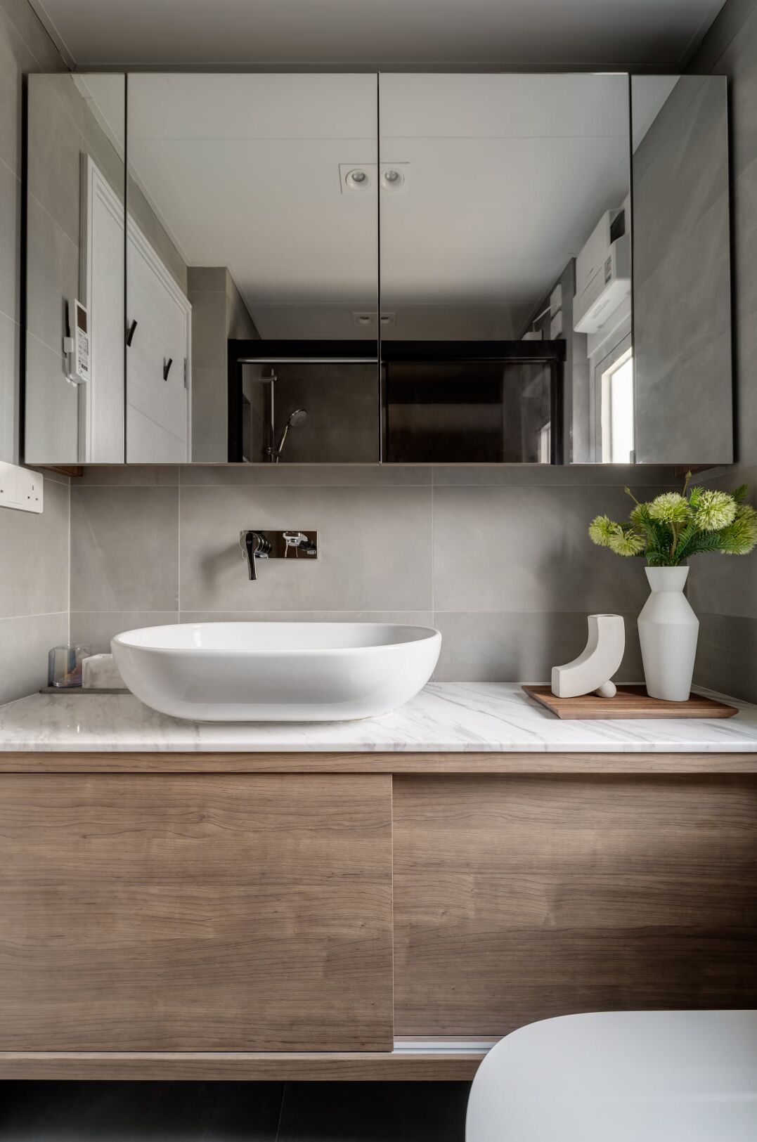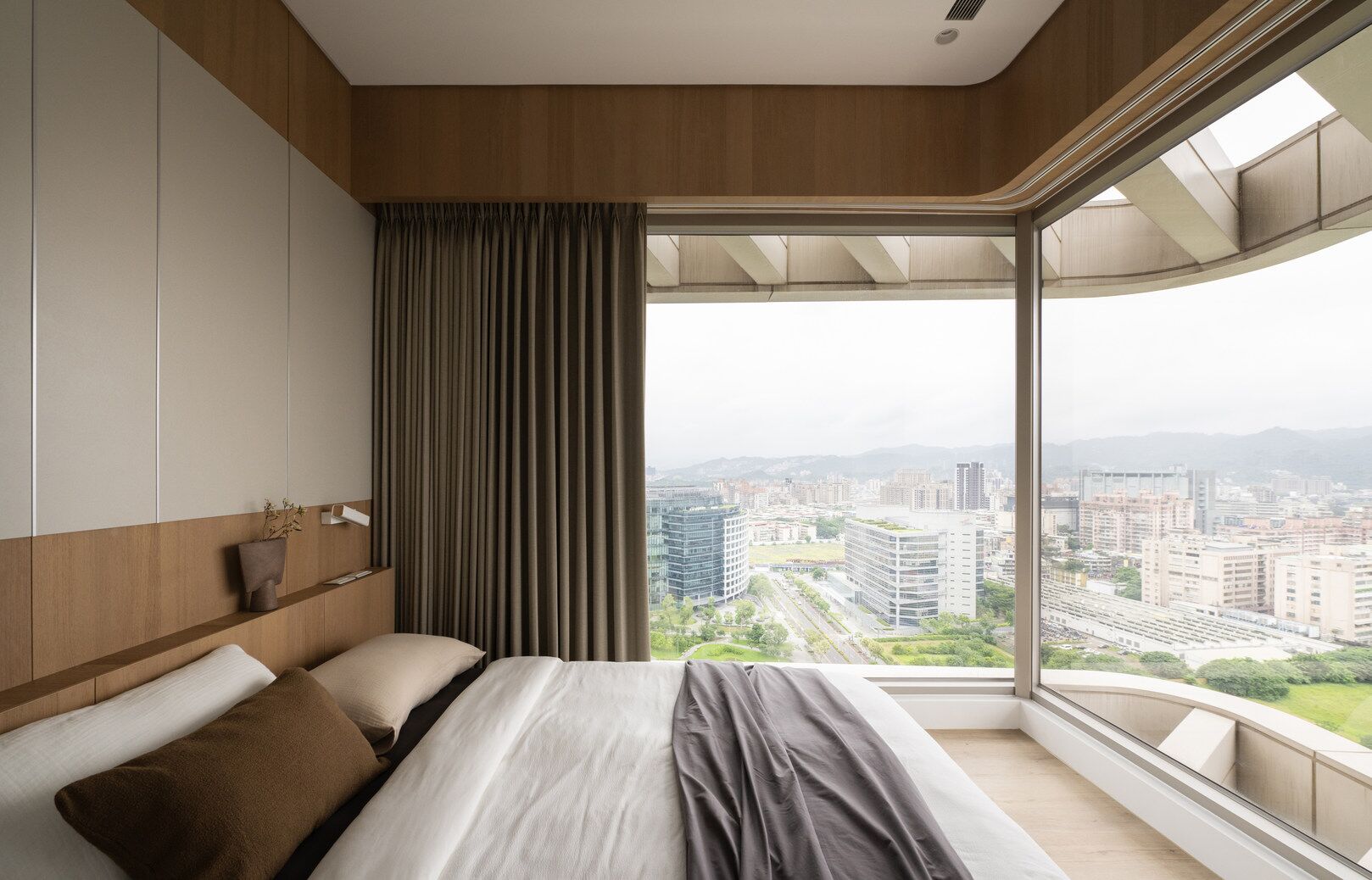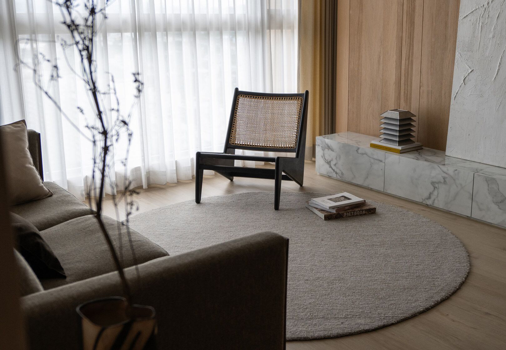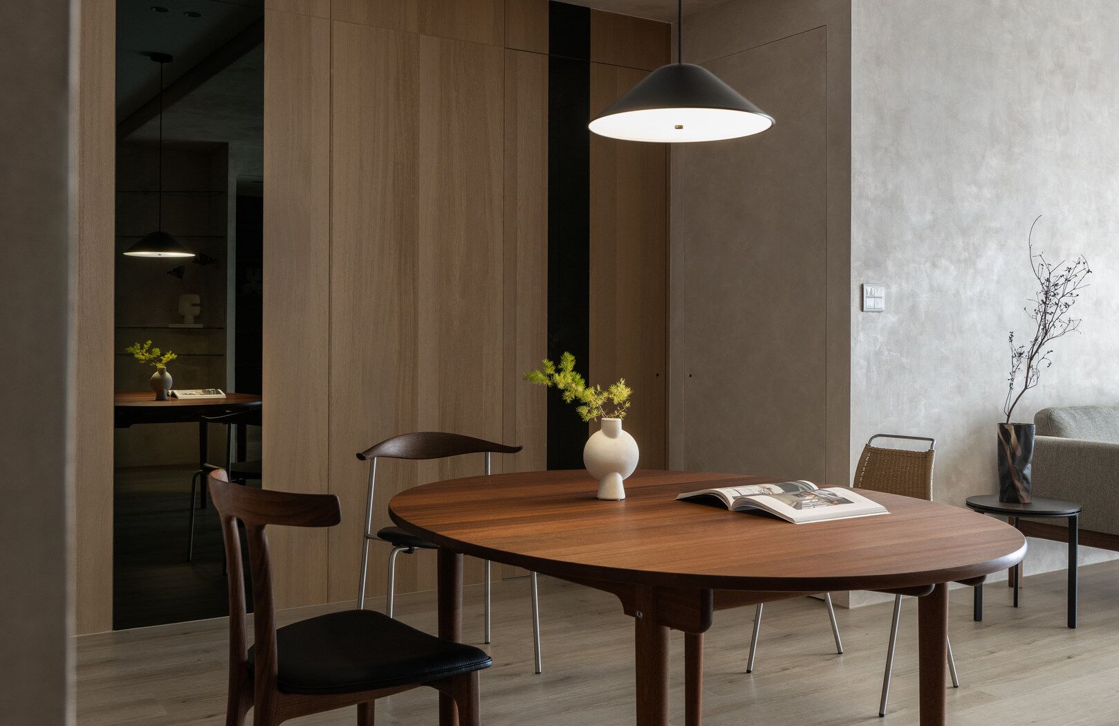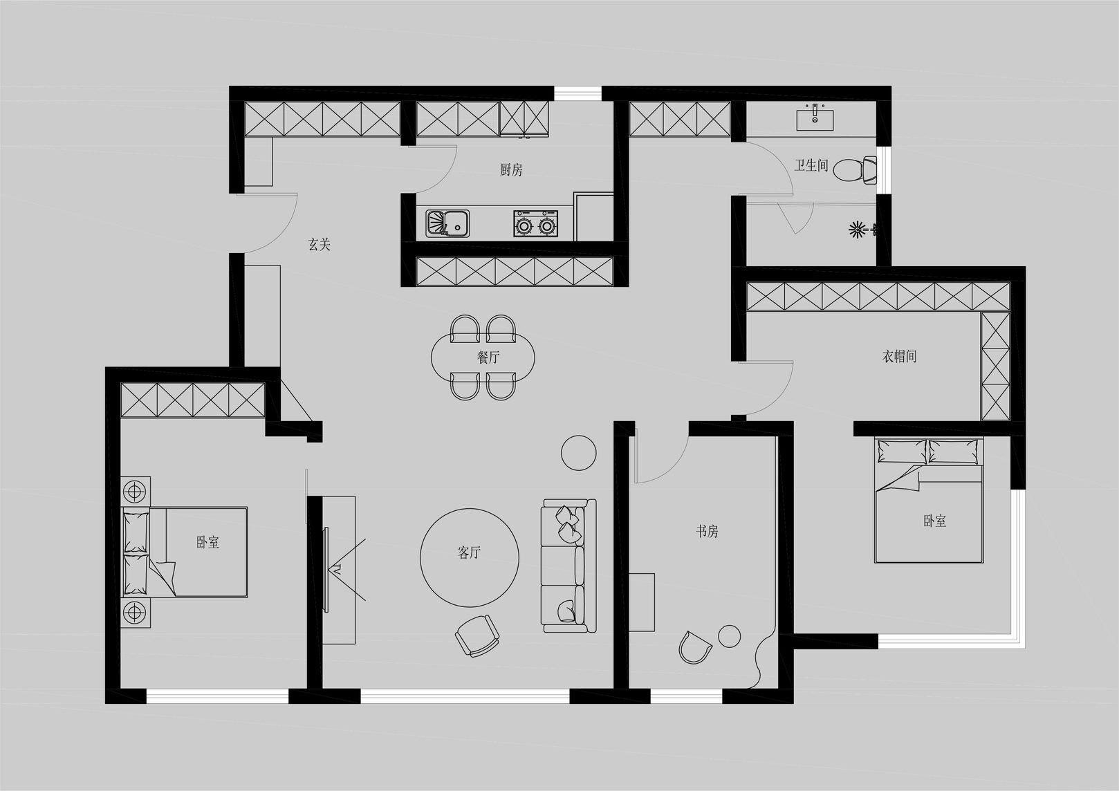 该案是为二口之家打造,夫妻二人偏爱原木经典风格,同时女主人比较喜欢北欧的时尚简约感,最终确定的装修风格将两者进行一个结合,呈现出北欧原木的温馨氛围。这是夫妻的第一套房子,在设计师的耐心沟通与建议下,两人确定下房屋的整体风格基调,落定带有原木元素与北欧风格特色的装修色彩,打造出一个温暖又时尚的避风港,为他们的生活增添更美好的享受空间,凸显专属于夫妻二人的独特气质。 户型图 ①空间原始结构为三室两厅一厨一卫,房型方正,房间的独立与隐蔽性极佳。 ②南北朝向,自然采光充足,空间视野好。 ③客厅与餐厅相邻,动线流畅,增强室内的通透感。 ④主卧自带一个衣帽间,收纳空间充裕,功能齐全。 ⑤书房邻近主卧,动线便利,提高使用率。 玄关 进门处是一个半开放式的玄关,面向厨房,有墙面作隔挡。向右侧看,视野开阔,直达客厅。房屋整体的通透感强,充分利用采光朝向的优势。 餐厅 顺着玄关来到餐厅,是一个开放式的空间。一张原木的大餐桌摆放在中间,圆形的台面少了几分锋利与严肃,与整体的温馨氛围相呼应。一旁的墙面定制了橱柜用作餐边收纳,原木纹路样式的柜门更显质感。 餐桌选择深棕色系的纹路,在材质上偏向结实耐用的款式。在日常使用过程中不仅更加耐脏,而且外观也很显质感。上方搭配一盏简约样式的吊灯,四周搭配三把独立式的靠背餐椅,同样简约的现代款式,整体营造温馨又不失简约的时尚感。 客厅 客厅与餐厅相邻,整体共同享有开阔的视野与极佳的采光条件。地面上通铺浅咖棕色的木质地板,天花板采用局部吊顶的设计,能减少空间的密闭沉闷。 电视墙与玄关之间进行了自然的联结,中间包含一个卧室的大门,采用玻璃磨砂的门,能保证隐私性的同时,增加两个区域之间的联动性。玄关过来的过渡处,有一个墙角,设计了一个开放式的多层收纳架,透明的层板不会显得过于呆板,摆放花瓶以点缀空间,恰到好处。 一张精致小巧的双人座沙发靠墙放置,森系的选色素雅大方,中间的地板处搭配一个圆形的毛绒地毯,在氛围上更显柔和温馨。 电视墙一侧的背景板采用木质纹路的壁纸,地面上摆放长方形样式的大理石储物柜,里侧自带收纳功能的同时兼具外侧的时尚美观,还可以摆放油画、台灯这类装饰品。 厨房位于玄关前的一个独立的空间,考虑到实际大小的限制,选用最为节省空间的一字性橱柜,能为屋主提供动线使用上的便利。橱柜上设计的白色大理石台面干净又大方,下方的纯色系橱柜包含充足的收纳空间,并且内嵌洗碗机,增添屋主的生活幸福感。 卧室 主卧入门处正对着的是衣帽间的区域,在这里,我们将主卧内侧与衣帽间的部分进行分区设计,对床头的墙面进行个性化处理,纯白与原木的拼色设计更具立体层次感,同时提供摆放生活物品的台面,便利屋主的生活。 舒适的双人床靠着墙面放置,环绕式的落地窗提供极佳的视野,搭配的电动窗帘省时省力,深棕系的选色干练利落。吊顶部分采用局部吊顶的设计,中间部分保证调高的留白,四周进行原木元素的镶边,呈现上更立体多面。 书房 书房是一个独立式的休闲区,左边一侧张贴木质元素的壁纸,上下搭配上杏白色的晕染图样,减少同色系带来的单调感,右边一侧进行纯色的粉刷,更显利落大方。靠近窗户的一侧放置一张原木靠椅,其余空间做了留白,可供屋主自由搭配。 卫生间 卫生间在风格上偏向简约现代风,更显轻盈大方。原木材质的橱柜质感十足,上方搭配大理石的台面能防水防霉,独立式洗手台盆突出设计感,上方搭配双开的镜柜,增加储物空间,空间折盒度更高。墙壁上采用浅灰色瓷砖作为打底,低调不张扬。 |