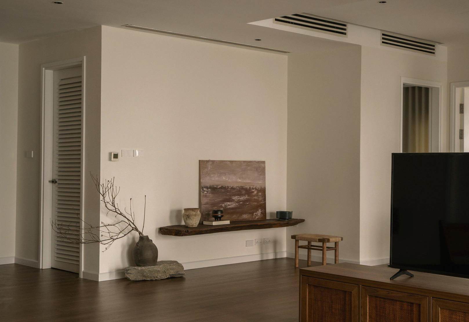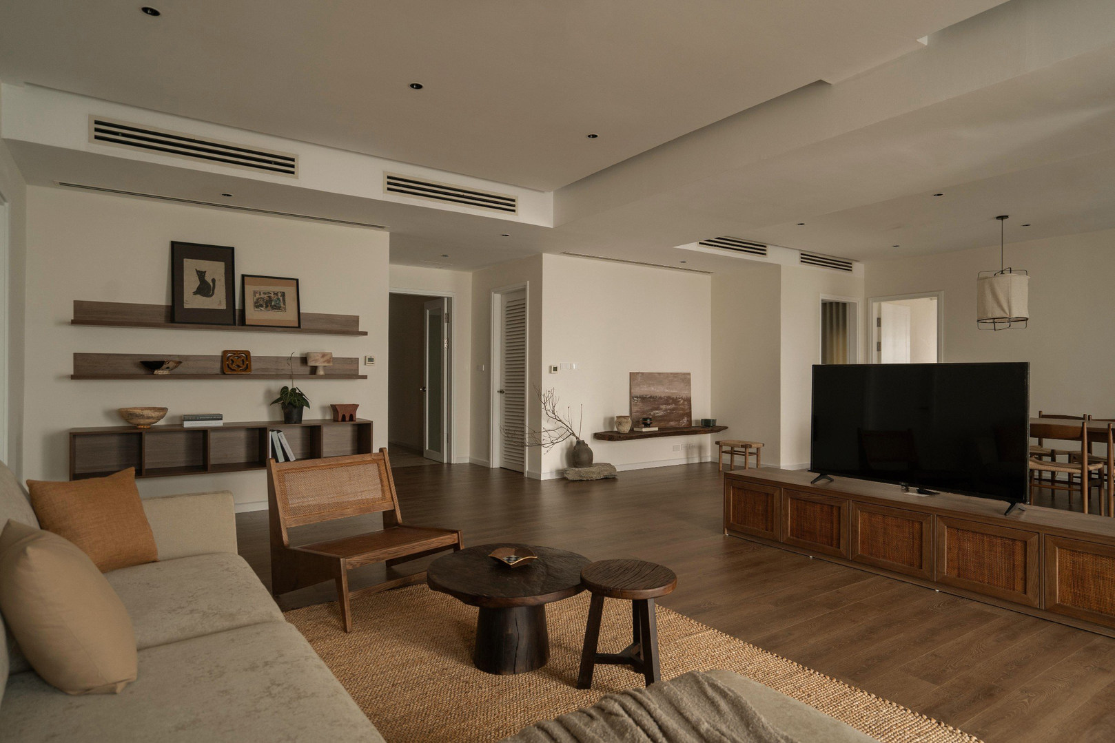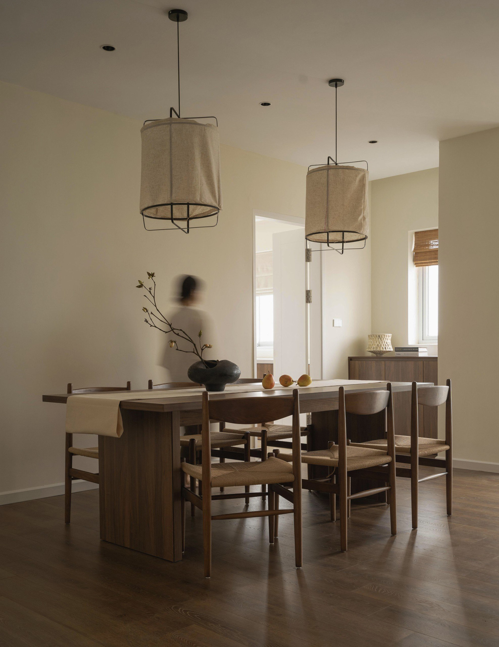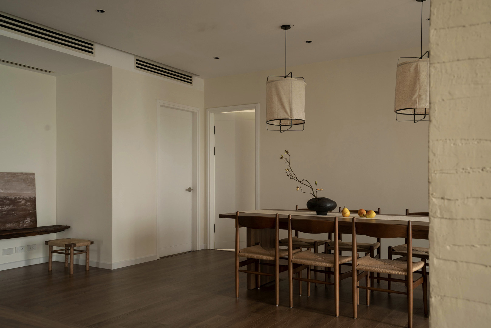 以“大自然”为灵感超越了室内色调的原木色调,展现大自然上宁静与动感、混乱与秩序、情感与理性的和谐共存。本期案例的主人是一家三口,女主人作为新时代女性,有着独特的见解,对一家三口在偌大城市中为他们搭建的独属之地有着明确的喜好与想法。在初次见面时就明确表示喜欢原木风格的宁静与温暖,对于新家的氛围温馨的同时加入一丝禅意的气韵来丰富整个居住空间。这一丝禅意也与居者追求内心丰盈的愿景不谋而合。在设计上屋主希望拥有高度开阔开放的空间,所以我们将公区功能高度整合客餐一体+封闭式中厨构筑洄游式动线。我们希望让家拥有更多的随性与洒脱。 户型图 1.整合主卧布局,拆除衣帽间,释放空间面积。改变原始动线,将卫生间安置于最里侧更加便捷。 2.于餐厅邻窗处新建地柜,提高空间使用率。 3.卫生间未做传统干湿分离,一体式的设计方便多人使用。 4.独立厨房,扩充操作台面,将原始内部设备区域更换位置。 客厅 客厅原木地板顺延贯穿,统一协调公区视觉关系。根据屋主爱好,选择去繁就简,还原空间最纯粹的体验感。简单吊顶搭配无主灯设计,干净利落的线条框架进一步延申空间深邃感。公区选用叠构设计手法,丰富立面层次感。 #客厅#原木地板#无主灯 柔软舒适的布艺沙发贴墙而放,搭配原木单人椅围合布局,简单的造型勾勒出自然惬意的休闲空间。亚麻编织地毯聚焦会客中心,黑色圆形茶几设计感满满,矮样式有效的纵向拉高层高,冷暖色系有序地交织。客厅区域更显雅致。 #客厅#沙发#茶几 考虑到家中需要更多储物空间才能保证日常空间的整洁、美观度。利用沙发后方原始空白墙体定制开放展示区,可放置屋主喜爱的不同类别的,大小件收藏品。沙发左侧因地制宜摆放原木柜,定制飘窗打破空间封闭感,将室内外光景衔接。 #客厅#收纳 局部优化细节,将原木置物板悬挂于墙面进行简化,干净利落的线条框架让艺术感得到进一步延申。利用原始石块及其树枝,获取大自然的元素,应和为不同装饰部分,但却统一和谐的整体。装饰画得到地方安置的同时也成为空间中独一无二的趣味装饰。 #客厅#置物板 餐厅 餐厅位于电视后方,除了采用开放式结构以营造流动的空间感,我们还巧妙地在空间疏密之间找到了平衡电视区域背景墙拆除,打破隔断,整个公区完全开放,采用了双动线,极大地延长了家庭成员在此区域的停留时间。 #餐厅 柔和浅淡的原木色为空间基调,展现出温馨优雅的氛围气质。简洁的硬装线条,给予软装陈设最大化的包容力度。考虑到屋主偶尔办公、亲子需求,选择多人位长方形餐桌,比石材触感更温润的橡木材质,保留住硬木的天然形态,为空间提升自然、细腻的日常之美。 #餐厅#餐桌#原木 以空间便携动线和多元使用功能为设计要点,将餐厅放置在中央,餐椅环绕式布局,串联起前后客厅,左右厨房,营造流动,自由,交互的全新秩序。餐桌顶部悬挂着两盏日式样式的吊灯,暖黄色的灯光增添温馨色彩。前方沿着墙面打造了一排原木色的地柜,增加收纳的空间。 #餐厅#餐桌#吊灯 厨房 中厨空间采用双一字型布局,搭配原木地柜与肤感白大理石台面,既彰显自然韵味,又不失现代简约格调。内置高品质五金件与实用电器,确保了厨房功能的全面与高效。充足的储物空间,加上符合操作者身高的高低台设计,共同营造出一个既舒适又便捷的烹饪环境,完美融合了美观与实用性。 #厨房 厨房留有原始透光窗户,避免视觉碎片化,用材质延续的手法将其包裹,呈现更聚焦,统一的界面感受。橱柜选择深色系更显稳重大方,清洗区与燃气灶相对而置,台面上可以放置小家电,使用的储物空间和操作台,动线上兼顾屋主的使用习惯。 #厨房#橱柜 卧室 方形飘窗保障卧室采光与通风,空间大面积延续外部色调,局部白色艺术漆与原木进行分色呈现。考虑到房间需要一种更舒适、纯粹的入睡氛围,在挑选床品时放弃了成品的样式,选择与空间更匹配、素净的色调进行定制,表达出更温暖、更柔和的美好日常。 #卧室#原木 卫生间 卫生间通铺肌理丰富的大理石瓷砖,搭配结构精致的一体盆,见光不见影的灯带点缀氛围感,自然流动的光影,将其转变为美好事物的载体,烘托出相对私密高级感的同时,营造出丰盈、优雅的空间美学。通过细节的比例、材质的搭配关系,让屋主在日常使用时,获得惬意放松的空间情绪。 #卫生间 |